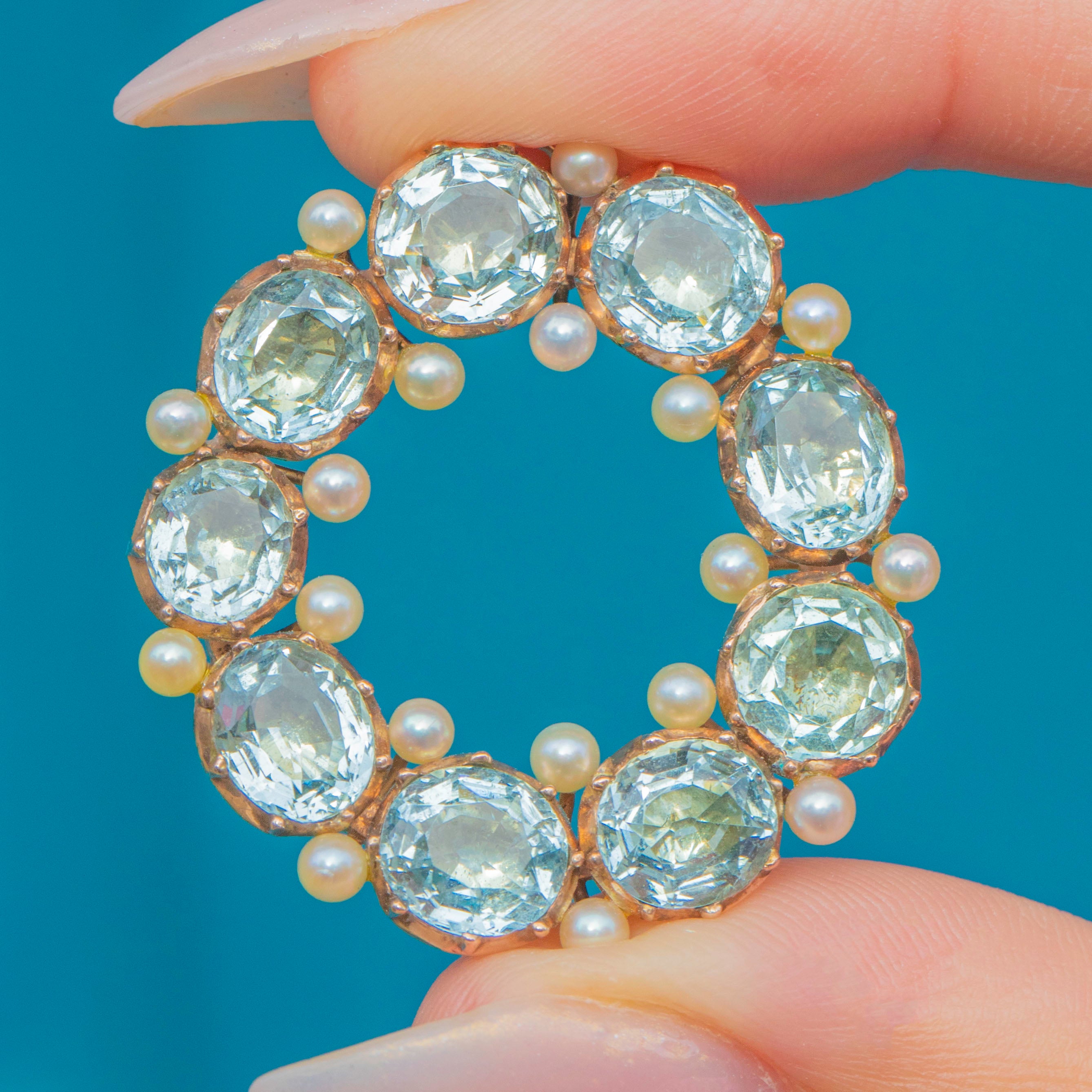 This petite yet elegant design exemplifies the refined craftsmanship of the early 19th century, with the soft blue of the Aquamarine beautifully complemented by the gentle lustre of the Pearls. A perfect example of Georgian elegance and wearable history.