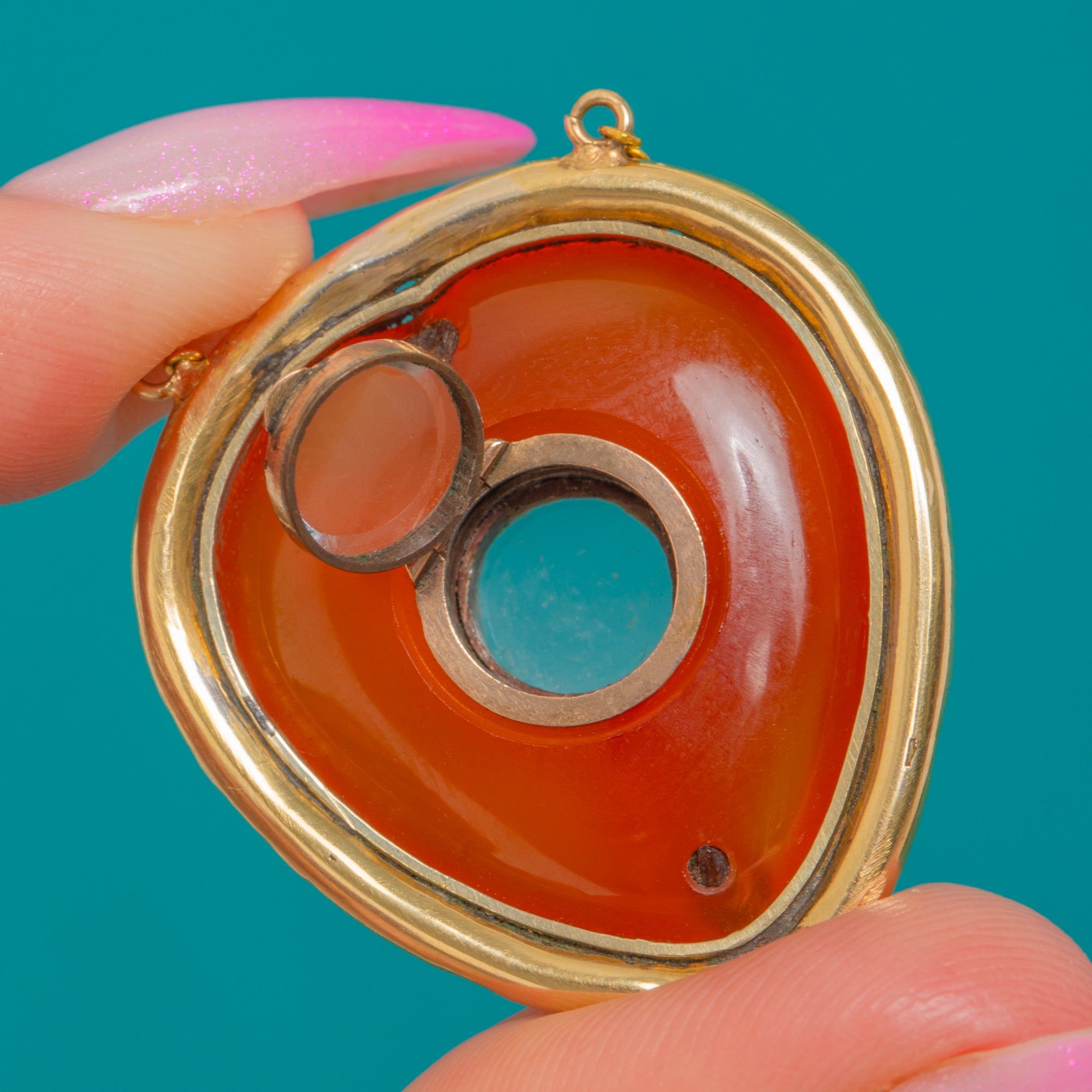 EXCELLENT: The Carnelian presents beautifully with a glossy polish and only the most minimal surface wear visible under magnification. The Gold settings are crisp and secure with light, age-appropriate wear to high points. Overall, this locket has been very well cared for and wears confidently.