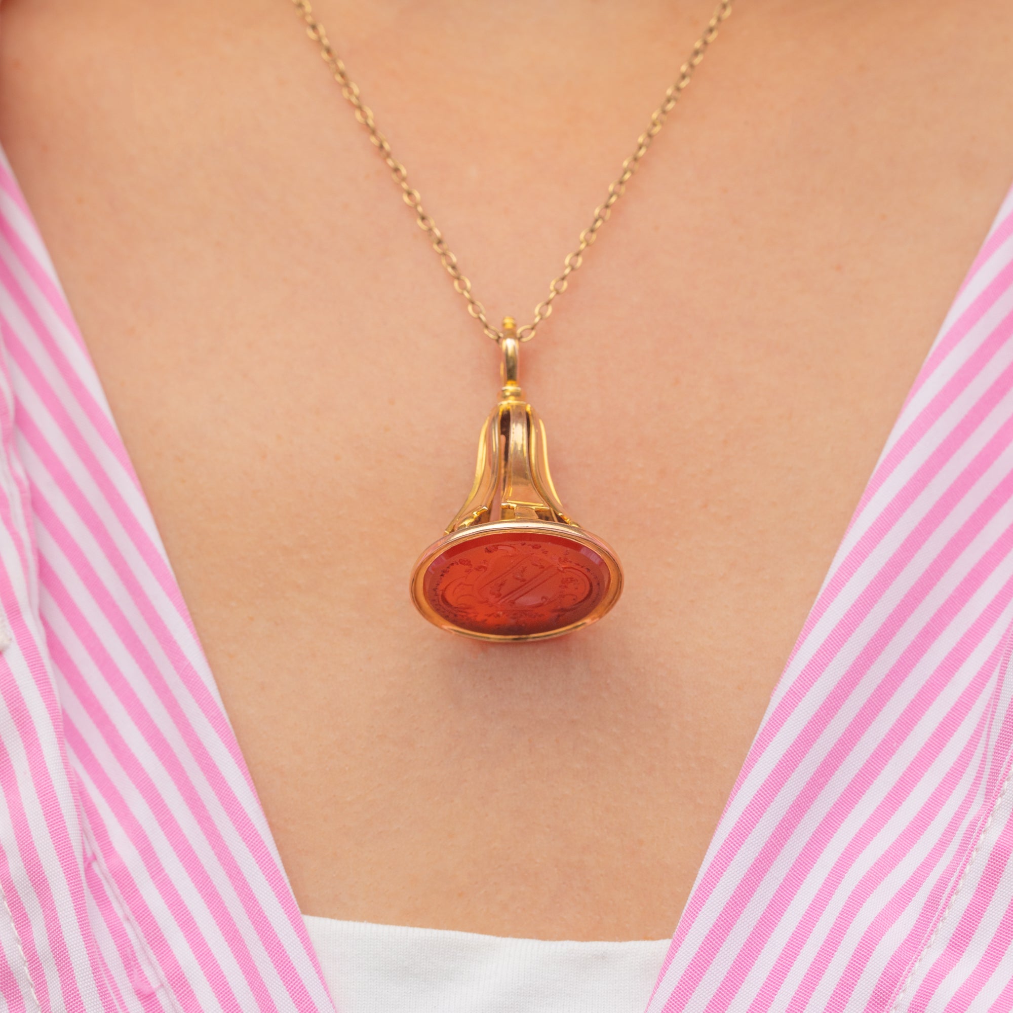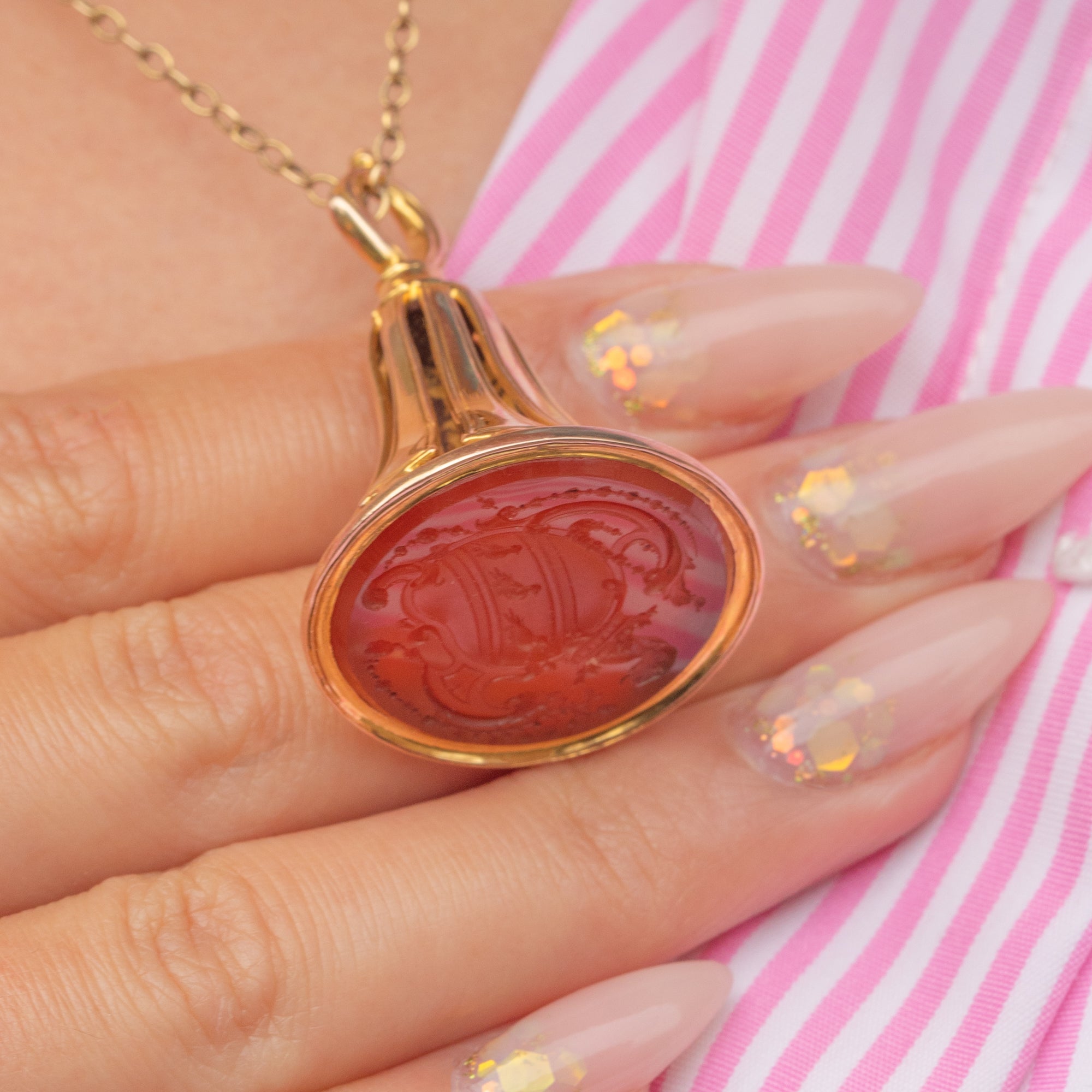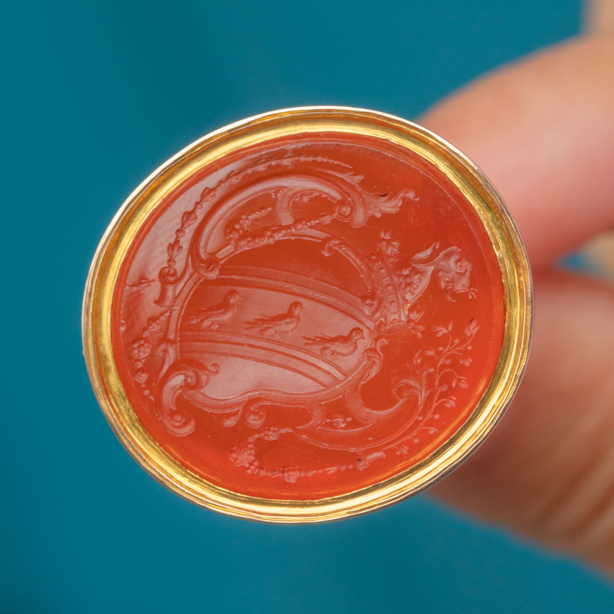 This impressive Georgian fob is crafted in solid 15ct Gold and set with a rich orange-red Carnelian, intricately engraved with a family crest within an ornate cartouche. Substantial in both size and weight, the fob is a striking statement jewel that would once have been used to seal letters and documents with wax.