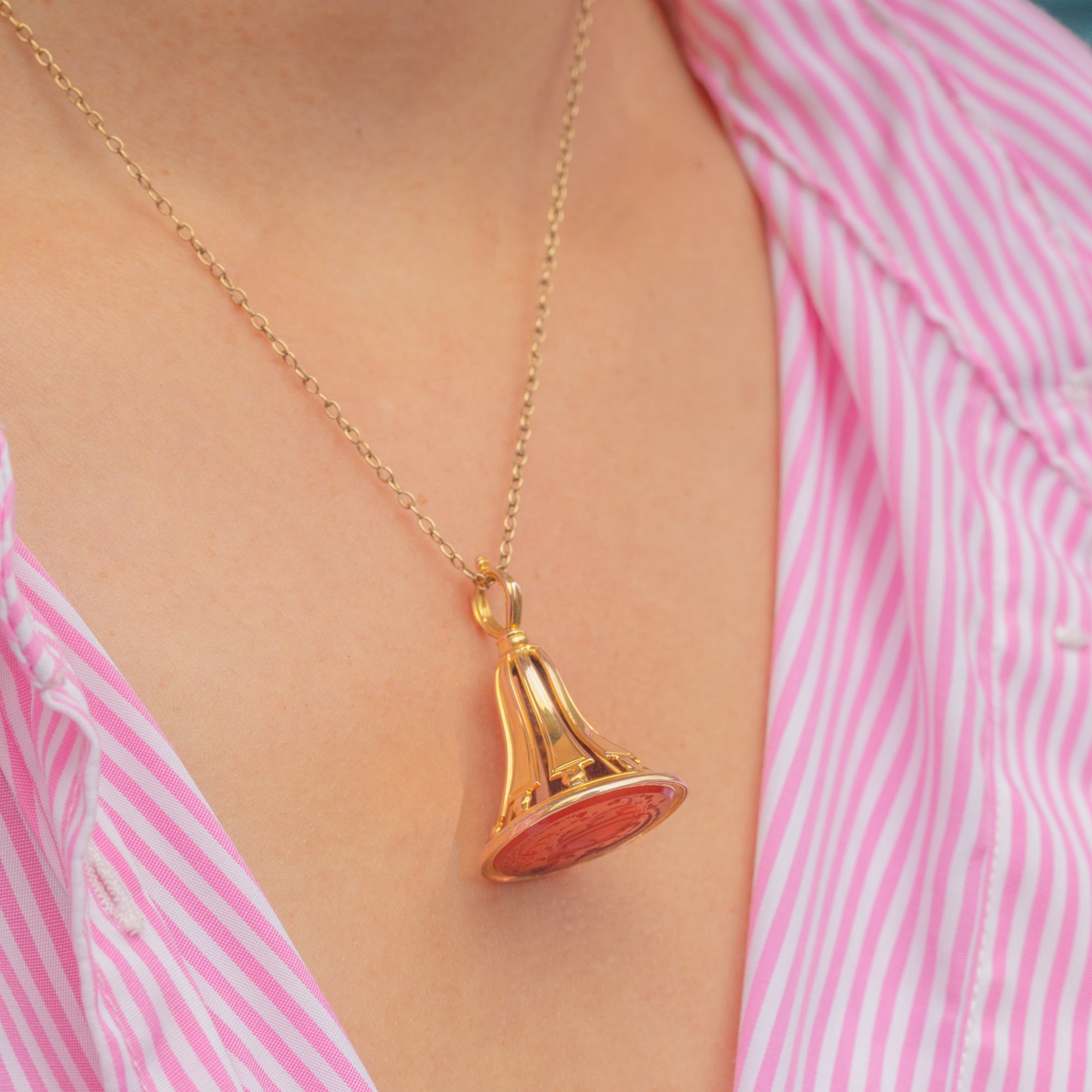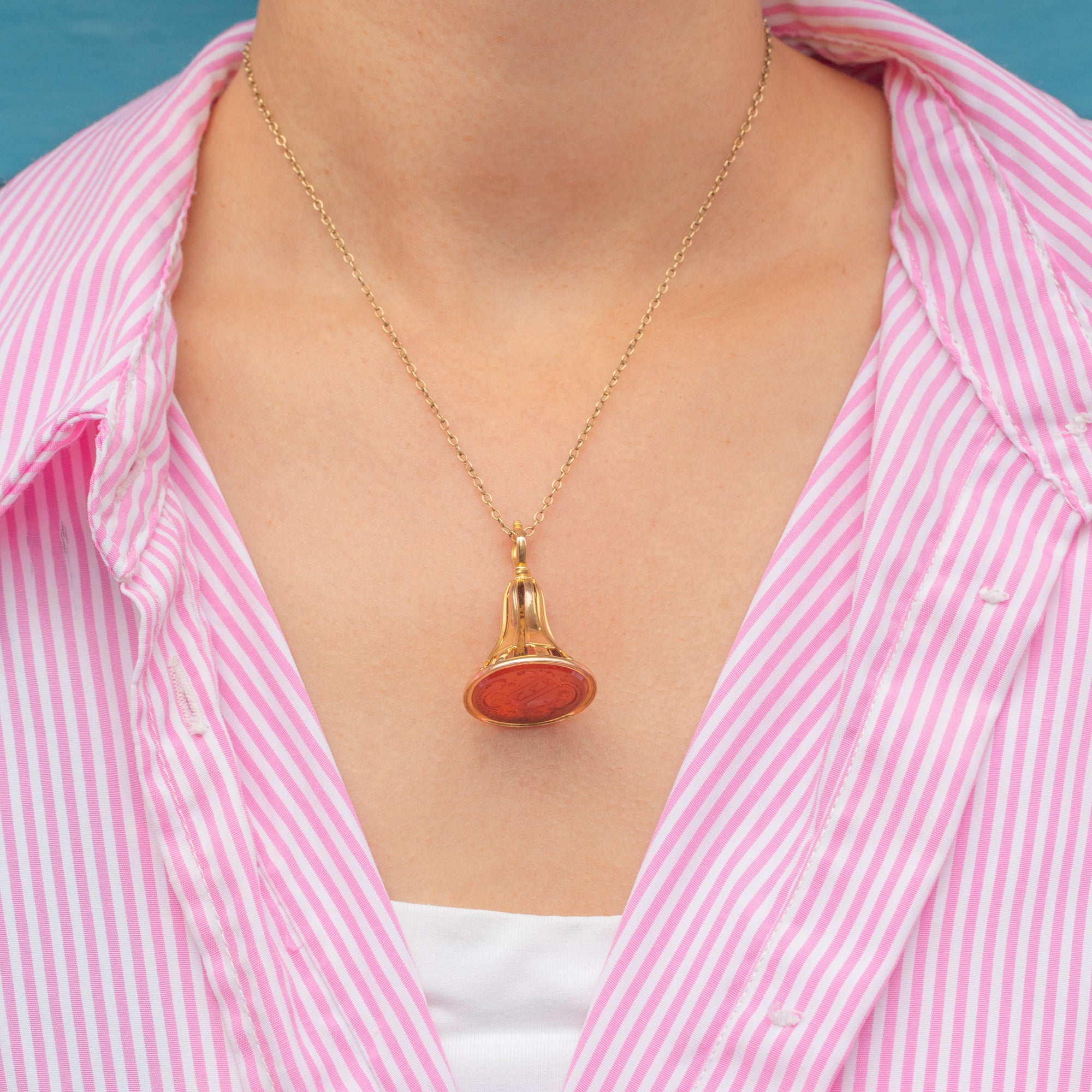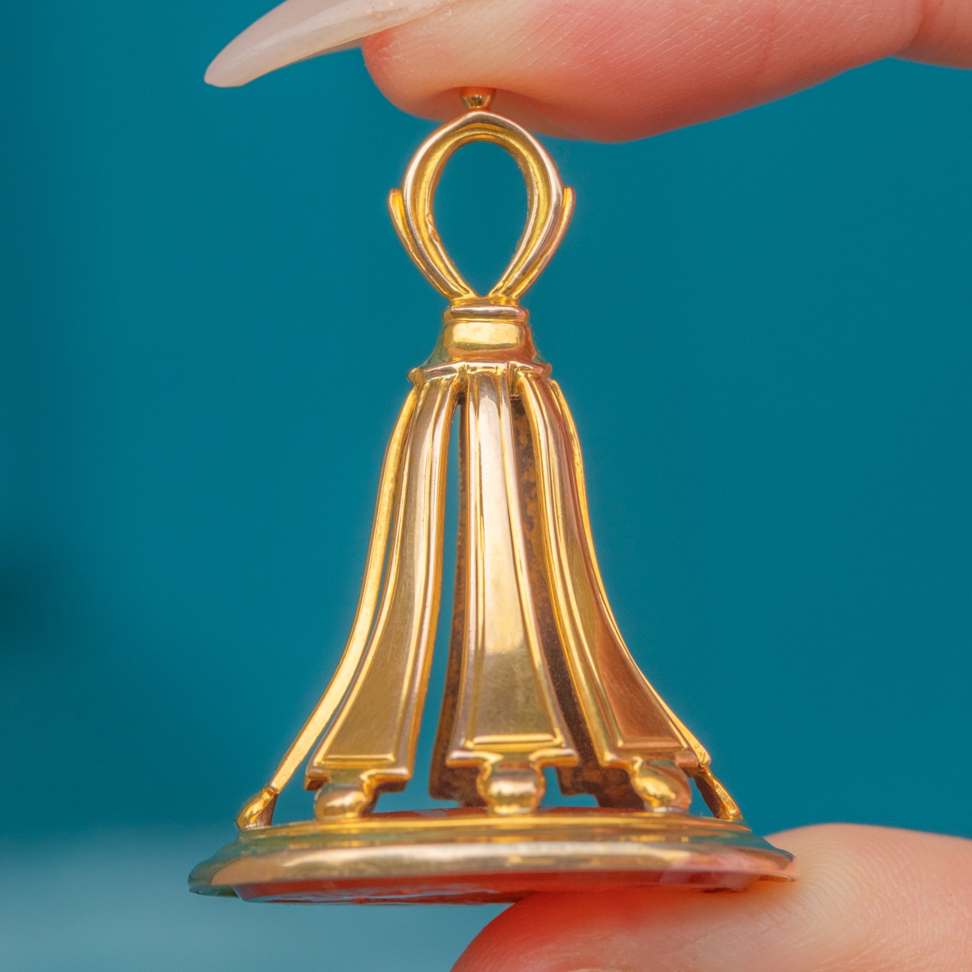 This impressive Georgian fob is crafted in solid 15ct Gold and set with a rich orange-red Carnelian, intricately engraved with a family crest within an ornate cartouche. Substantial in both size and weight, the fob is a striking statement jewel that would once have been used to seal letters and documents with wax.