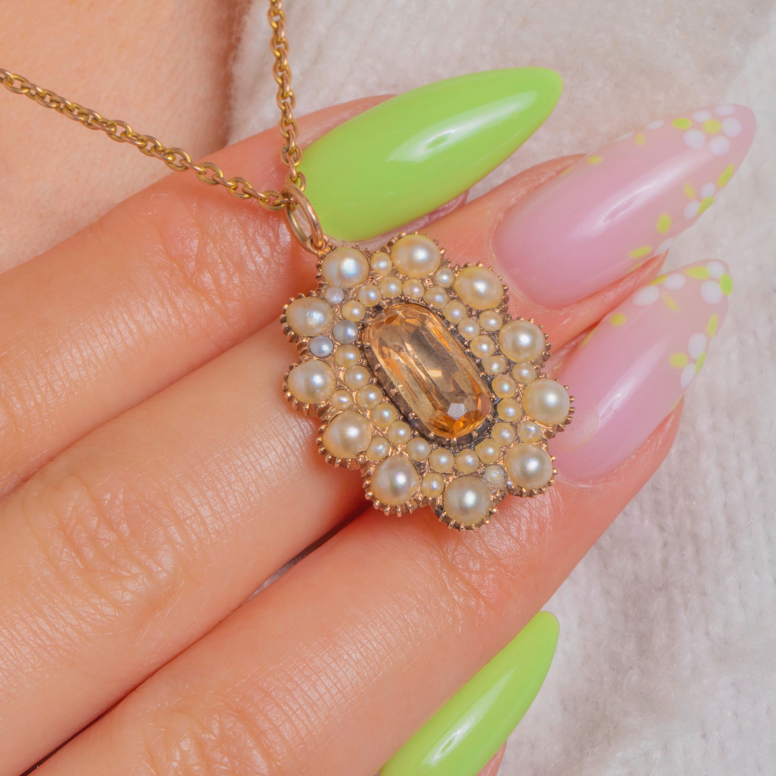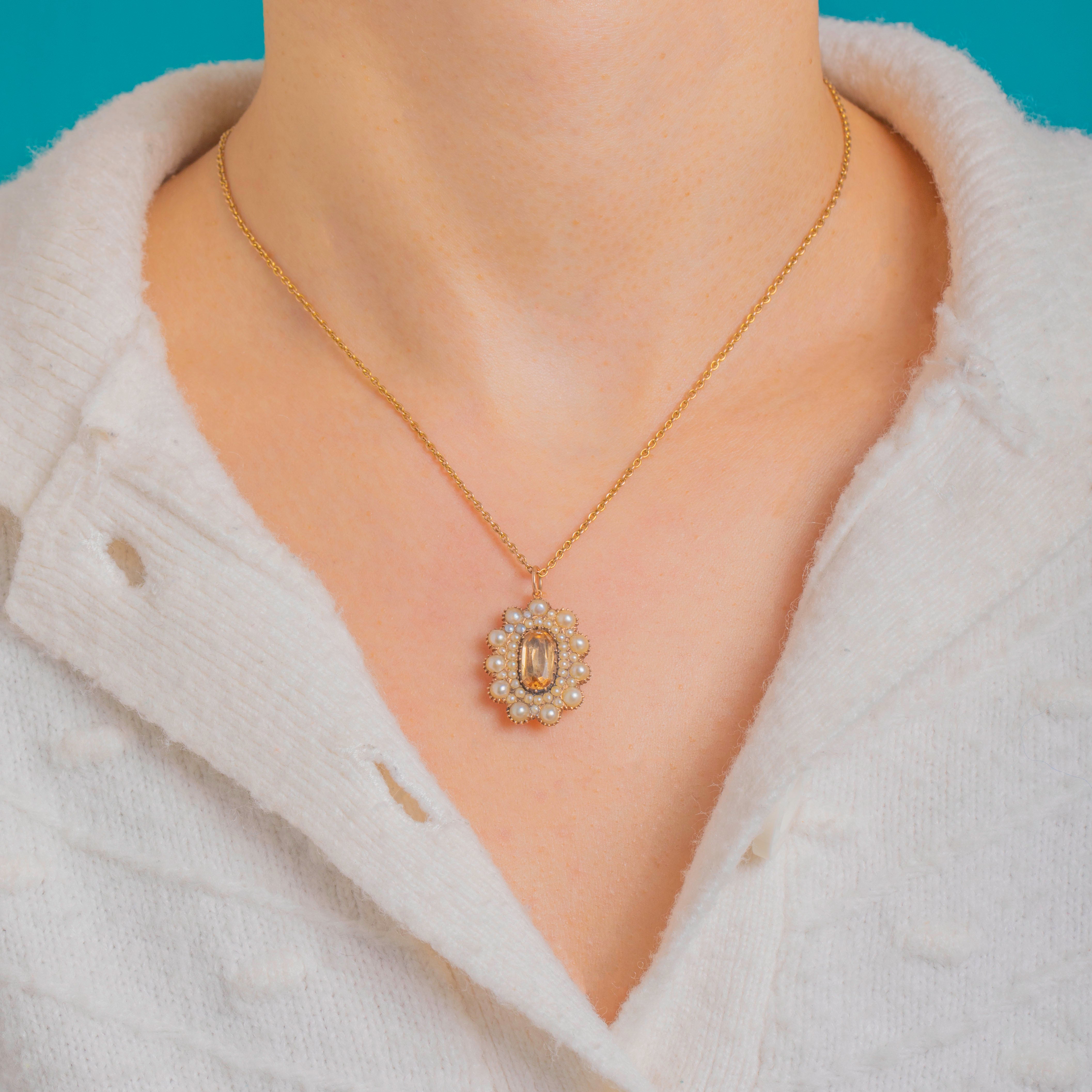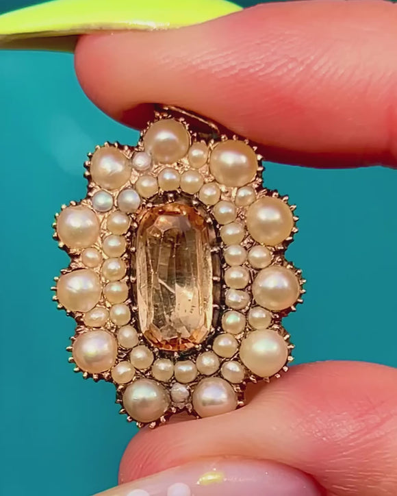 Graceful and romantic, this Georgian 15ct Gold cluster pendant centres on a honey‑hued Topaz, framed by luminous Pearls in beautifully detailed collets. The elongated faceted Topaz sits within a closed-back setting, encircled by concentric halos of creamy Pearls that build into a floral rosette, all enriched by delicate beaded detailing and the warm glow of 15ct Gold.