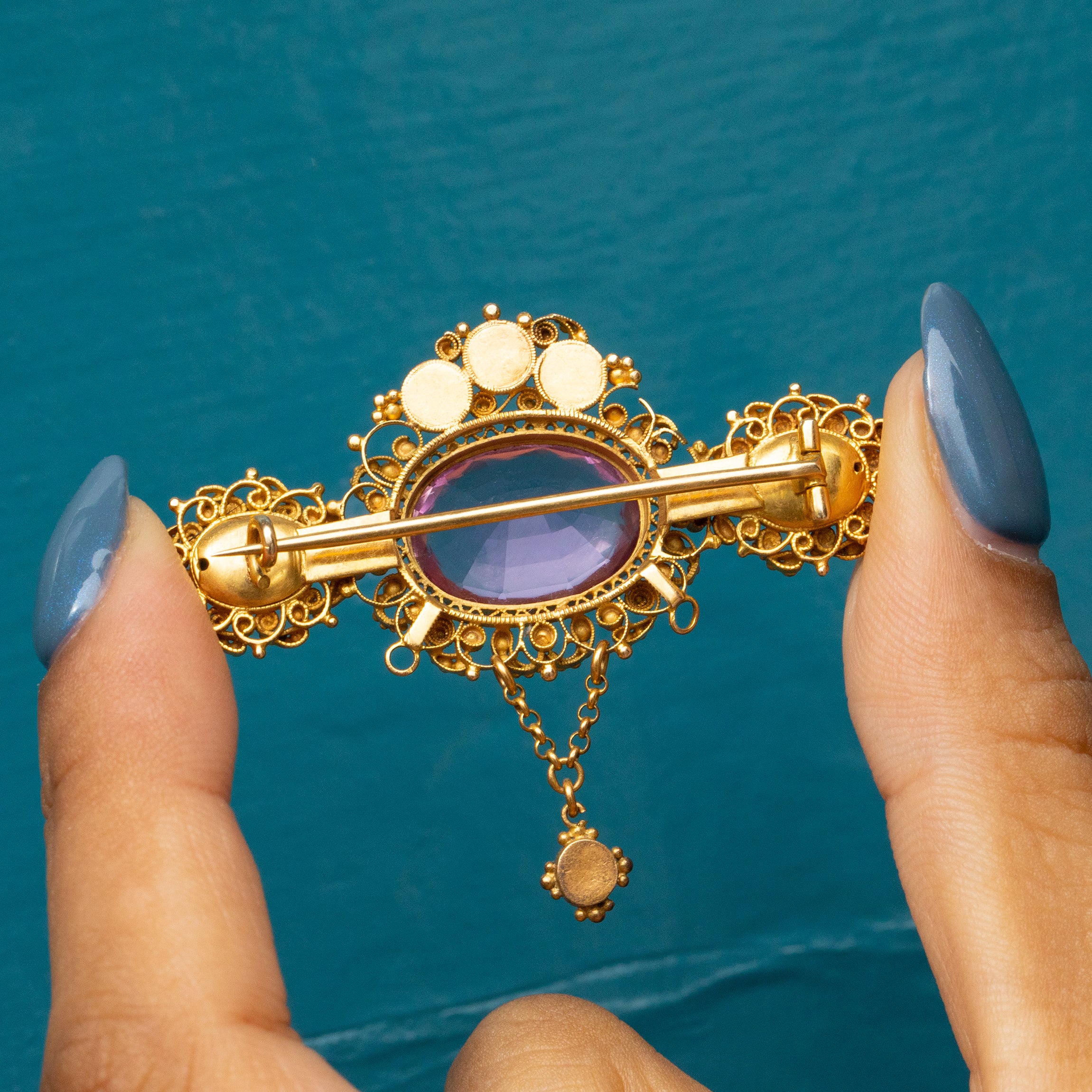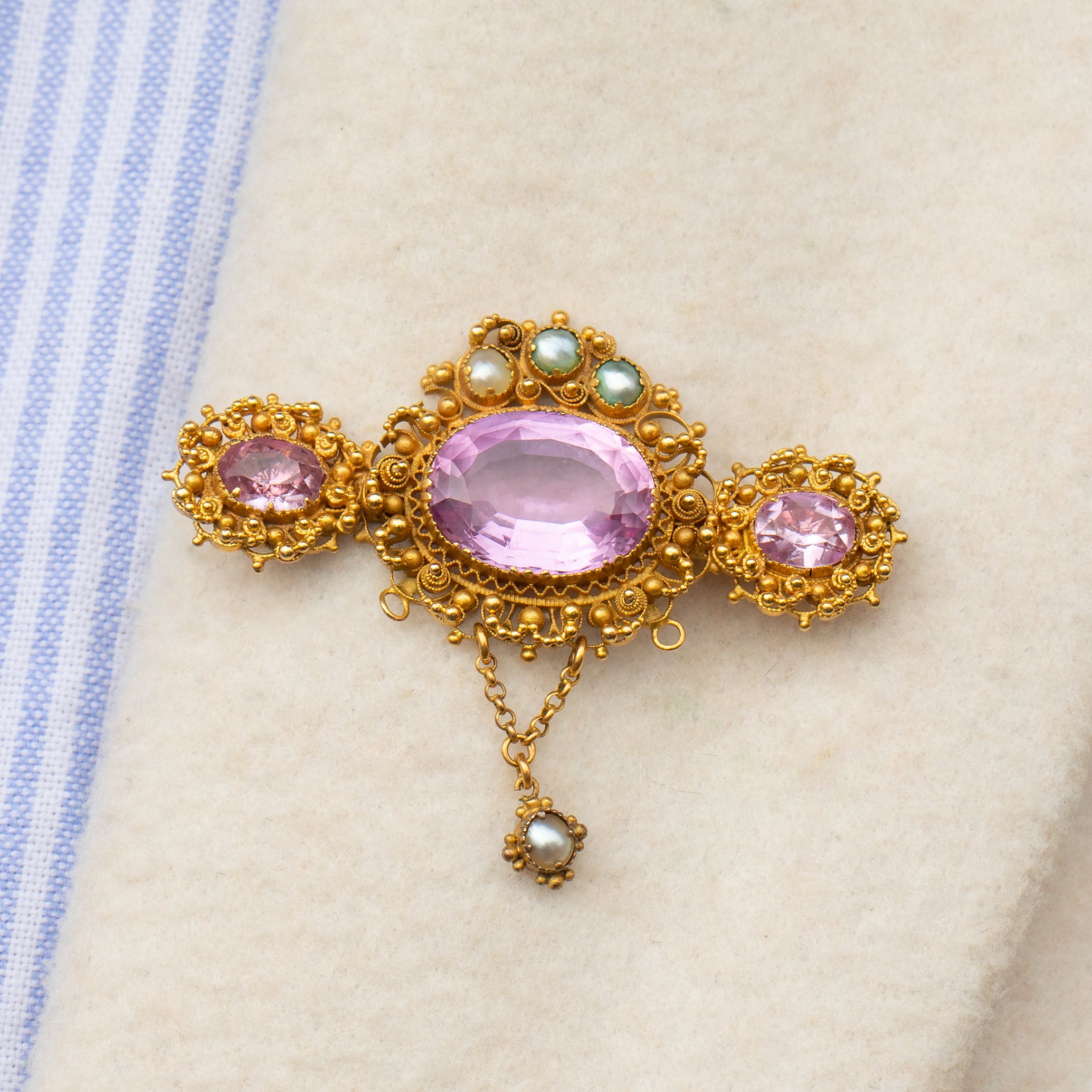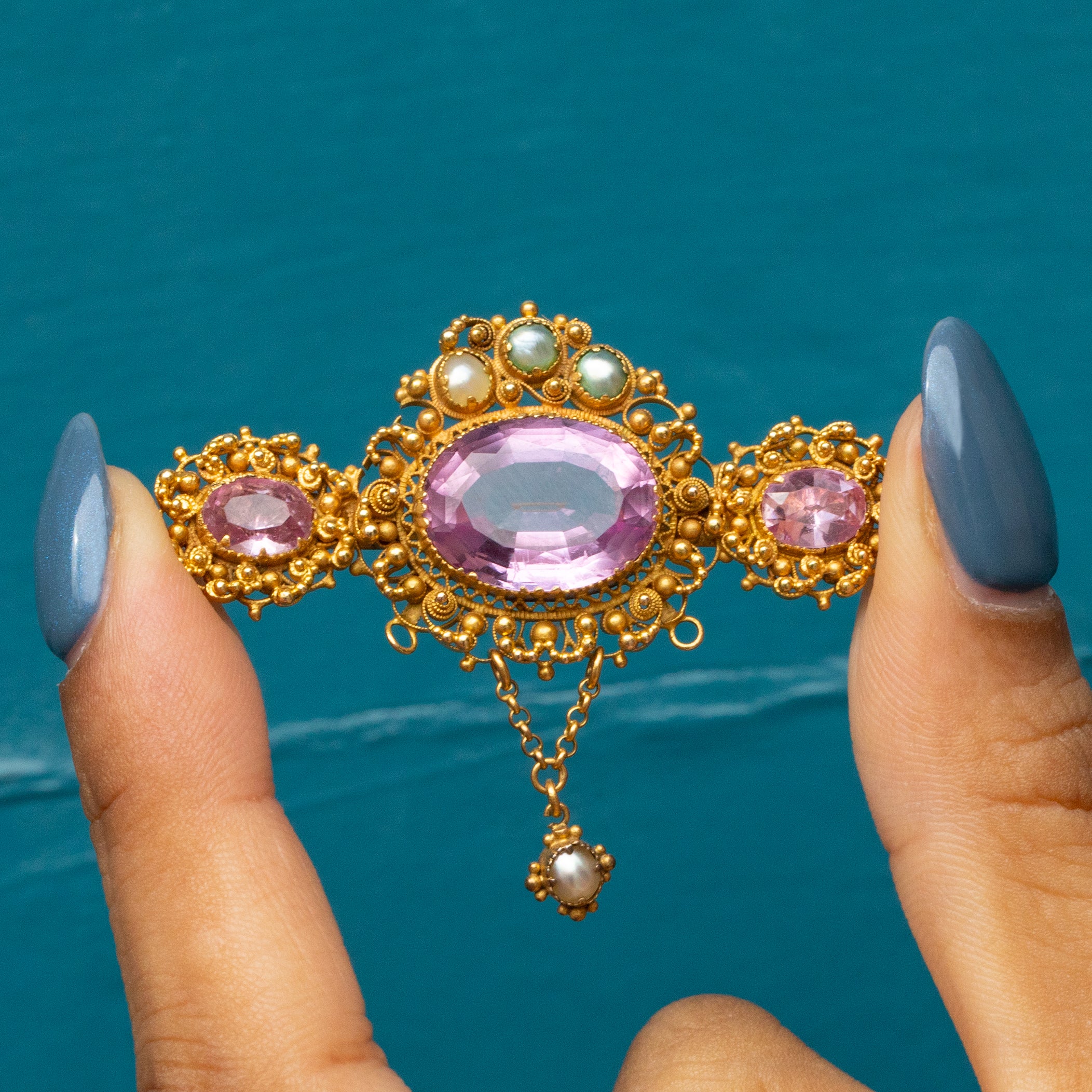Dancing around each gemstone is delicate cannetille detailing, a recognised characteristic of authentic Georgian jewellery. With a crown of shimmering Pearls poised atop her Pink Topaz, this antique Gold brooch is fit for royalty!