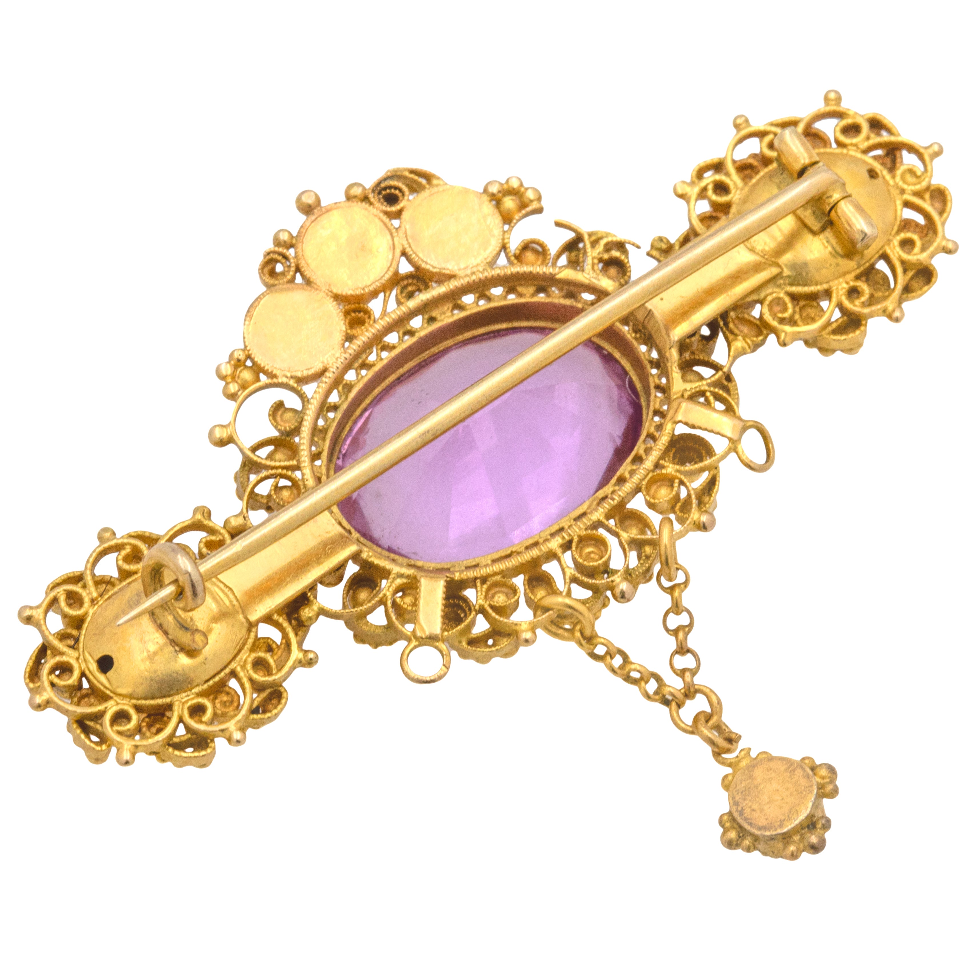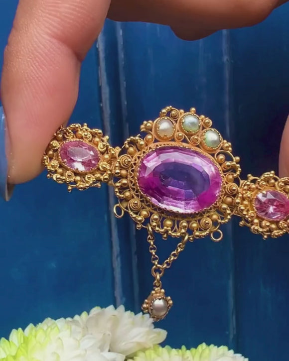 Georgian 18ct Gold Cannetille Pink Topaz Pearl Brooch, 7.80ct