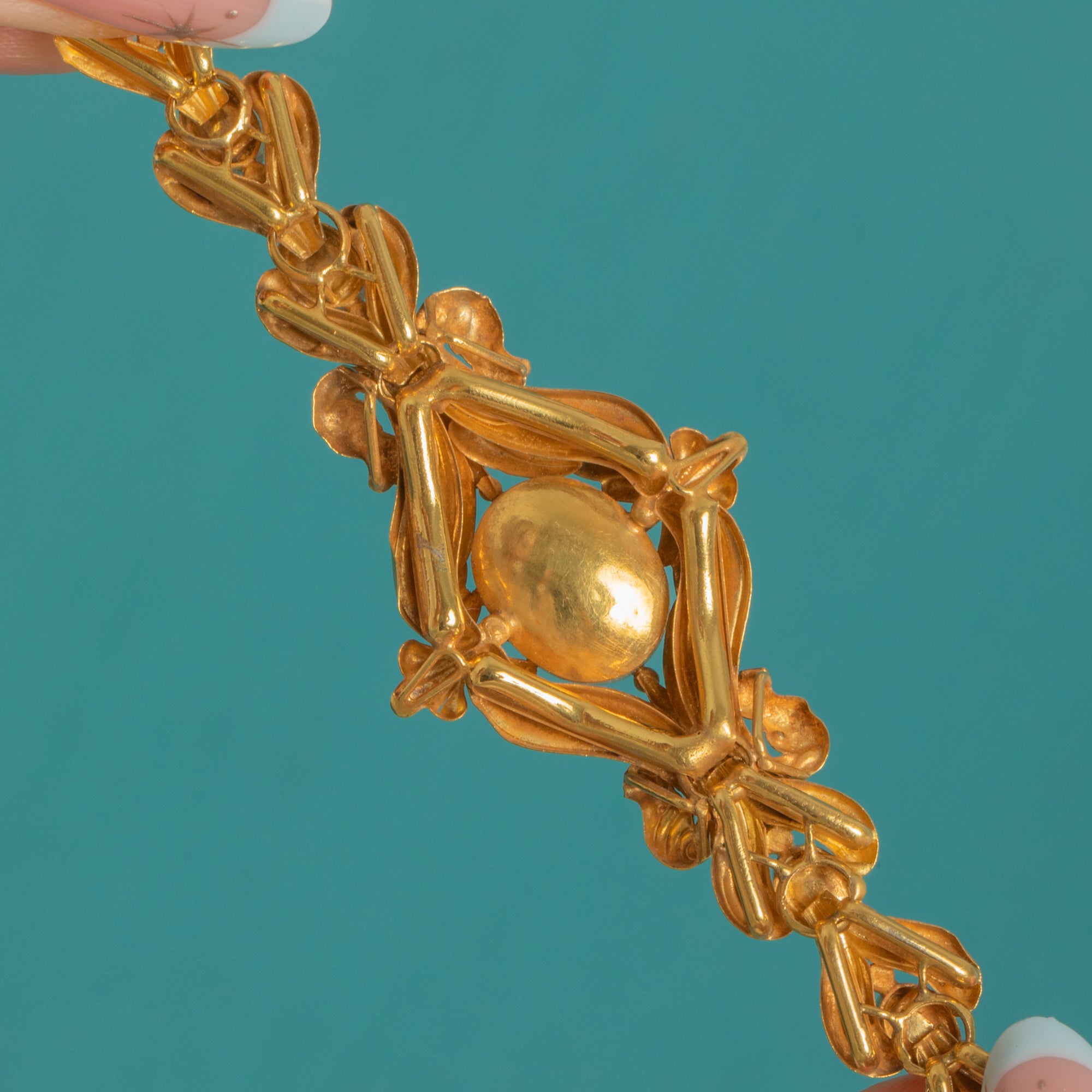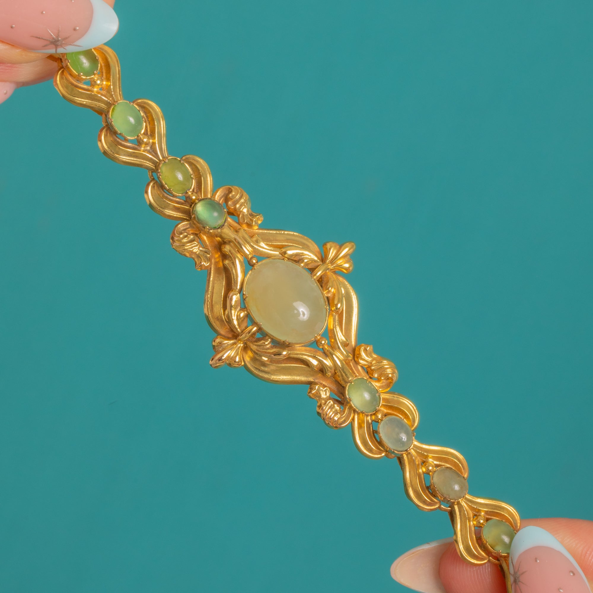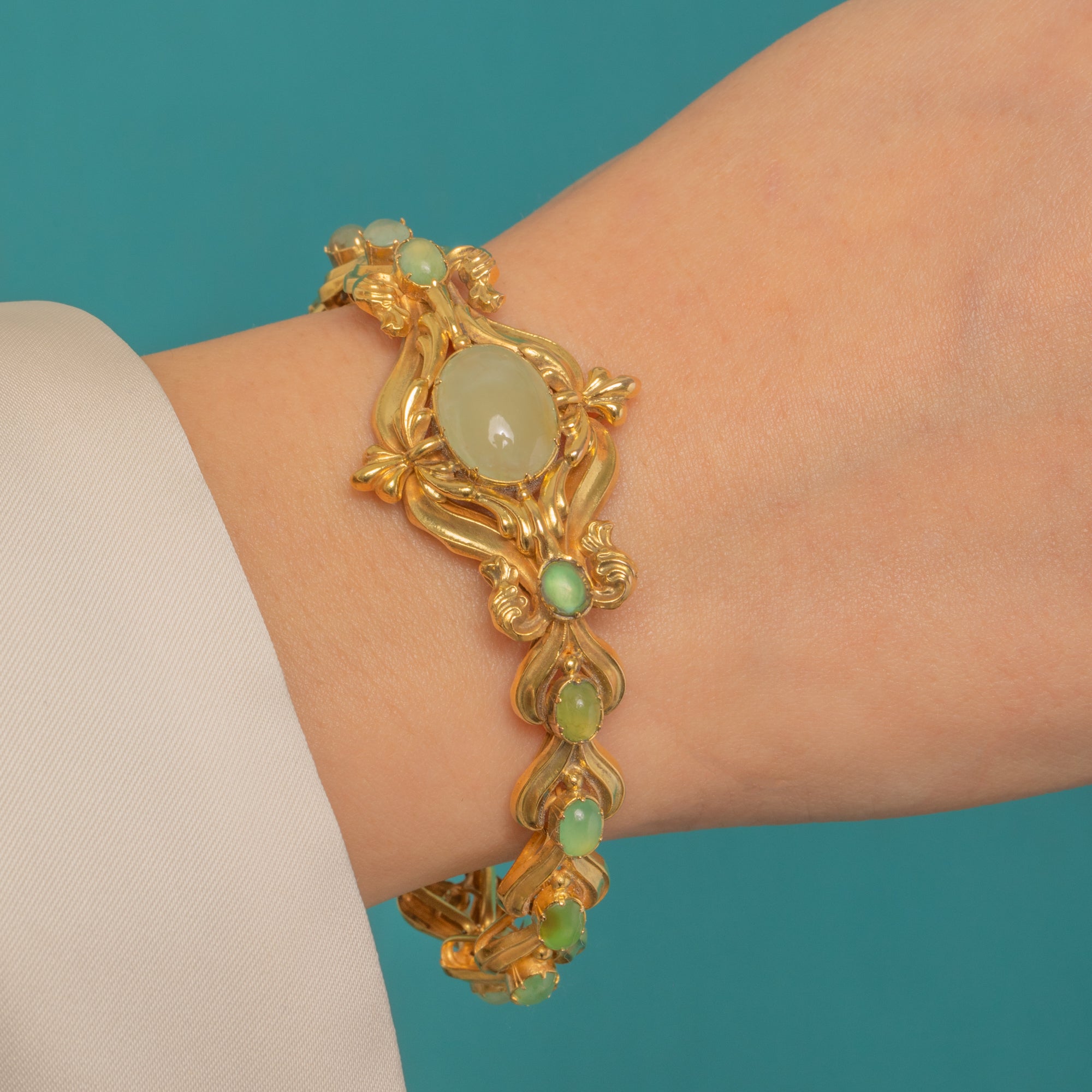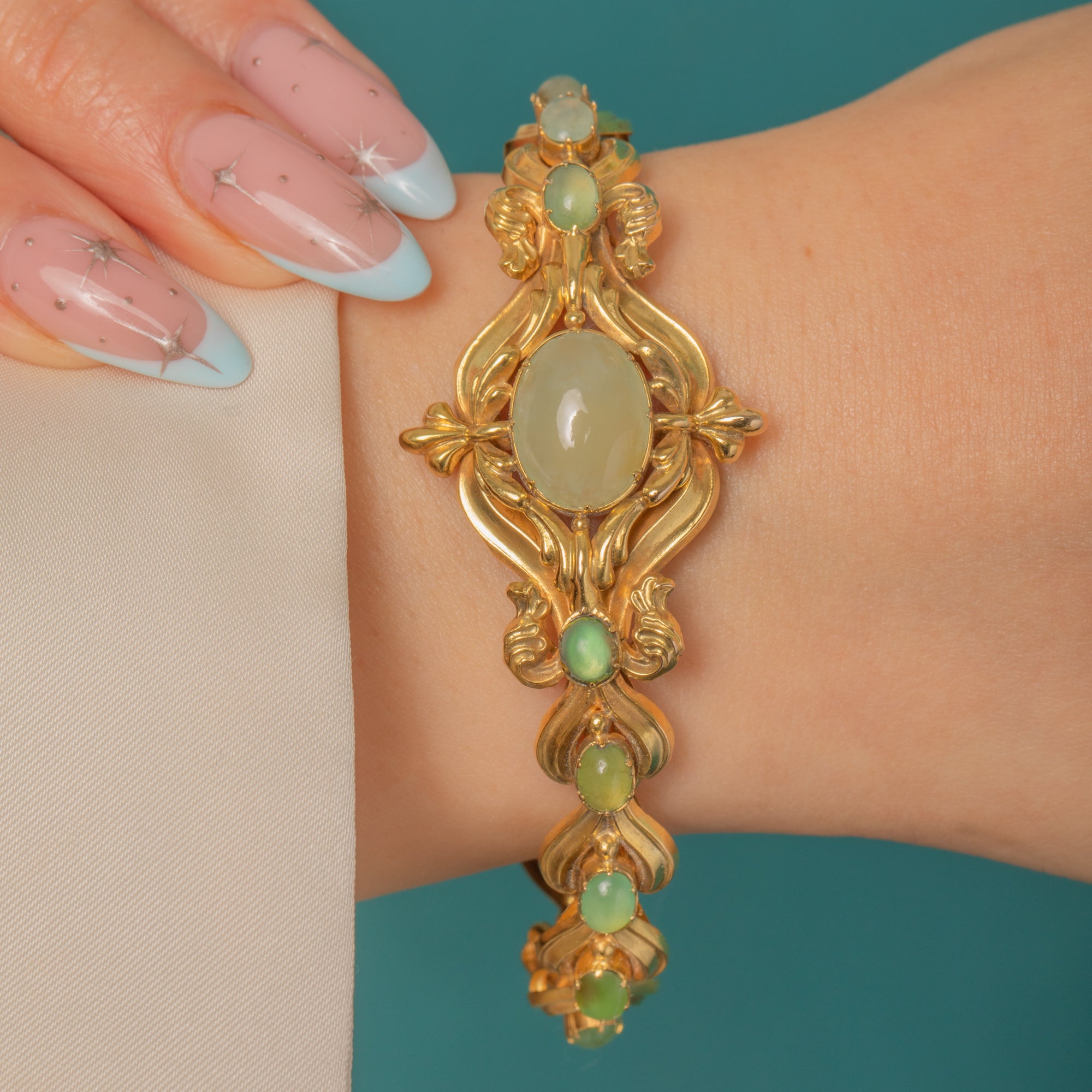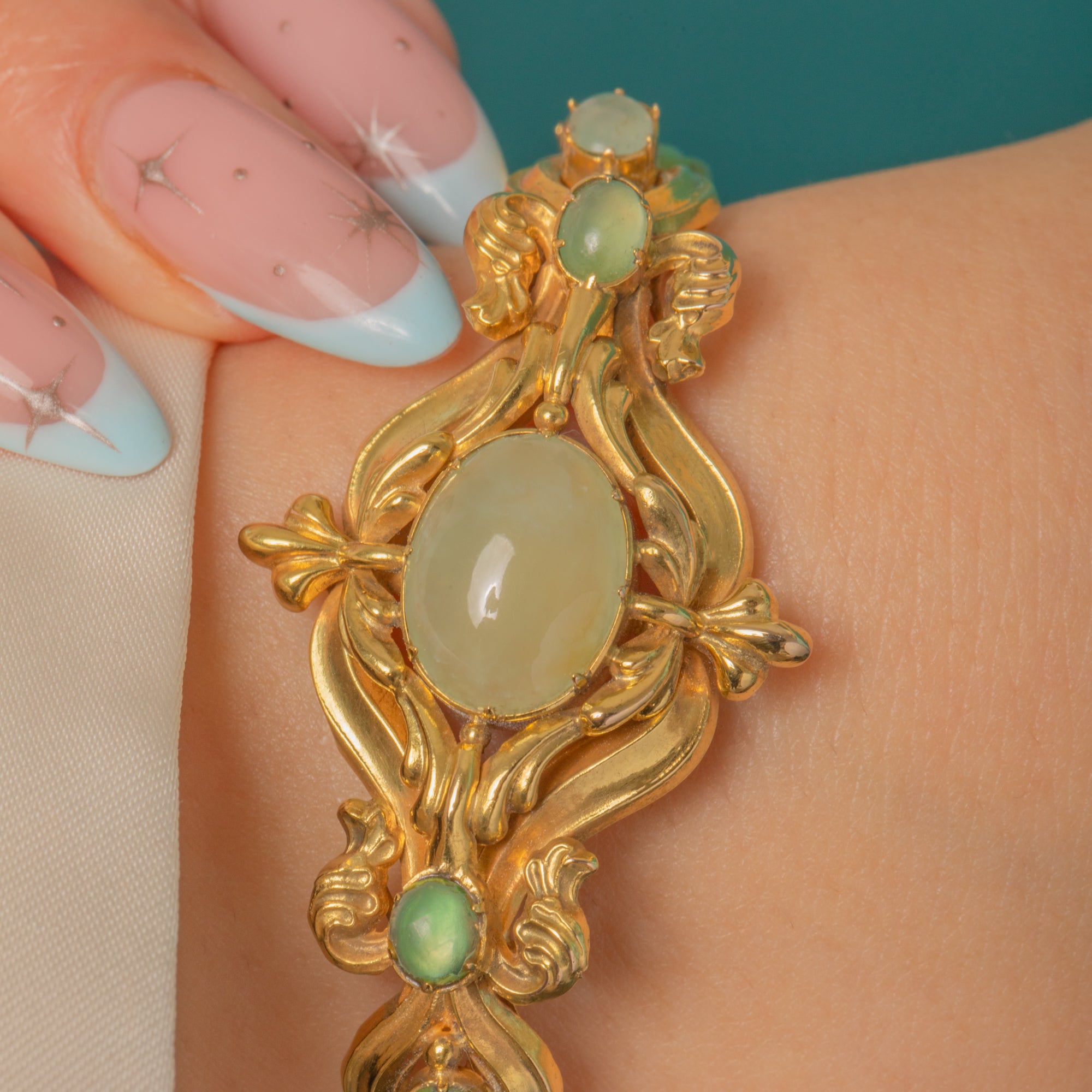A graceful Georgian bracelet, c.1830, crafted in rich 18ct Gold and centred by a sculptural, pierced foliate cartouche. At its heart lies a luminous pale green Chrysoprase cabochon, framed by flowing scrollwork and delicate bead accents for a beautifully balanced statement.