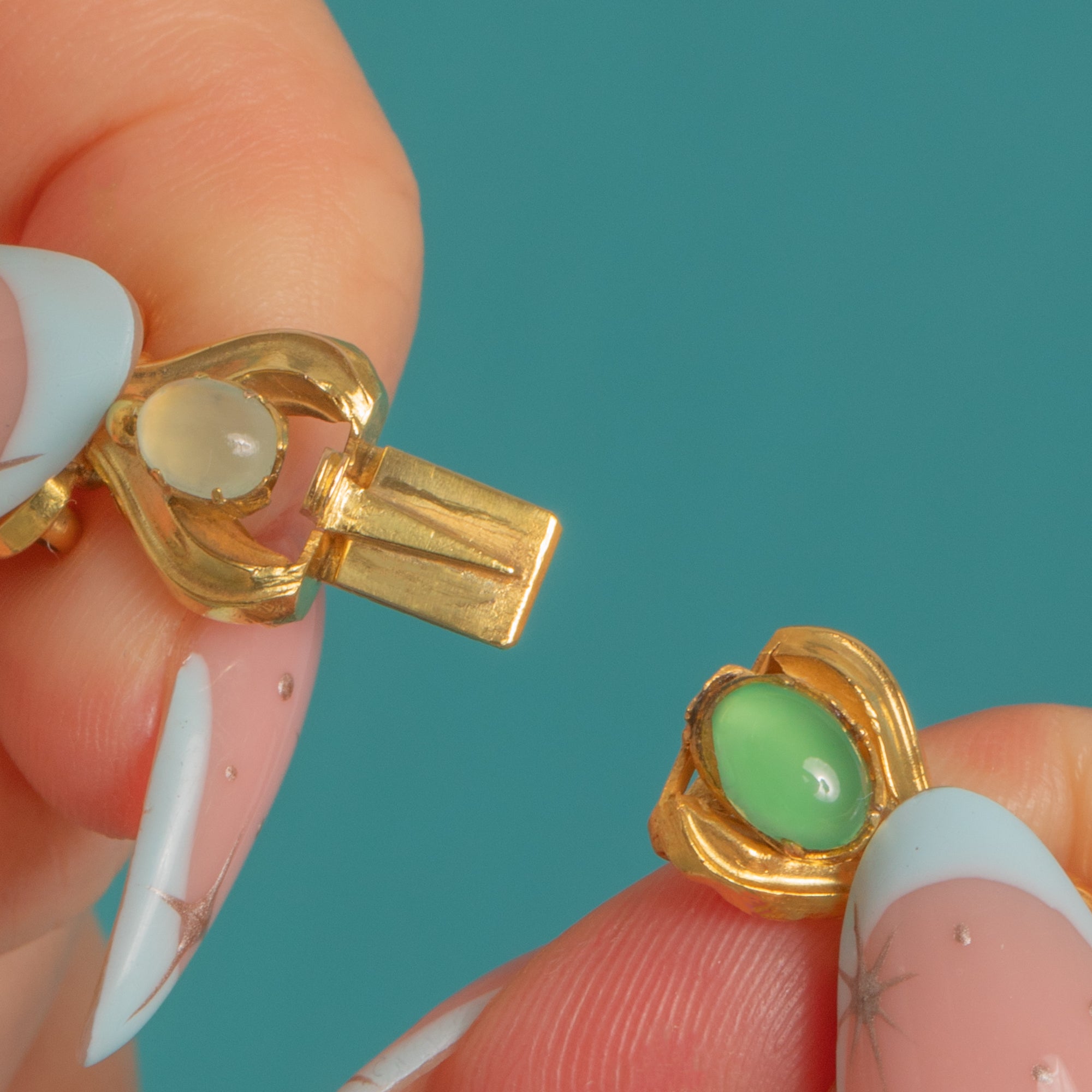 EXCELLENT: The Chrysoprase cabochons are bright and well-matched with no obvious chips or abrasions. The 18ct Gold settings and articulated links are crisp with light surface wear; collets are secure and well-formed. No visible repairs, and the piece presents beautifully overall.