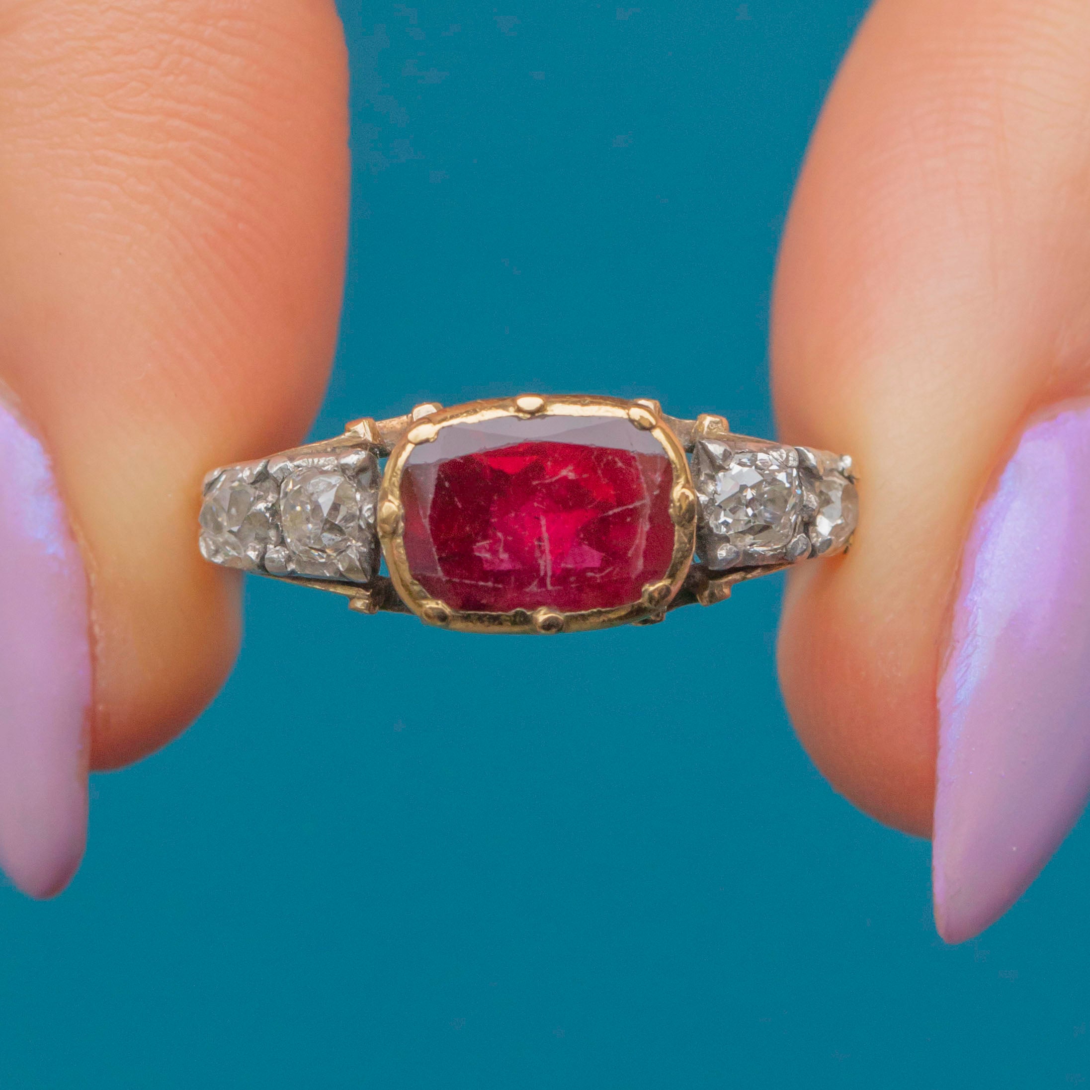 GOOD-VERY GOOD. This Georgian 18ct Gold flat-cut Garnet Diamond half hoop ring remains a stunning antique treasure, despite the natural signs of age. The gemstones are secure in their settings, with the Garnet displaying her rich, berry-red hue, though faint surface scratches are visible upon close inspection. The original shank remains well-formed and smooth to the touch, but shows some signs of wear from years of loving use. With proper gentle care, this rare piece of history can continue to be cherished for many years to come.