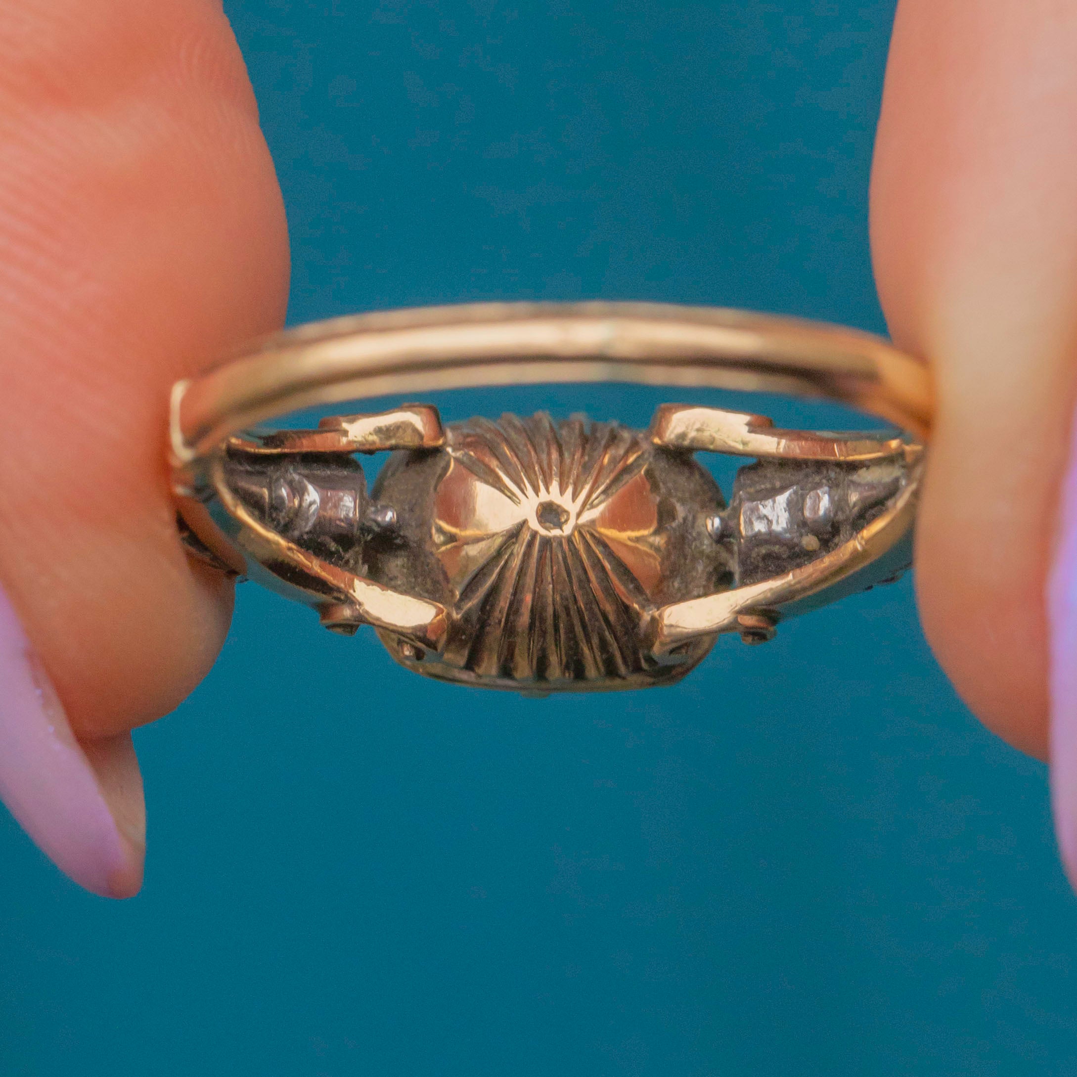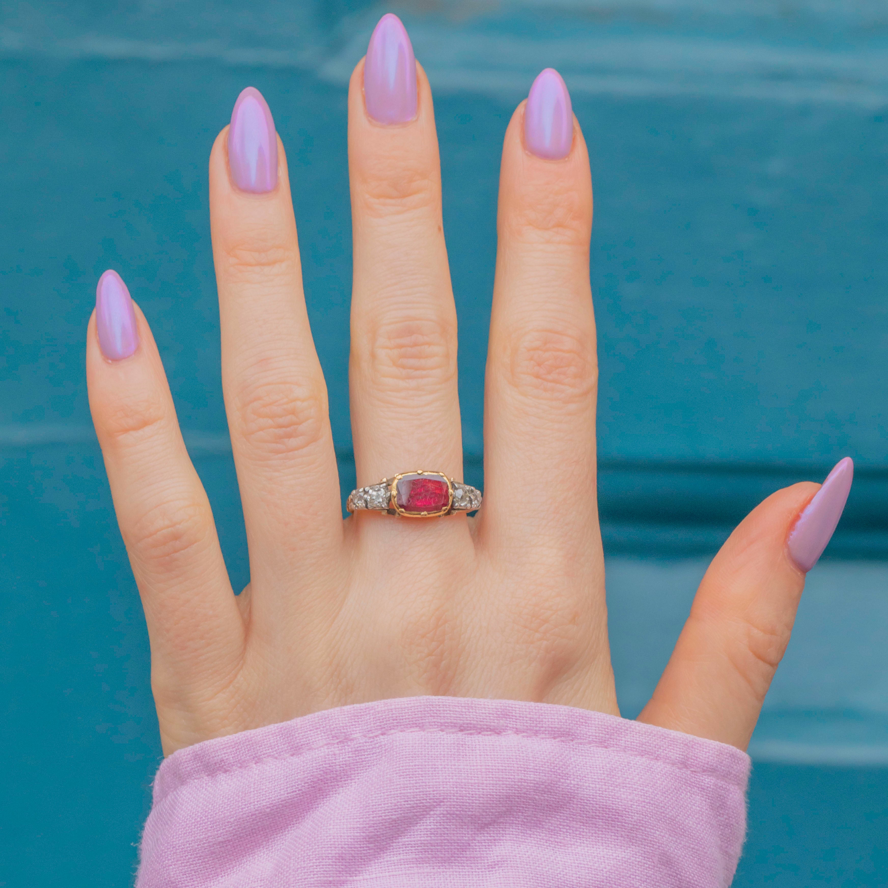 This exquisitely preserved 18th-century Georgian 18ct Gold flat-cut Garnet Diamond half hoop ring is a true treasure from the late 1700s. Dating to around 1790, she embodies the elegance of the era, when jewellery designs were fluid, graceful, and effortlessly enchanting.