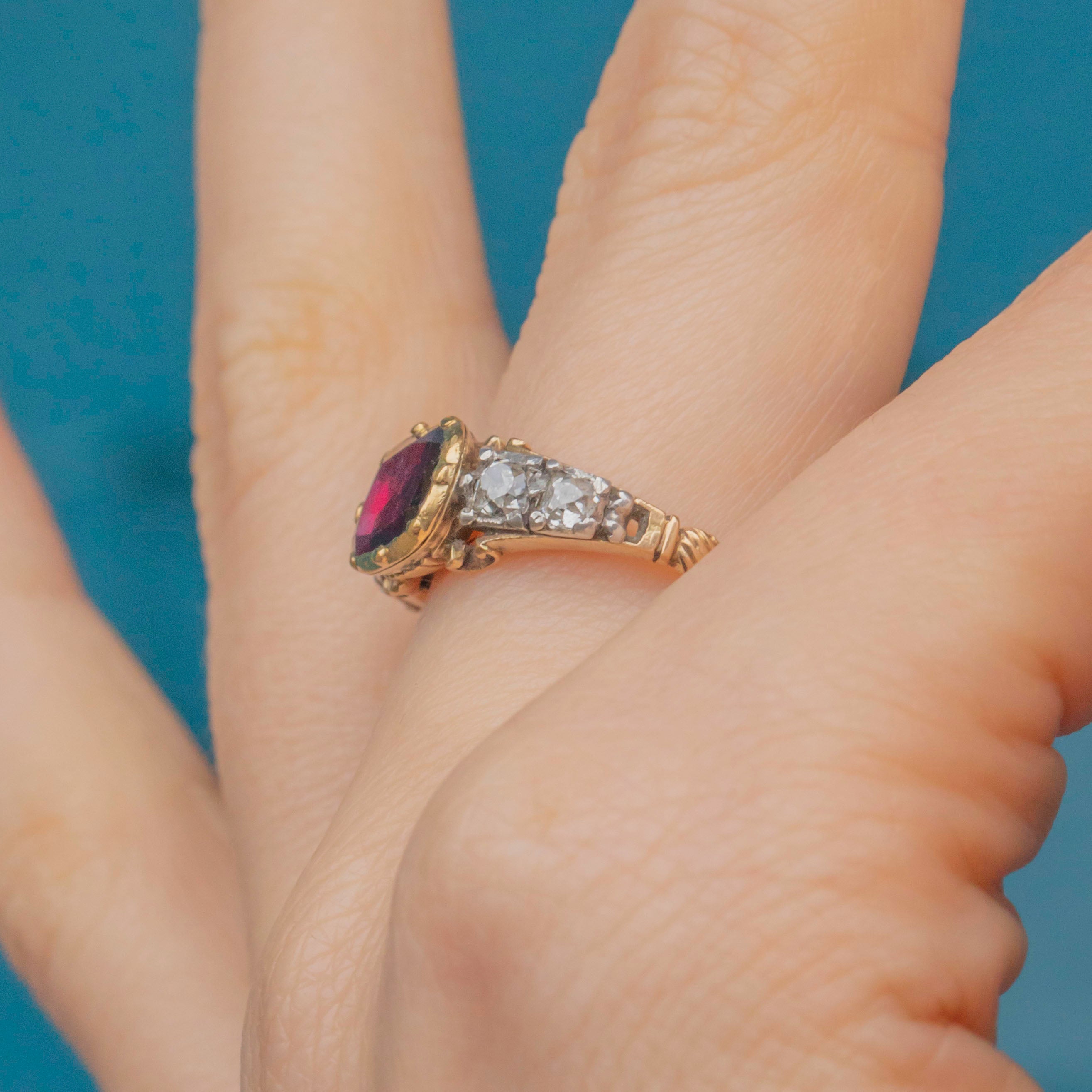 At her heart lies a captivating Garnet with a rich, berry-red glow, embraced by a shimmering array of table-cut and old-mine-cut Diamonds. Exuding timeless charm, a rare and exquisite piece, this historic gem is simply irresistible!