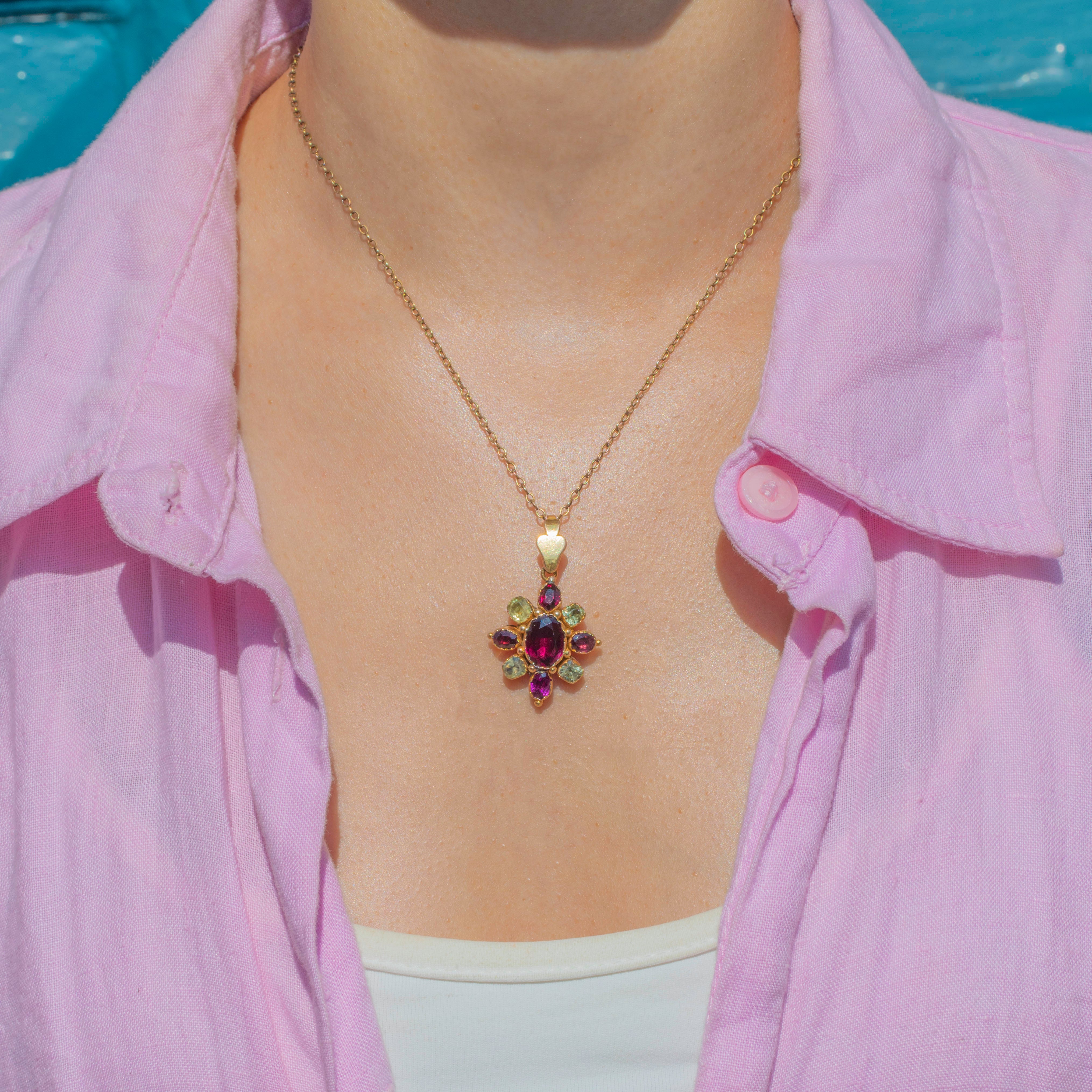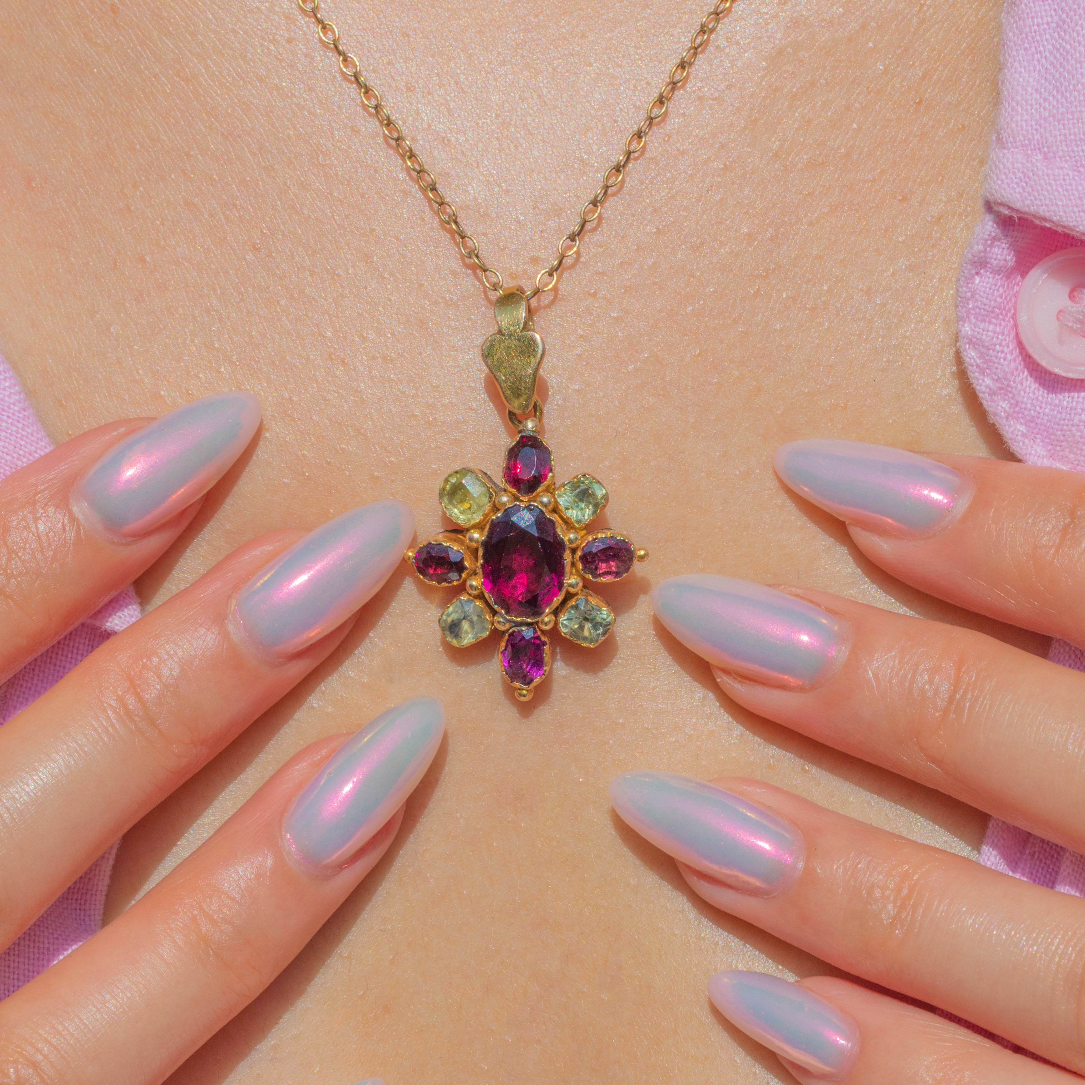 This glamorous antique cluster pendant dazzles from all angles, with each radiant gemstone faceted wonderfully, with a contrasting mixture of warm and cool tones. The Garnets and Chrysoberyl are set in buttery 18ct Gold bezels, with smooth backs and an elongated, elegant bale that allows for comfortable and refined wear.