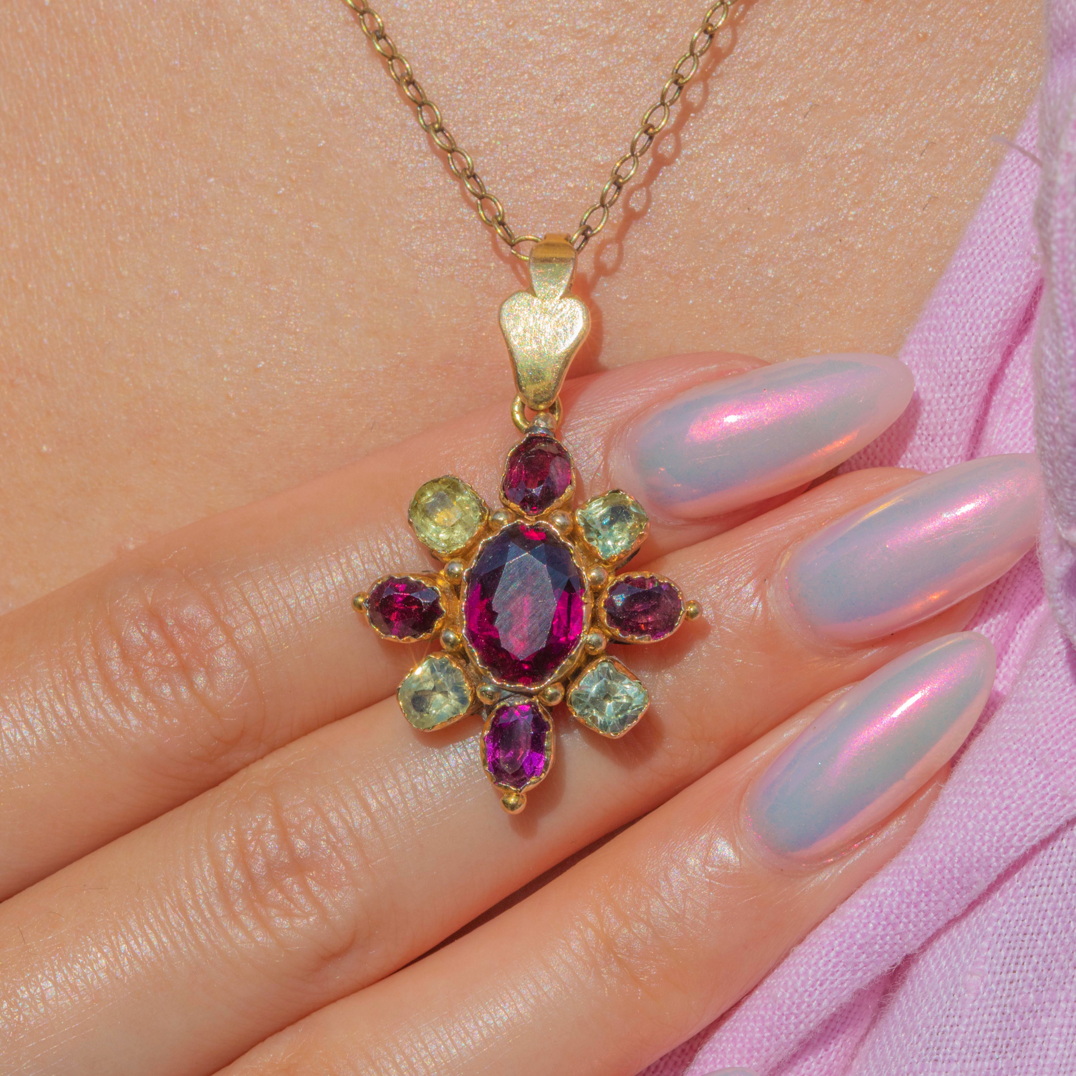 VERY GOOD-EXCELLENT: Each gemstone has been preserved wonderfully and is secure in its bezel. The Gold is bright and buttery, with only minor spots of discolouration to the settings, which are difficult to spot without a jeweller's loupe. With a secure bale, you can wear this Georgian cluster pendant with utmost confidence.
