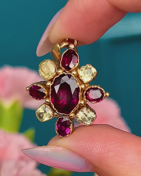 A radiant, large Georgian cluster pendant, adorned by juicy Garnets and scintillating Chrysoberyl gemstones - crafted in buttery 18ct Gold!