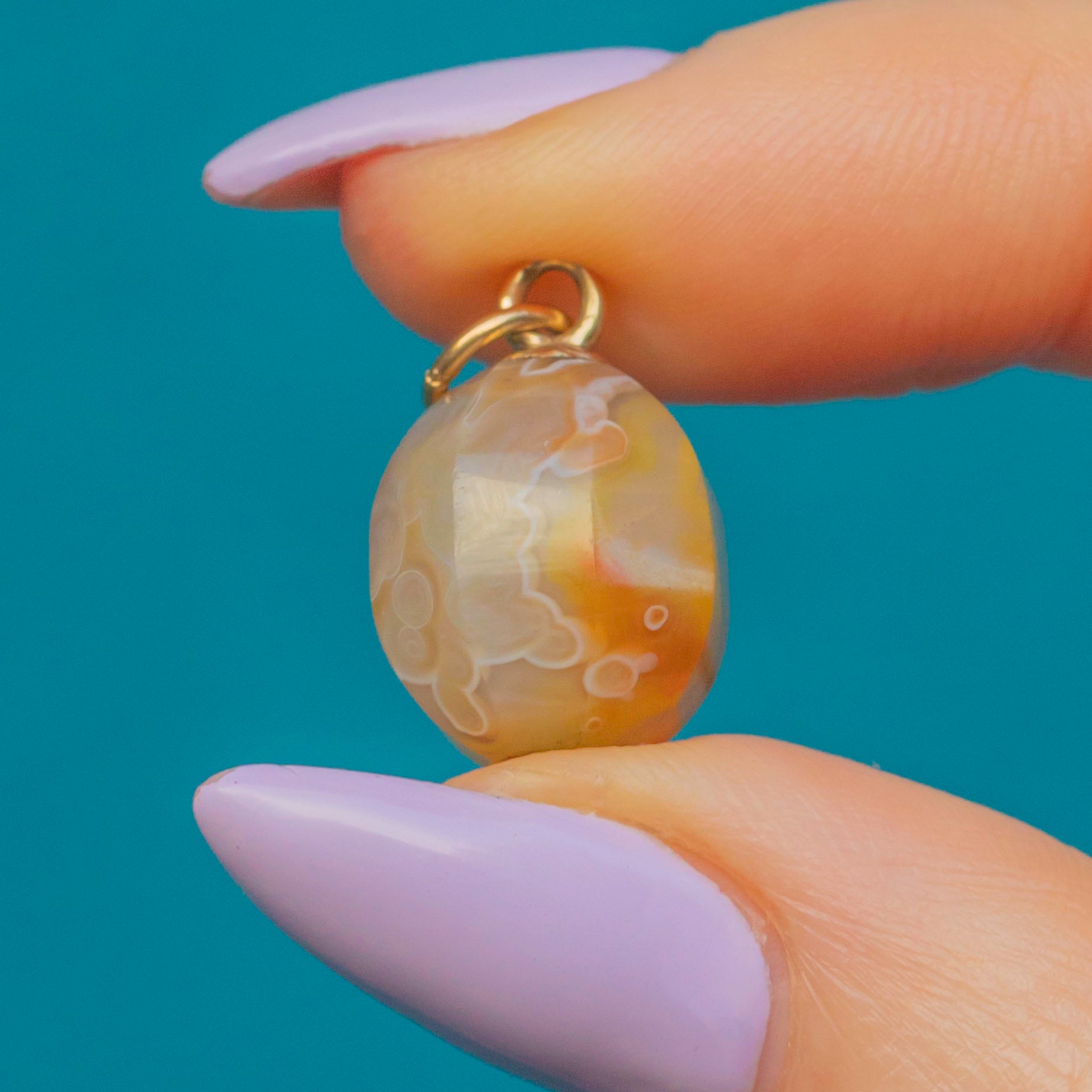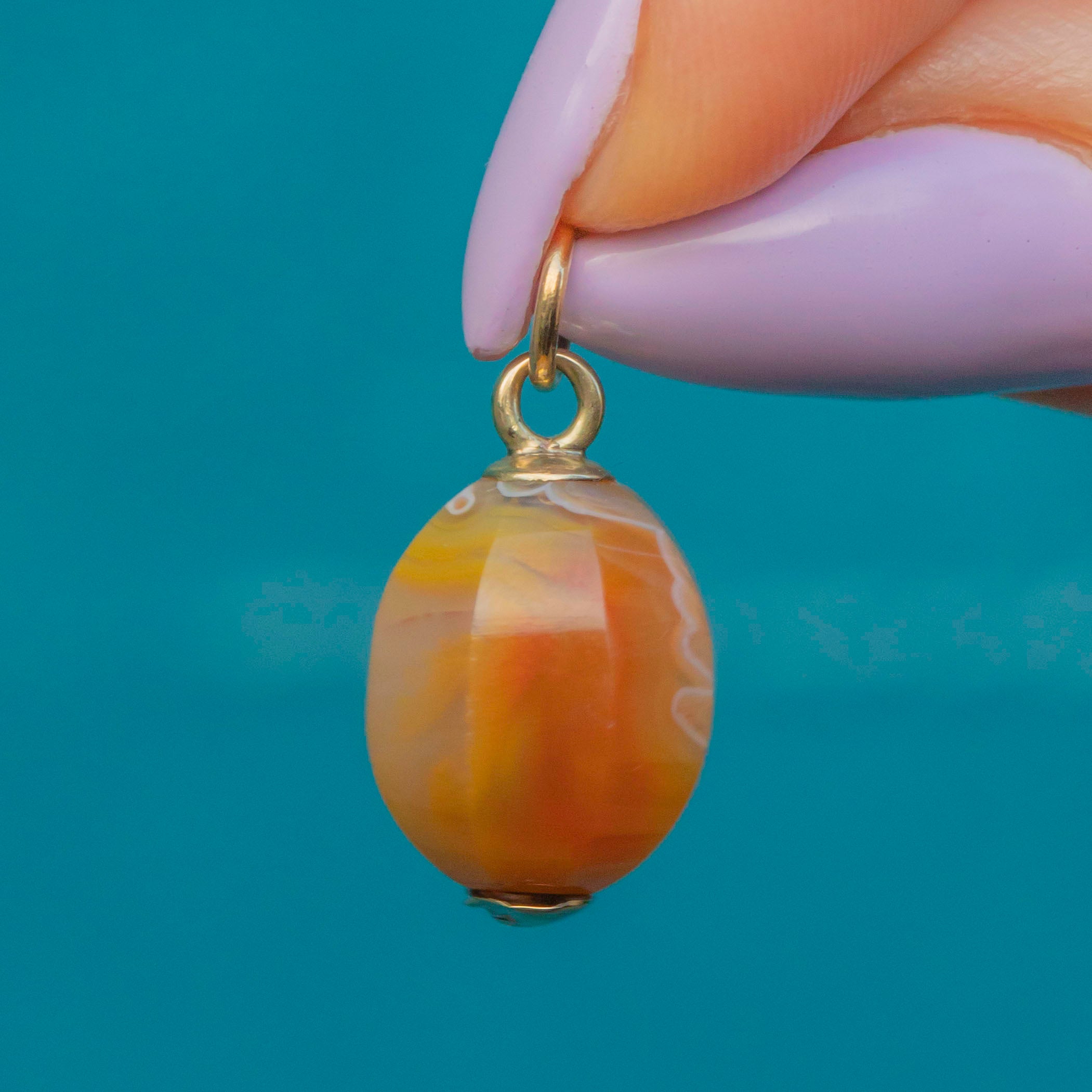 EXCELLENT. This Georgian 9ct Gold Agate faceted orb pendant is in excellent condition. The Agate is perfectly smooth with crisp facets and is securely held within its 9ct Gold settings. With a generously sized jump ring, you can style this striking piece of Georgian jewellery however you please!