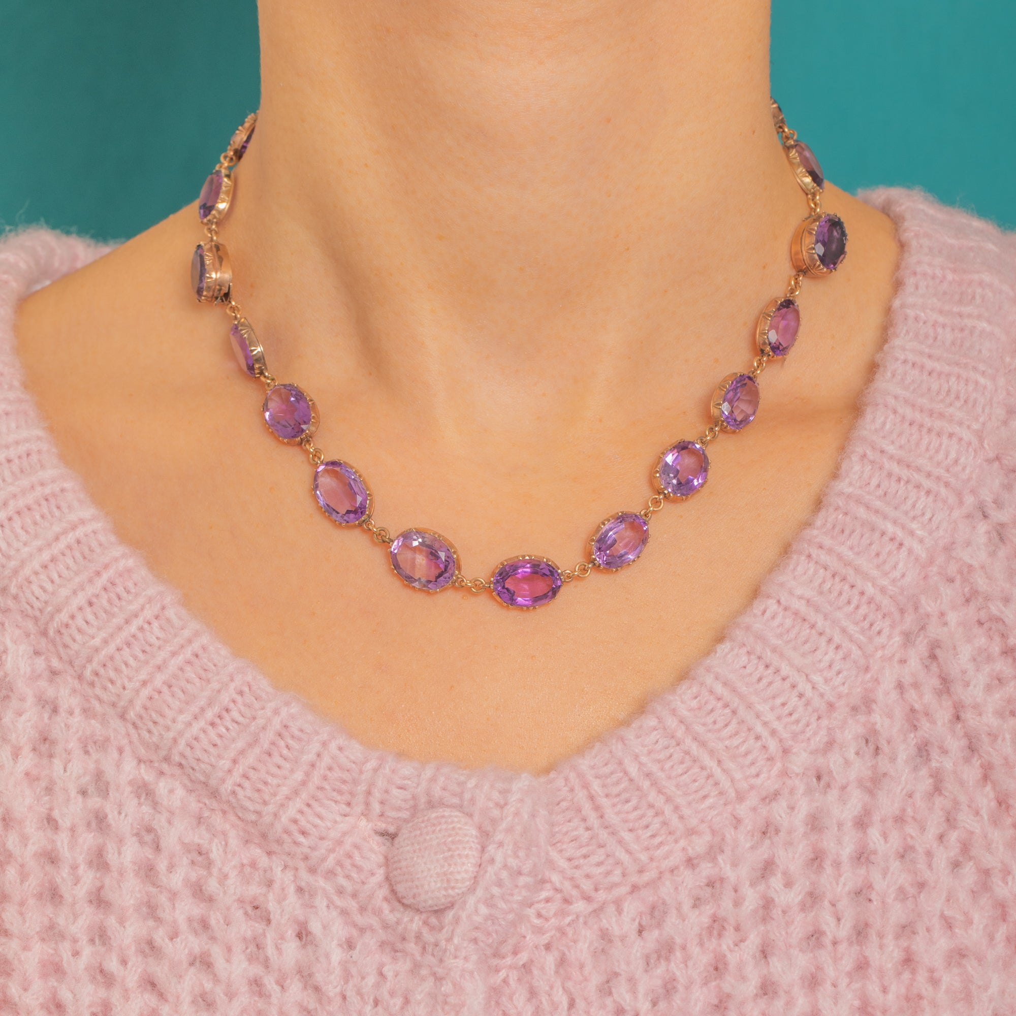 A luminous Georgian Amethyst rivière alive with rich, grape-coloured sparkle. Twenty oval Amethysts are set in crisp triple-claw, cut-down “pie-crust” collets of warm 9ct Gold, each articulated link flowing elegantly across the collarbone. The concealed clasp is cleverly integrated as a link, with the two clasp Amethysts traditionally closed-back and foiled for that soft inner glow beloved in early 19th-century jewels.