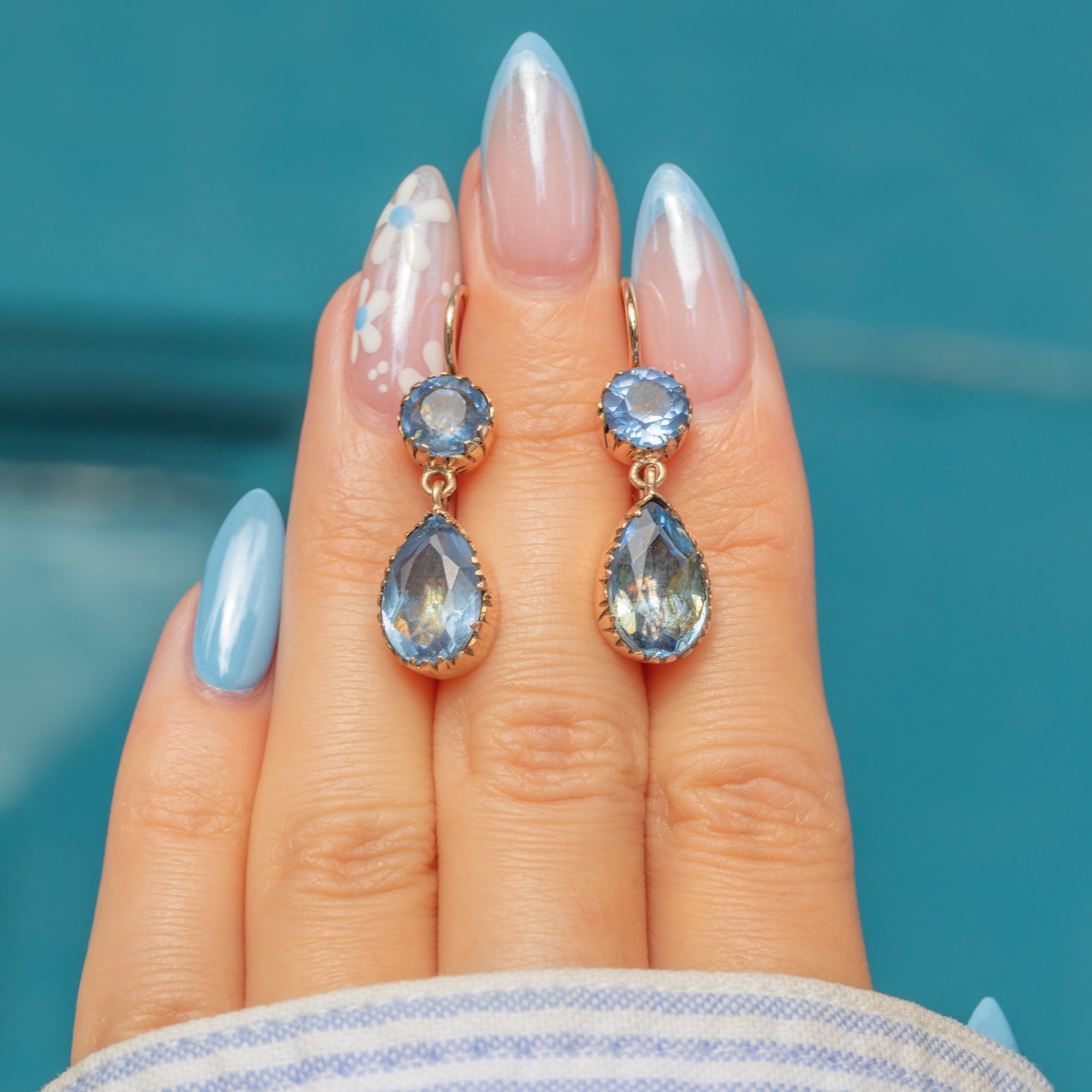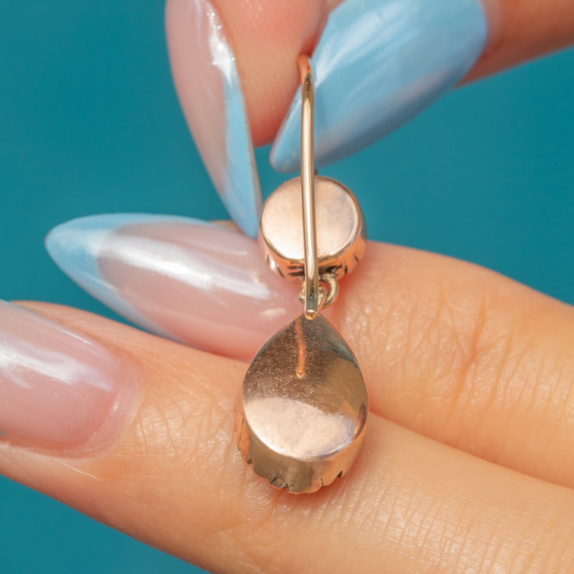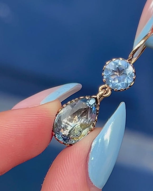 With closed backs, the stones are set in glossy 9ct Gold; the warmth of the Gold effortlessly complements the cool tones of the aqua blue Paste. Dancing with movement as they suspend from elongated hooks, these Georgian earrings are a resplendent antique pair to add to your collection.