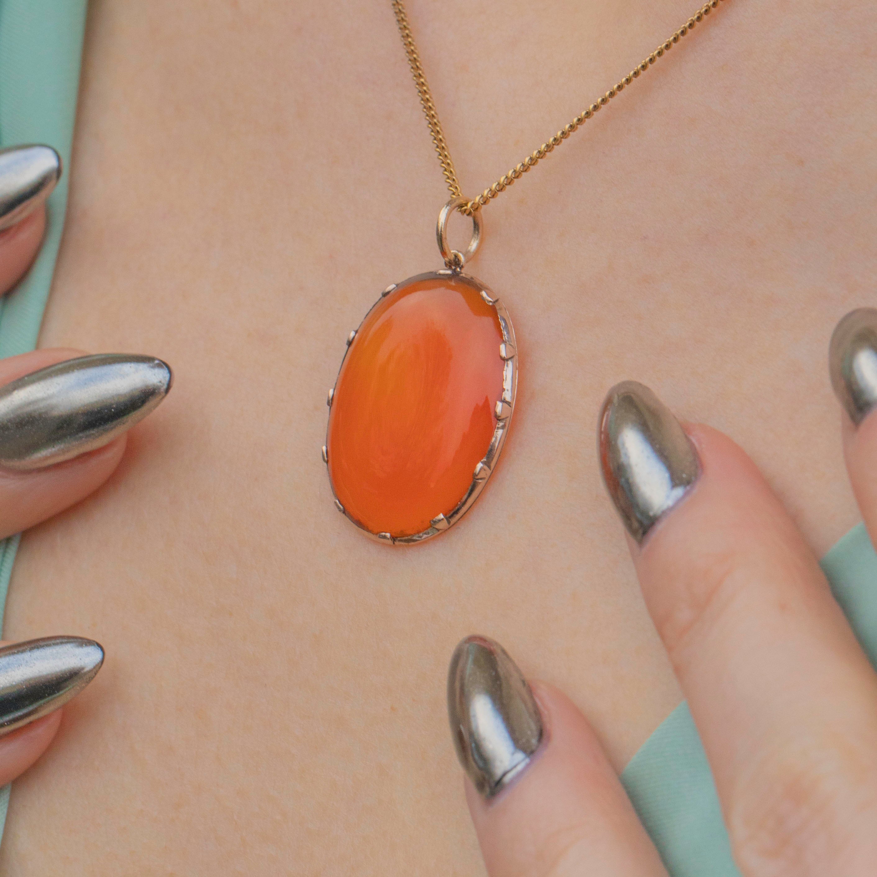 Add a touch of antique charm to any outfit with this captivating Georgian 9ct Gold Carnelian pendant! Securely displayed within classically Georgian pie crust settings sits a smooth Carnelian cabochon, with warm orange tones that beautifully complement the rich hue of the 9ct Gold.