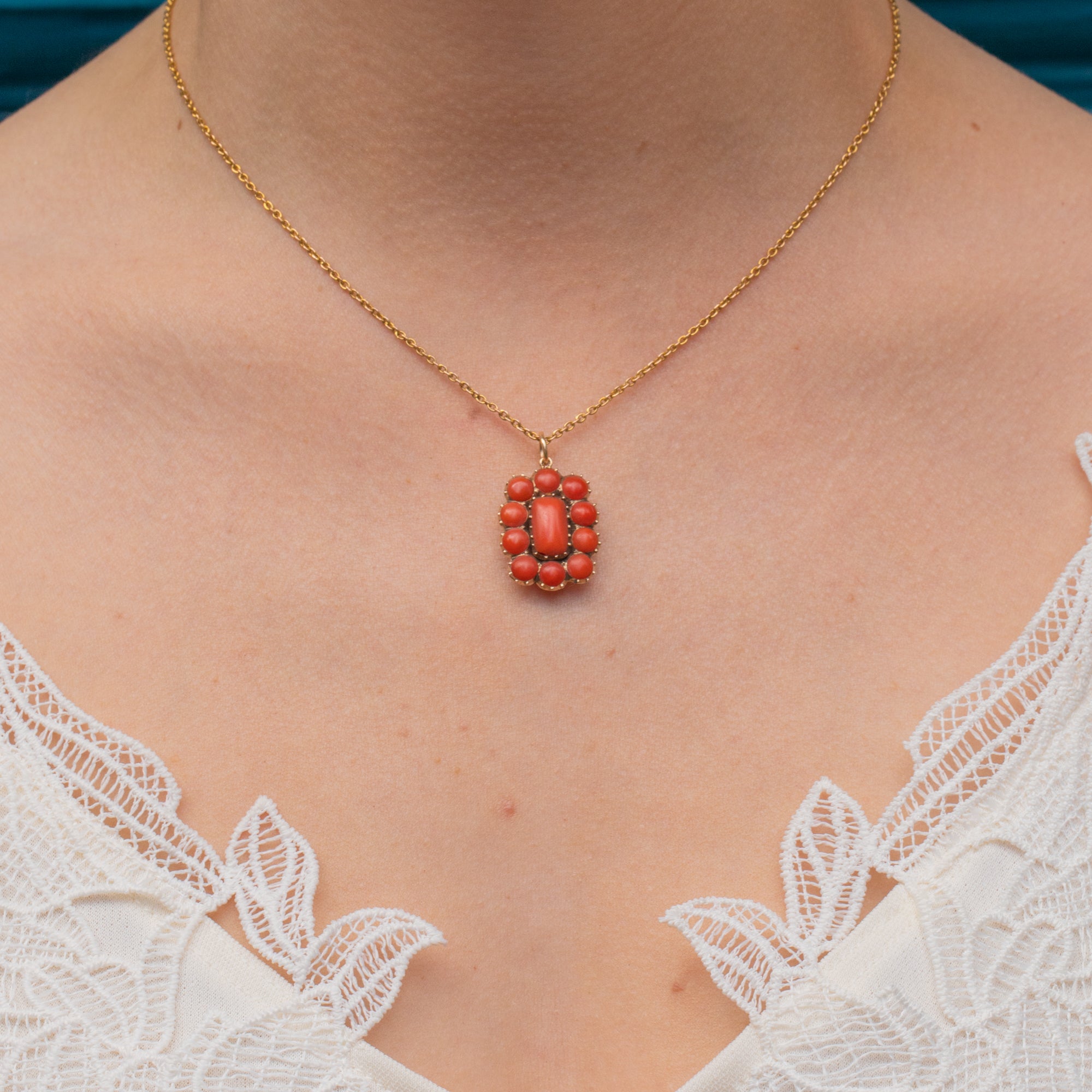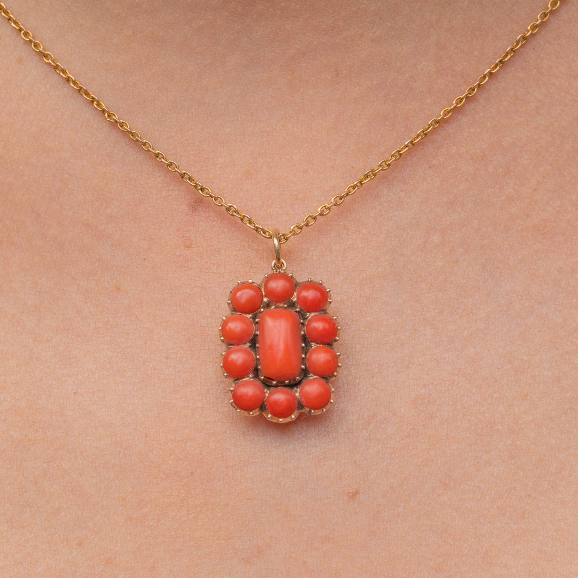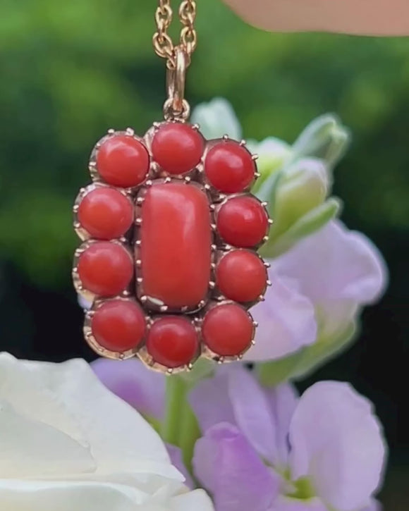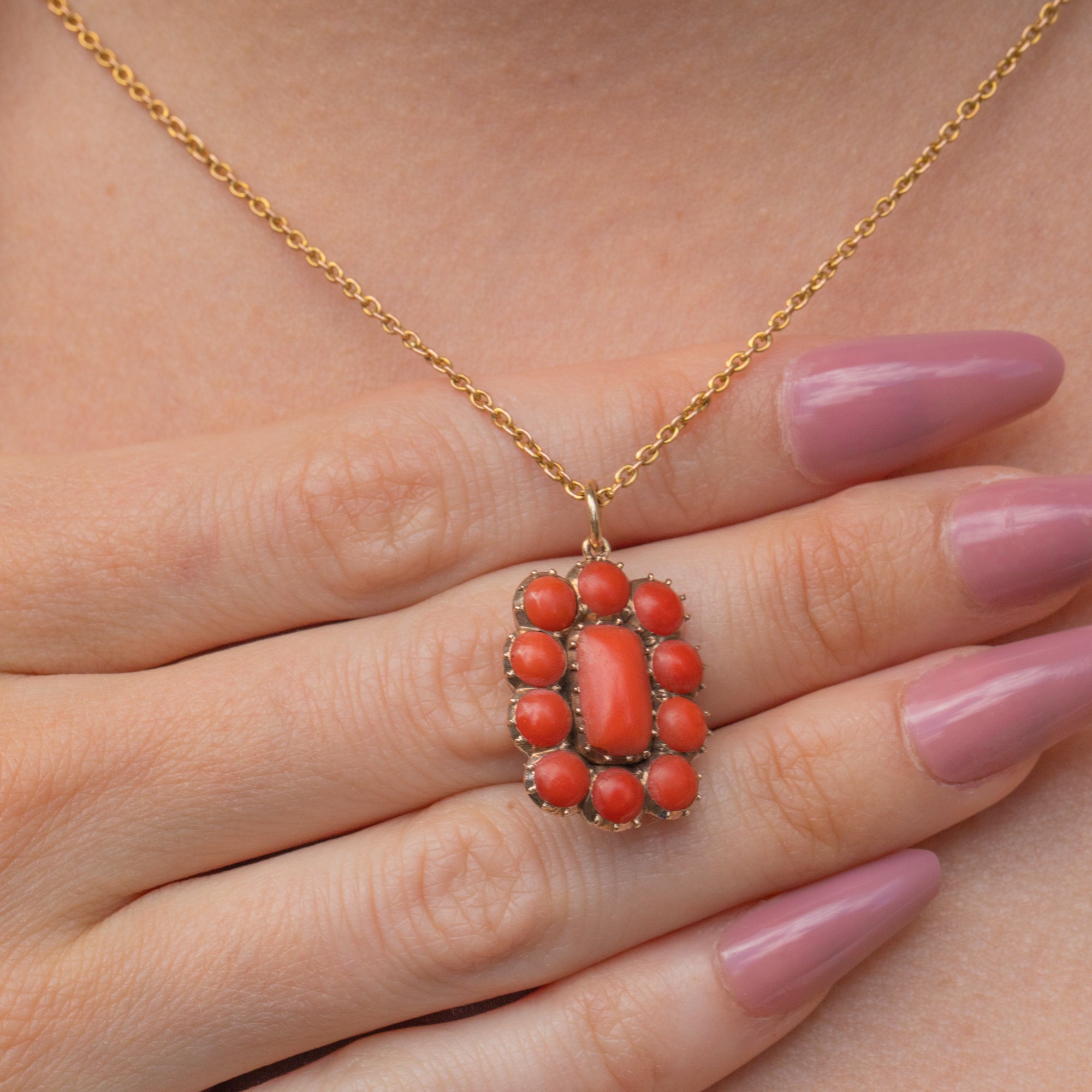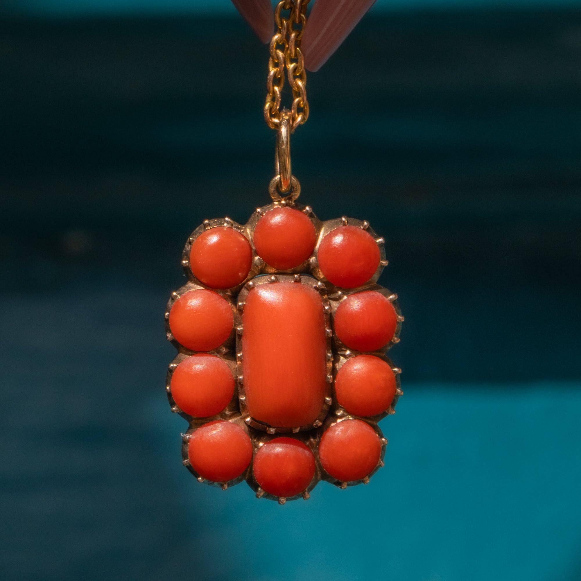 VERY GOOD. This Georgian 9ct Gold Coral cluster pendant is in very good condition. The Coral is all secure within piecrust settings, and although there is some light wear commensurate with her age, they have retained their desirable soft orange hue. The Gold is buttery with only some light surface, which is very subtle and simply adds to the pendant's charm! With a firmly attached jump ring, you can wear this pretty Georgian pendant confidently.