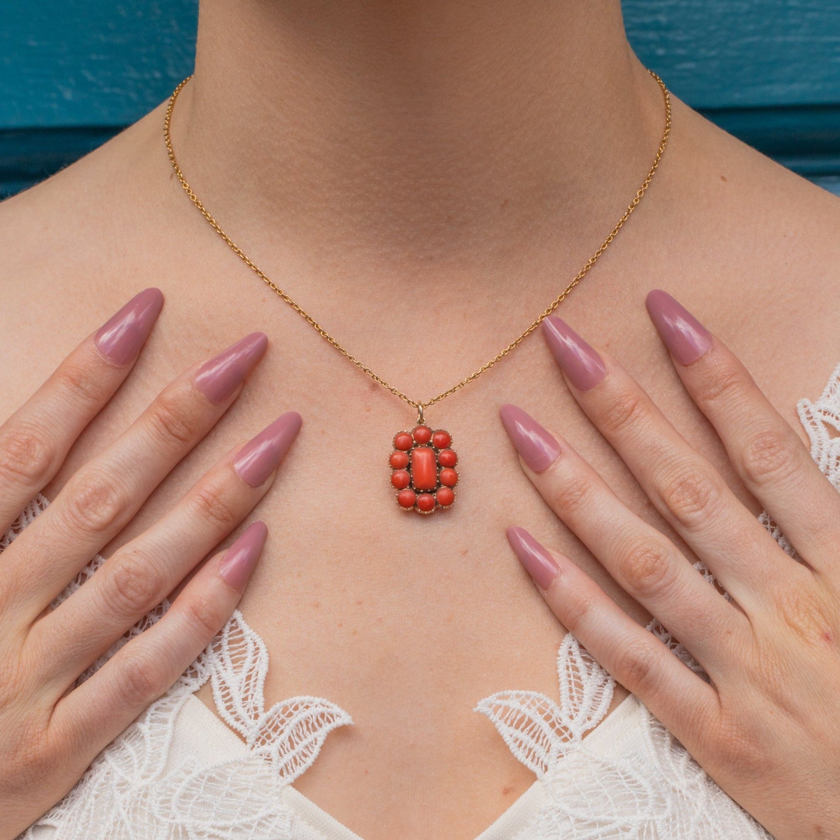 The Coral is smooth and satisfying to touch, set into a bright, champagne-kissed 9ct Gold. What's more, on her reverse she has a secret locket door to hold a trinket of choice inside. A wonderfully dainty size, this antique Coral pendant is bound to brighten up even the darkest of days.