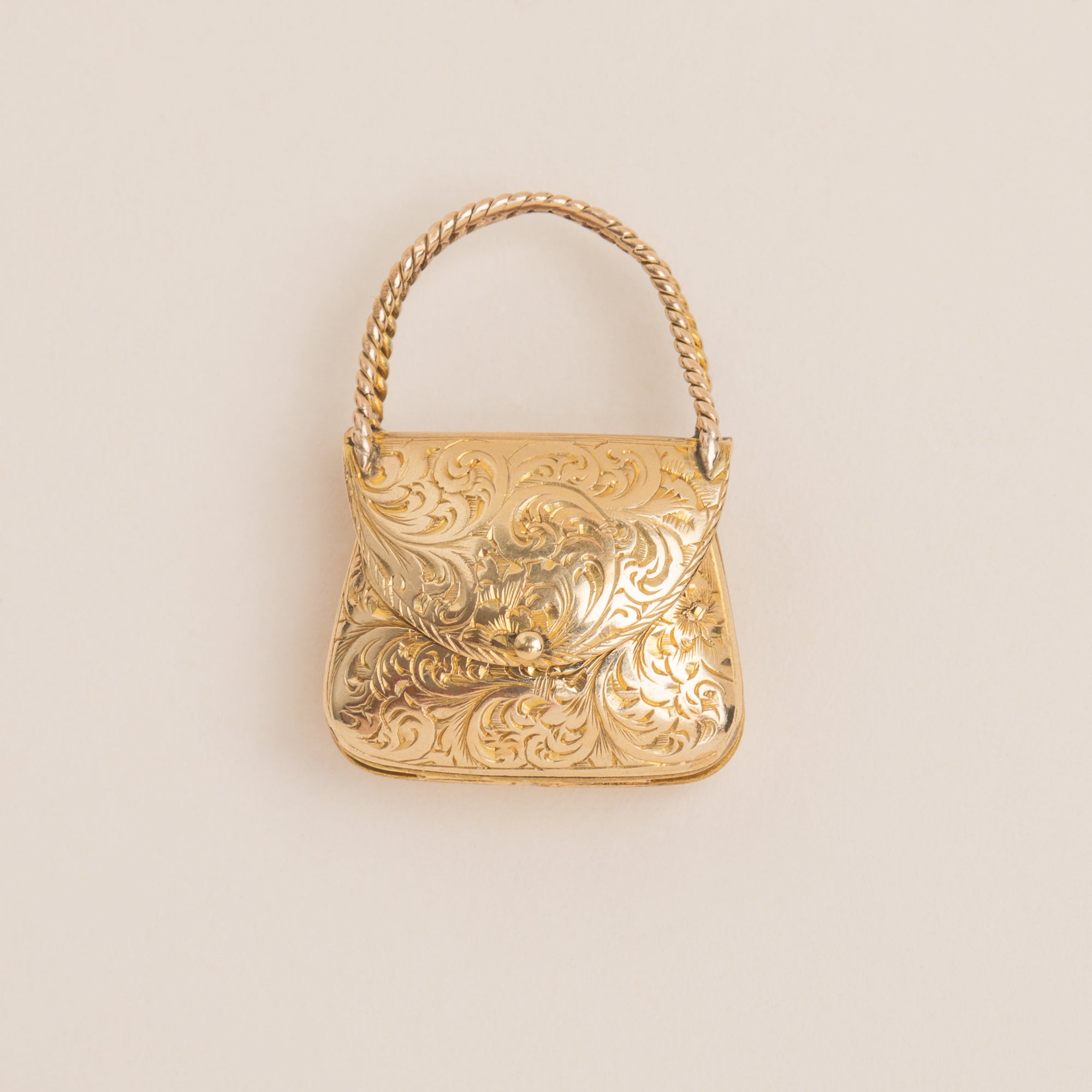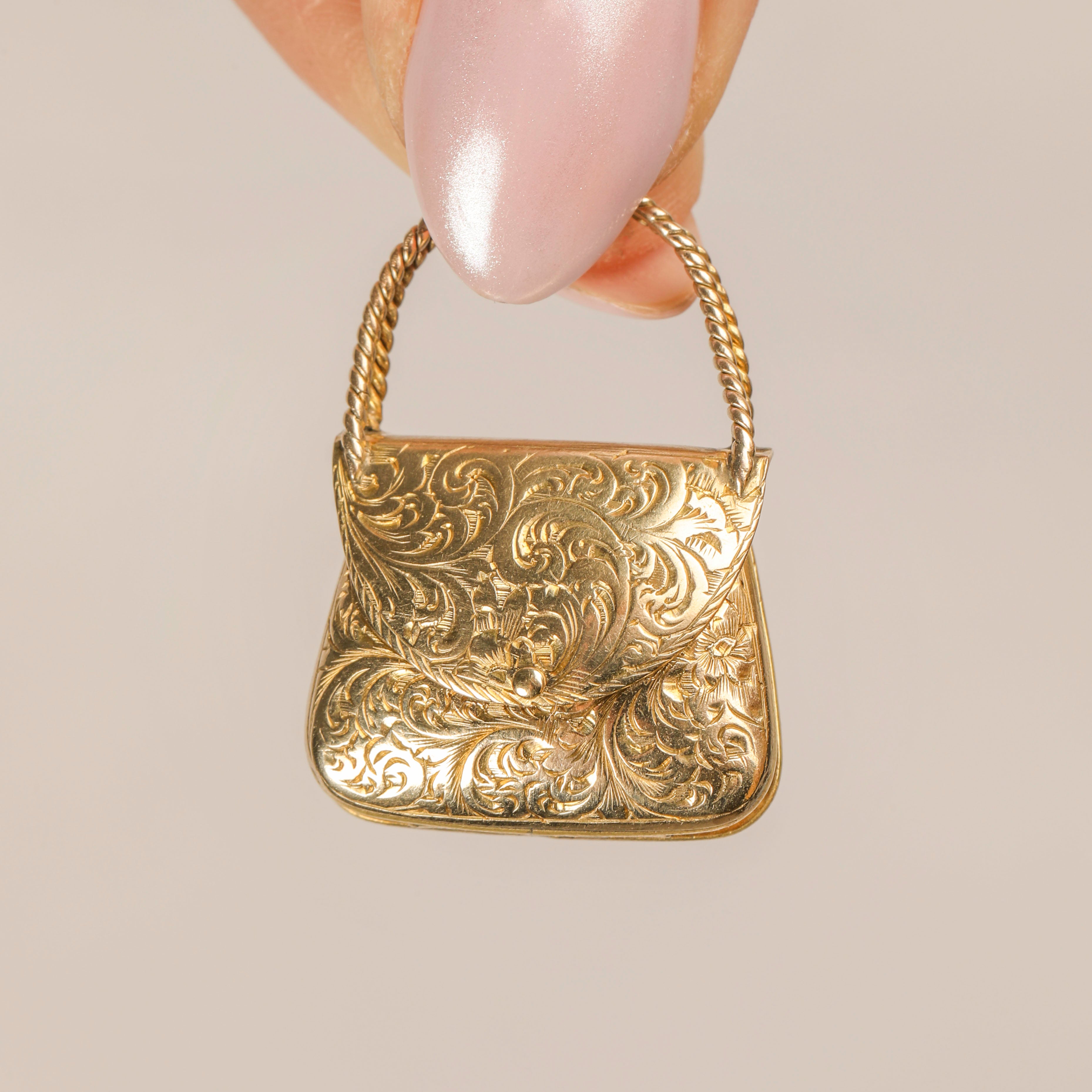 VERY GOOD-EXCELLENT. This Georgian 9ct Gold engraved handbag locket pendant is in wonderful condition! The handbag itself is well formed with the fold of the bag firmly clicking into place. With her engravings crisp form front to back, the slight discolouration and subtle scratch marks to the inside can be forgiven. With securely soldered handles, this opulent handbag can be worn in confidence!