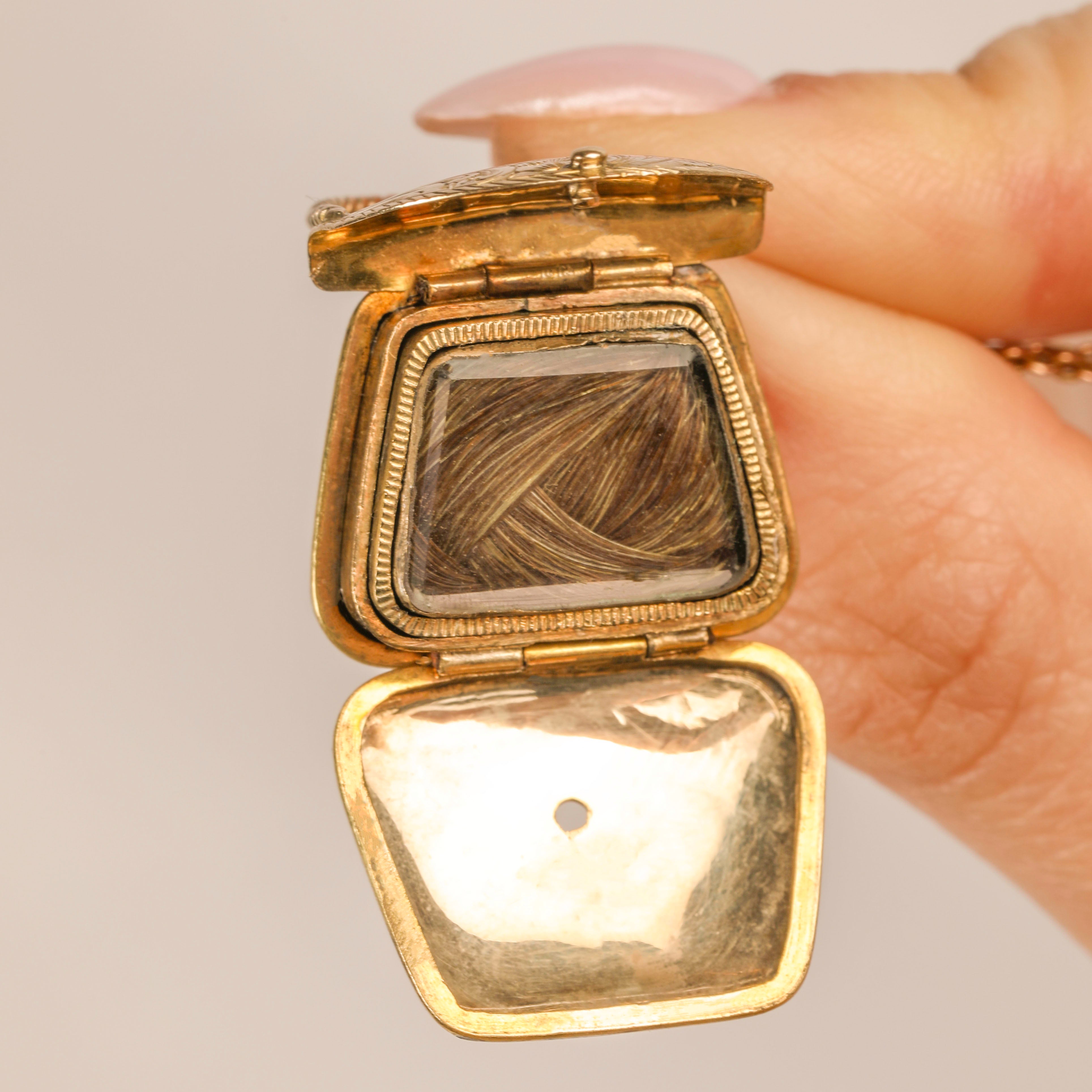 Open this antique handbag pendant to reveal that her sweet, puffy form is filled with a locket compartment containing perfectly woven hair set behind a glass pane. With bundles of antique charm and rich in Georgian sentiment, just imagine how cute this antique Gold pendant will look suspended from any antique Gold chain!
