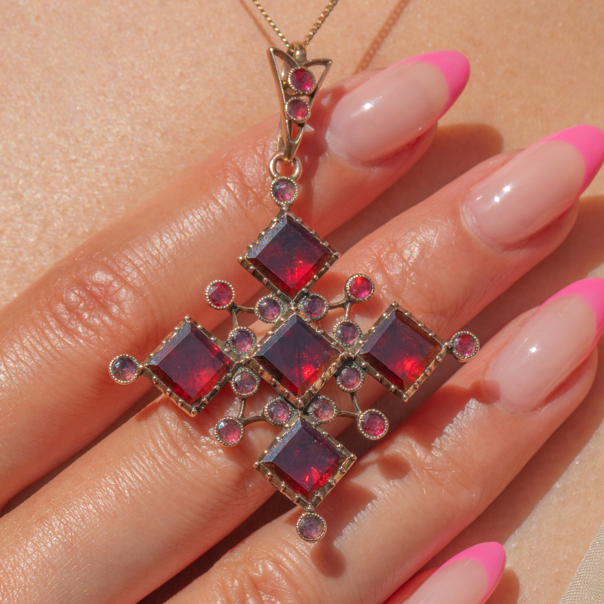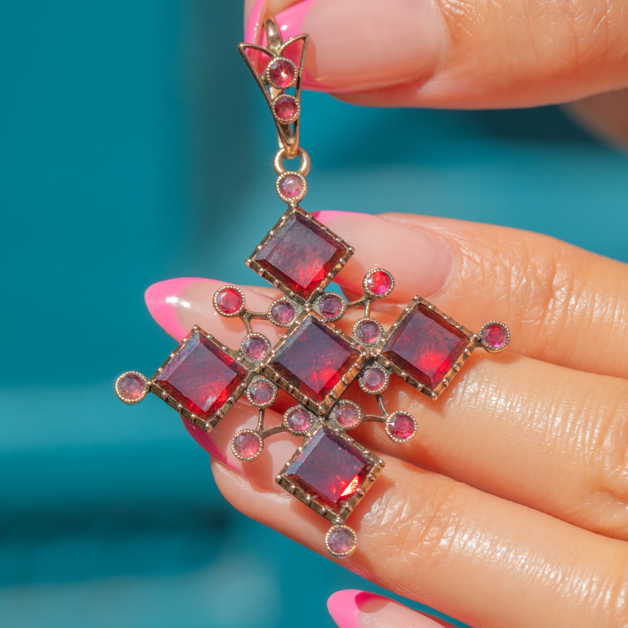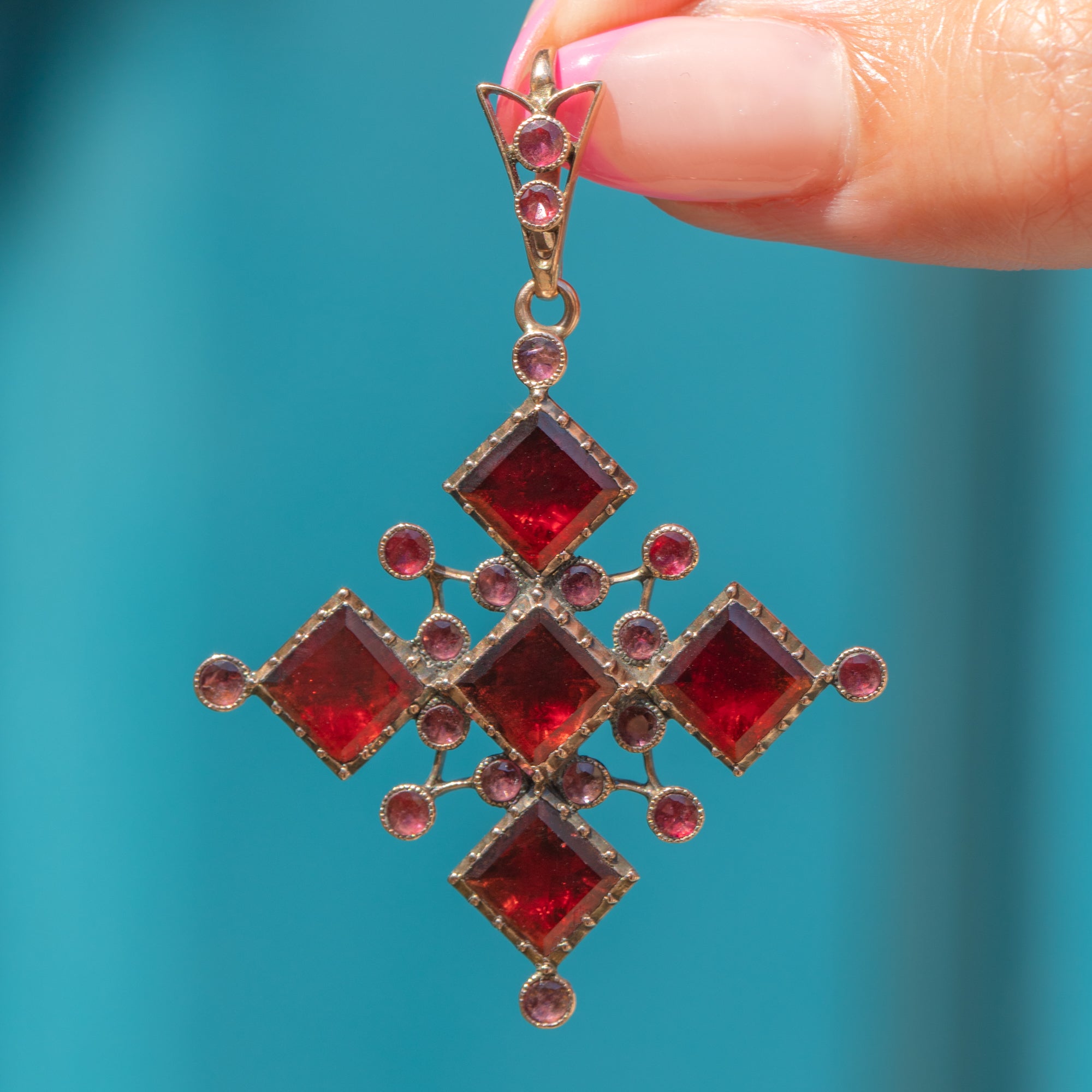 Comprised of eighteen juicy flat-cut sanguine Garnets, this antique pendant is an exemplar of Georgian era craftsmanship. Crafted into a striking cross, her square and round flat-cut Garnets radiate a gorgeous warmth, each displayed within 9ct Gold piecrust settings in classic Georgian style.