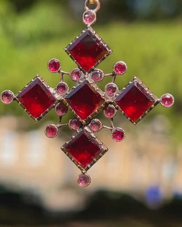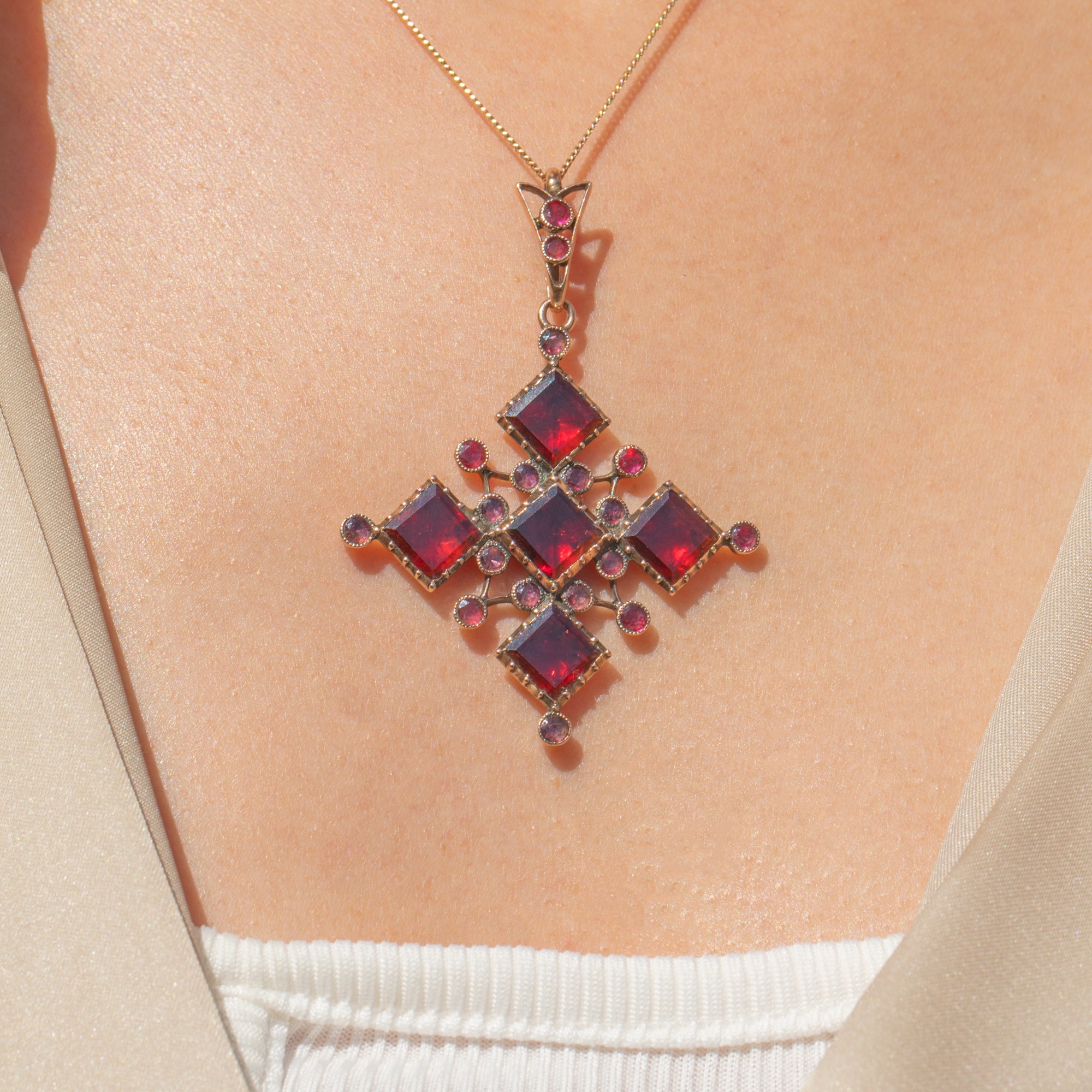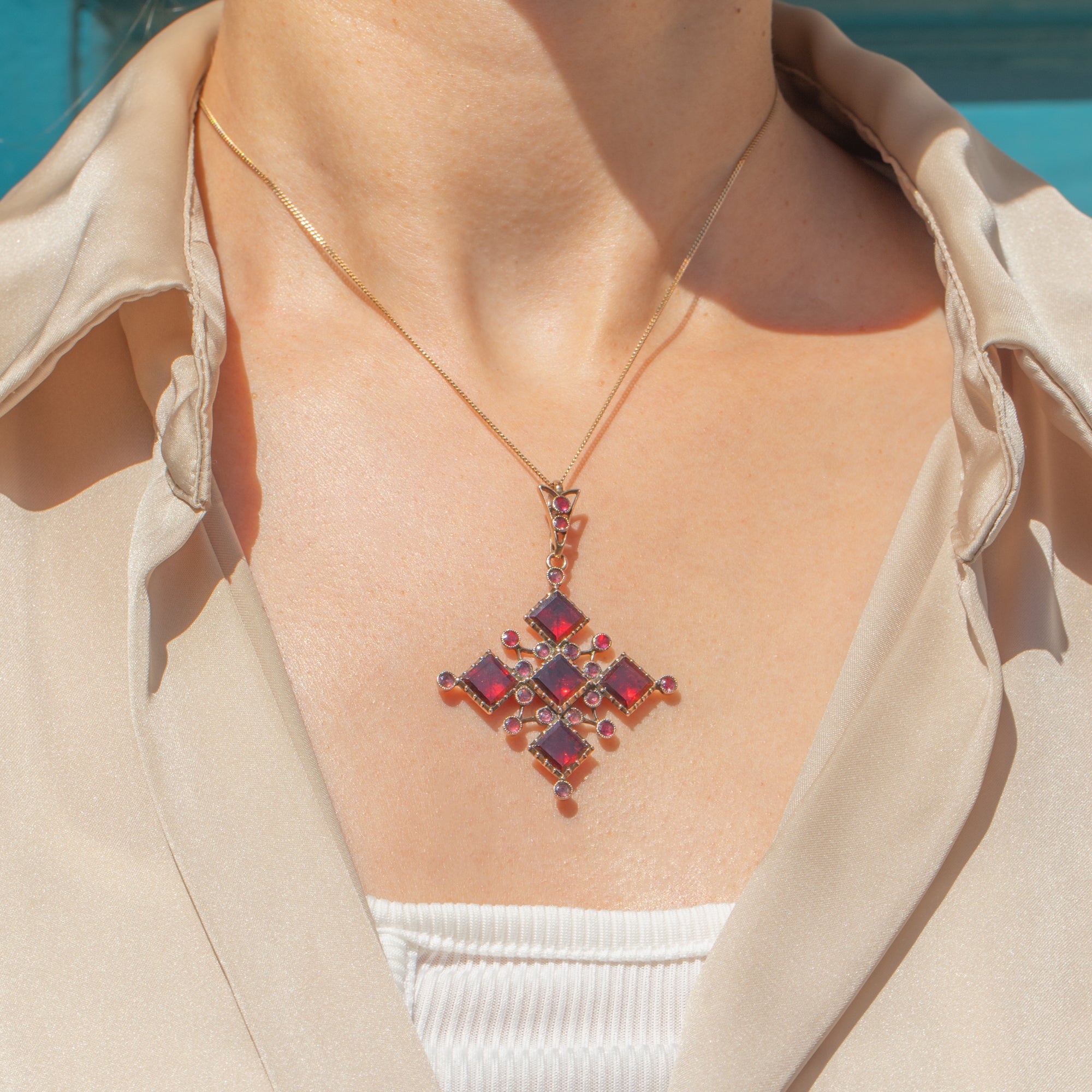 Comprised of eighteen juicy flat-cut sanguine Garnets, this antique pendant is an exemplar of Georgian era craftsmanship. Crafted into a striking cross, her square and round flat-cut Garnets radiate a gorgeous warmth, each displayed within 9ct Gold piecrust settings in classic Georgian style.