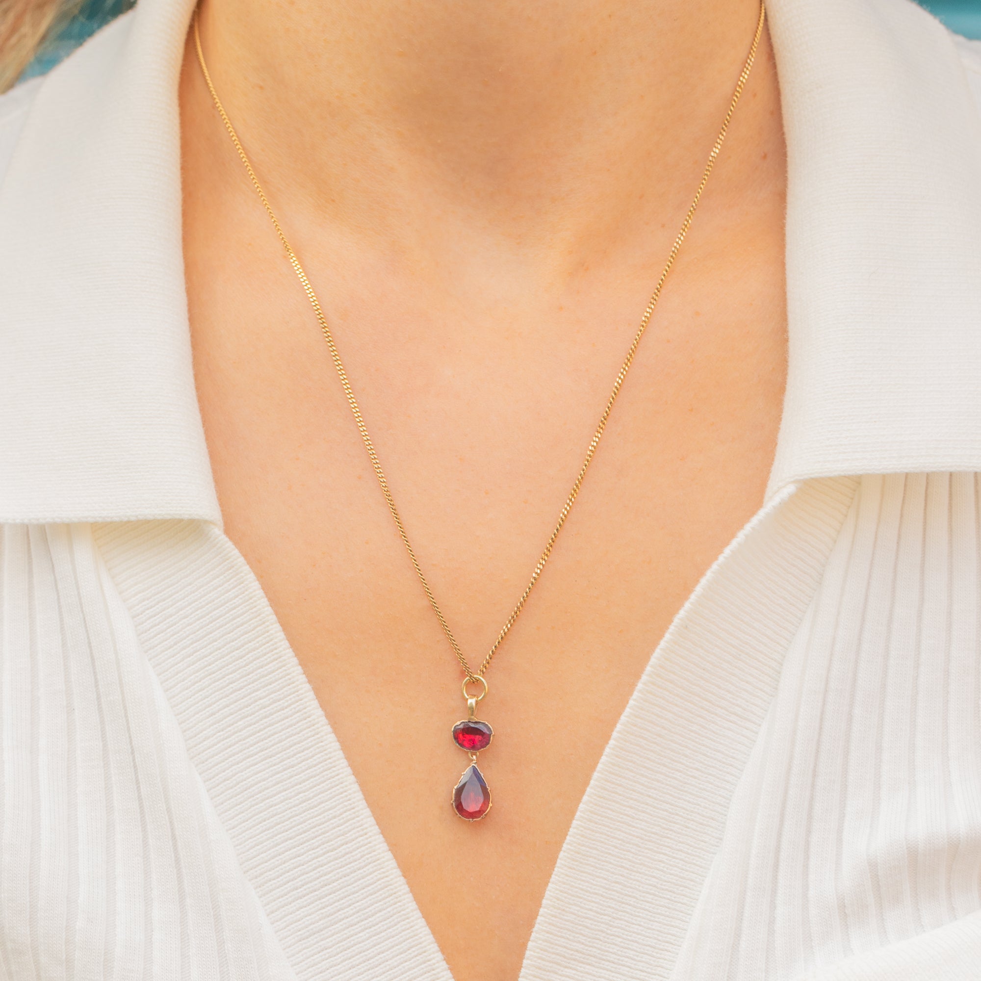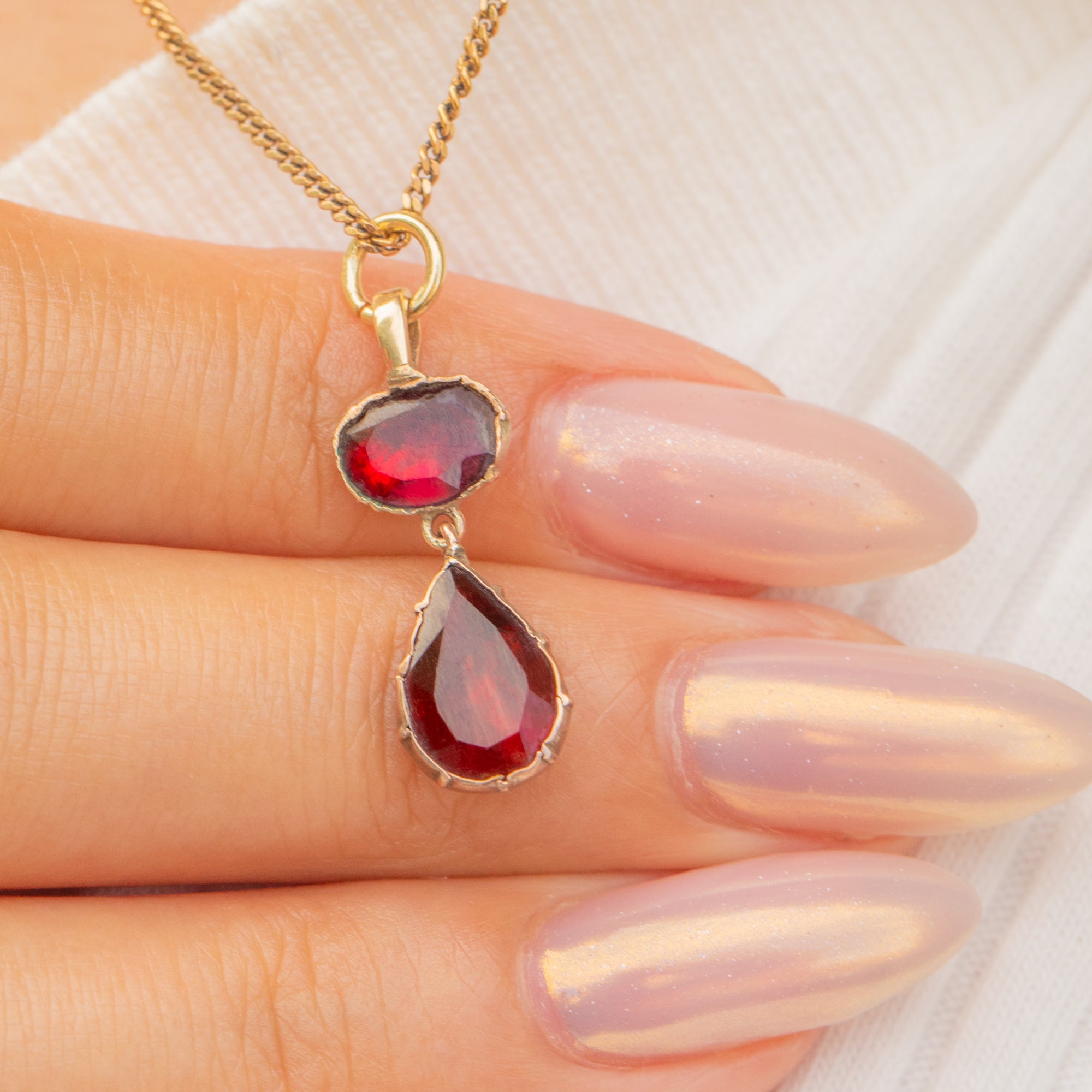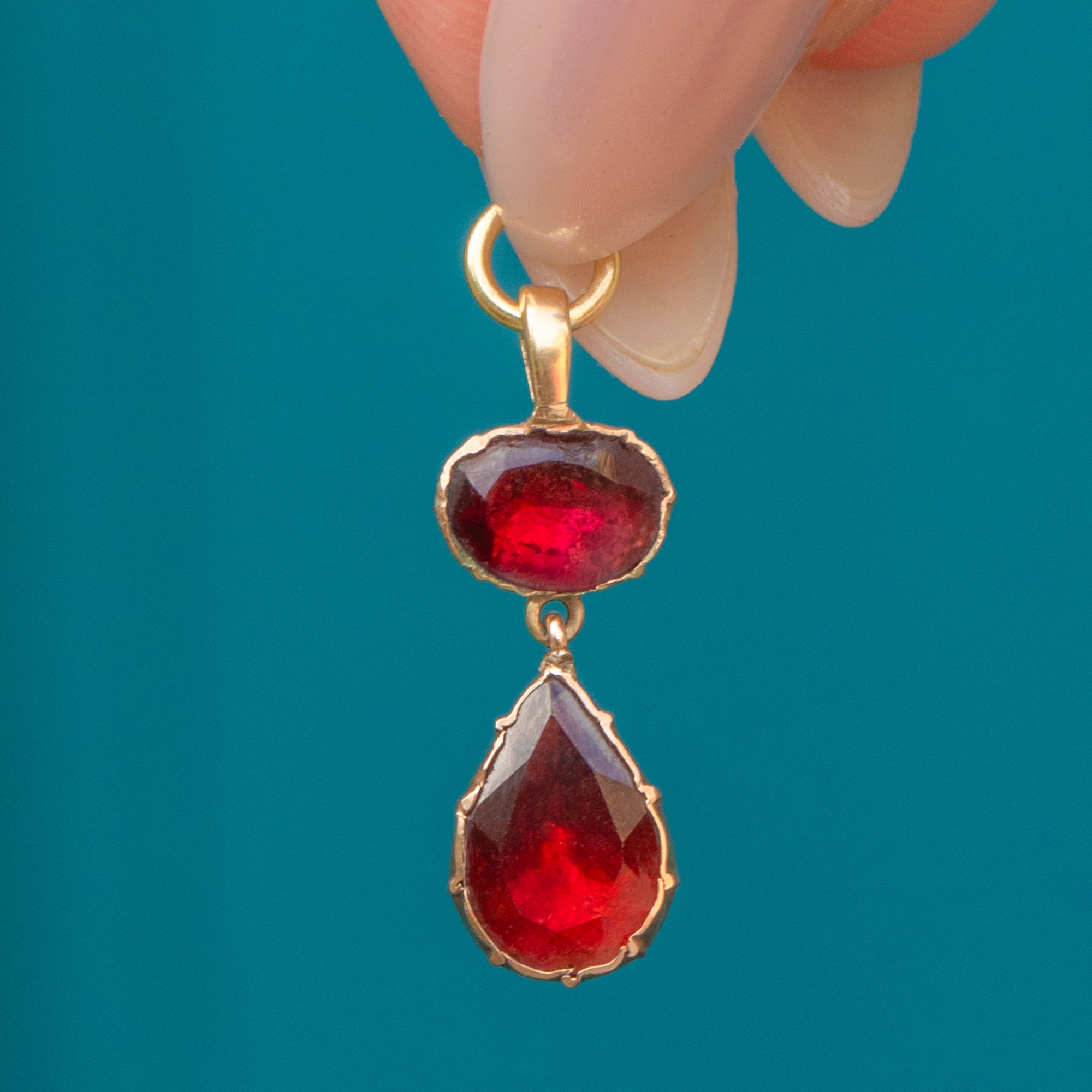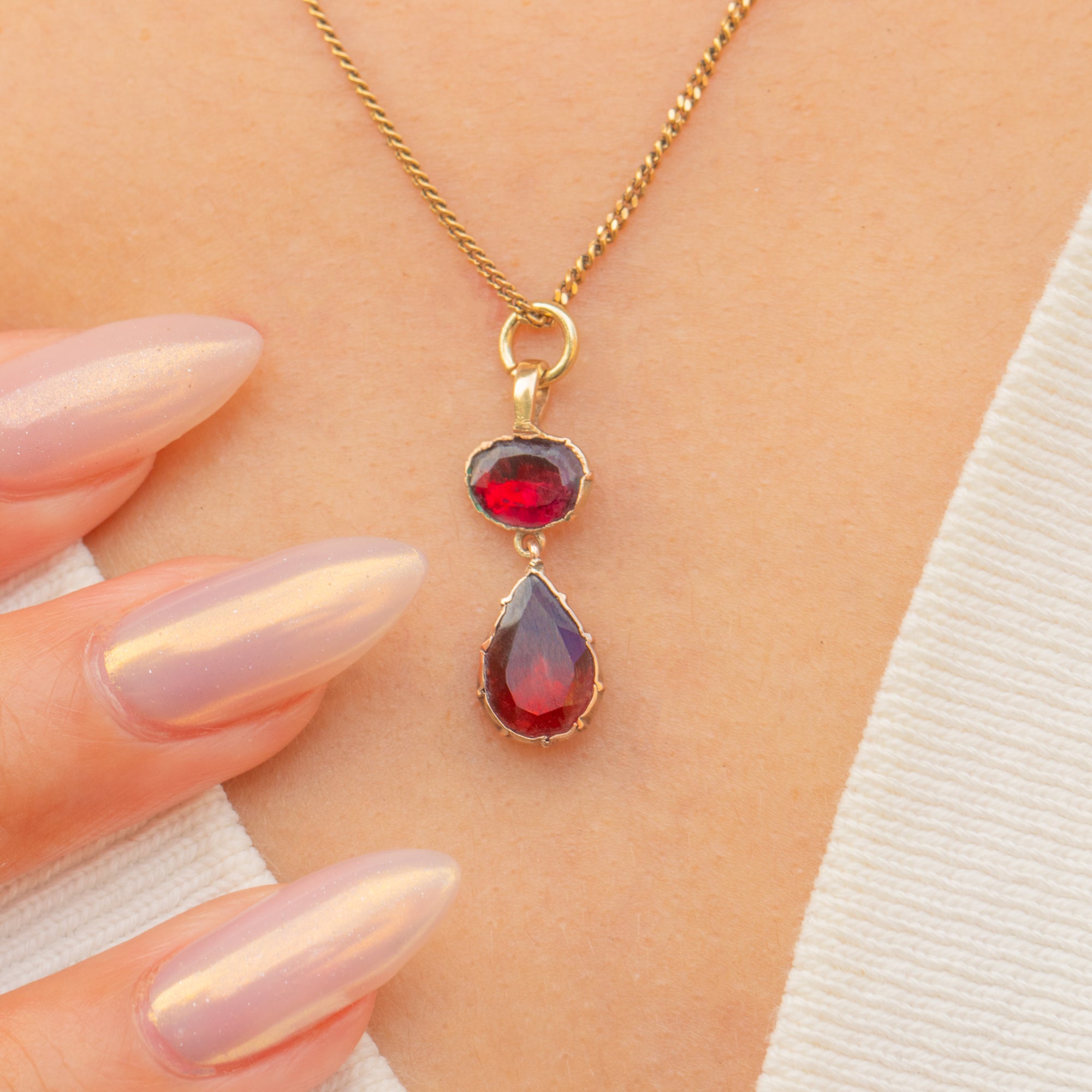 This Georgian charm is set with two glowing flat-cut Garnets in a classic drop arrangement: an oval to the top and a pear-shaped drop beneath. Foil-backed and mounted in traditional cut-down collet settings of 9ct Gold, the stones show that rich claret hue so prized in early 19th-century jewels. A dainty, characterful piece ready to add a pop of Georgian colour to any chain.