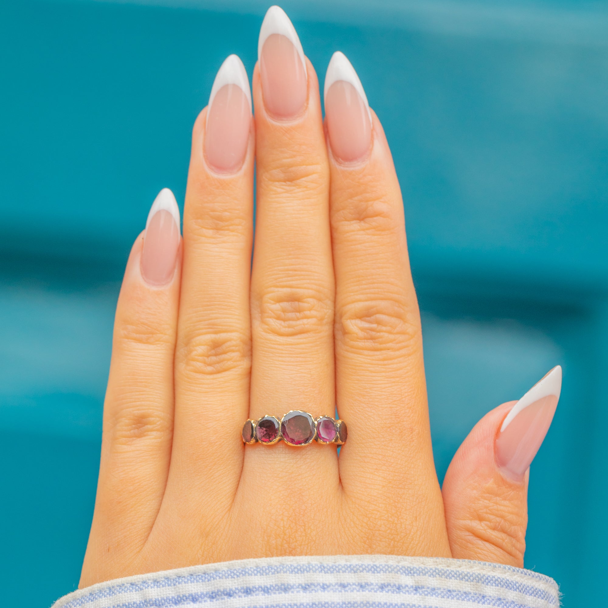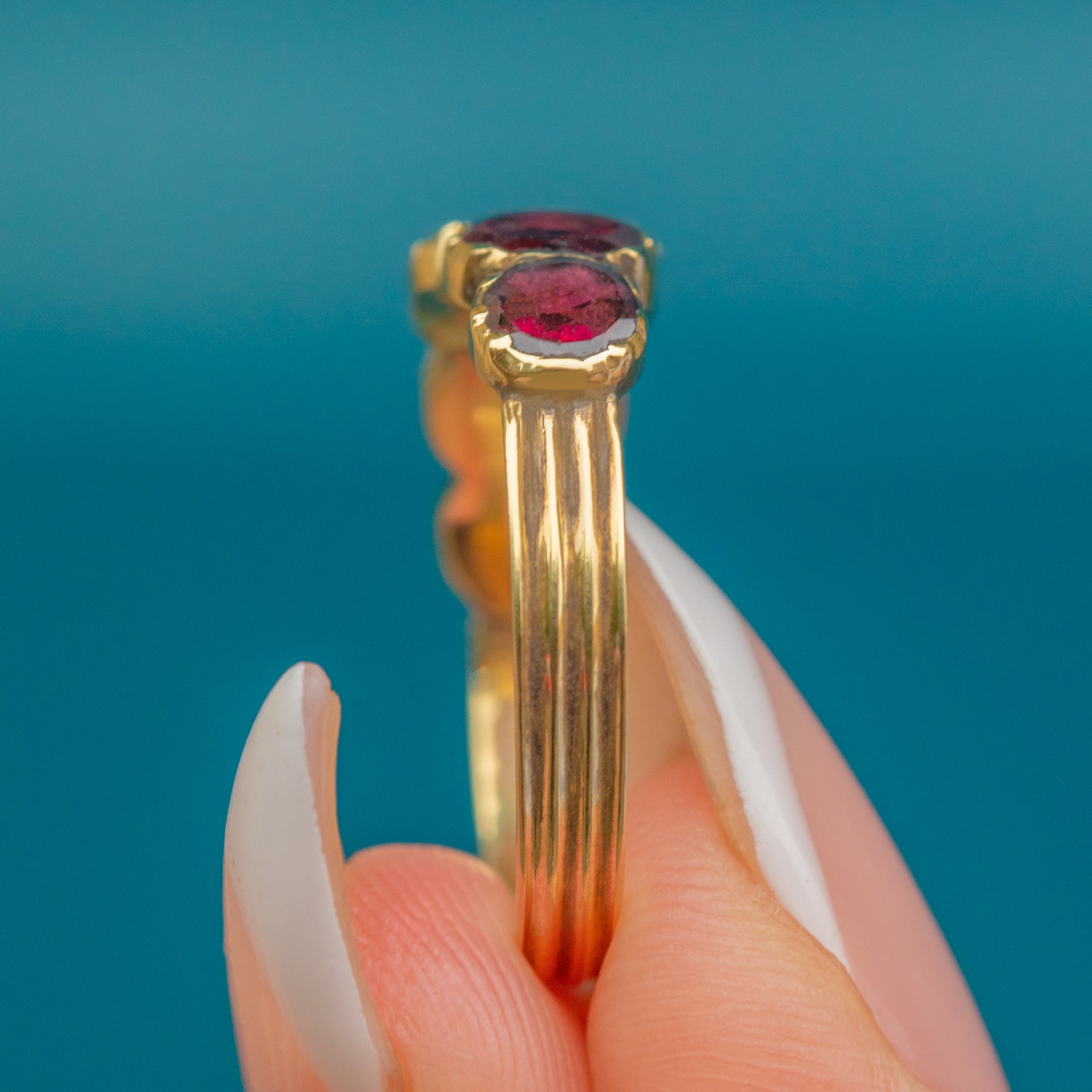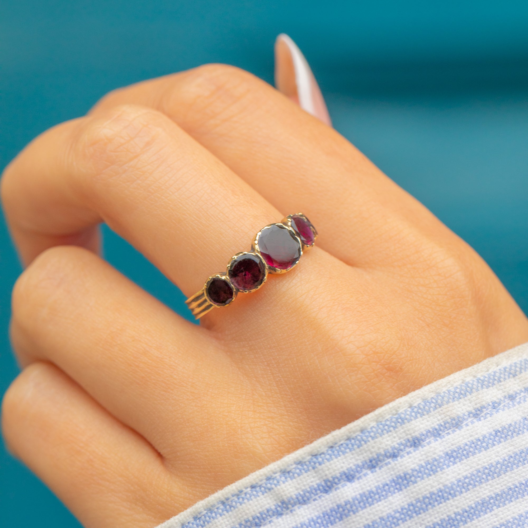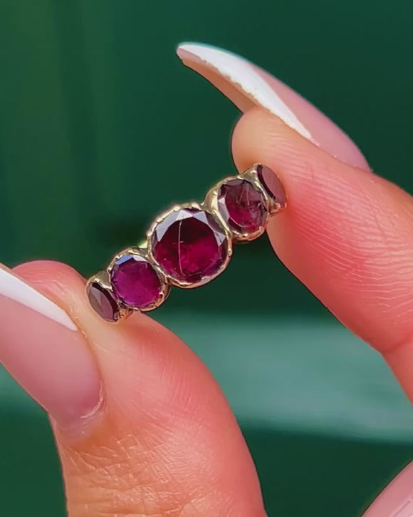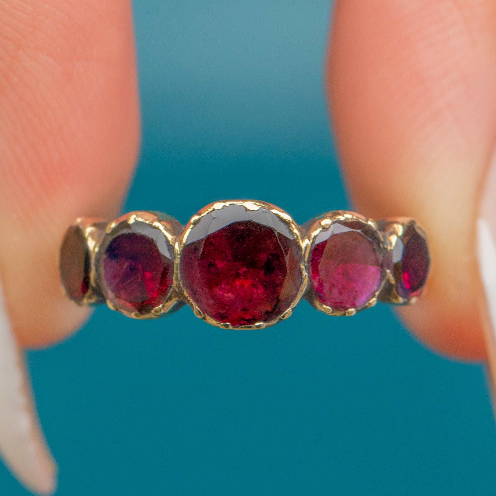 This exquisite Georgian ring is crafted in 9ct Gold and set with glowing flat-cut Garnets in a half-hoop design. Each Garnet is foiled to enhance its deep, rich colour, a hallmark of Georgian jewellery design. The stones graduate in size across the band, creating a balanced and harmonious effect.