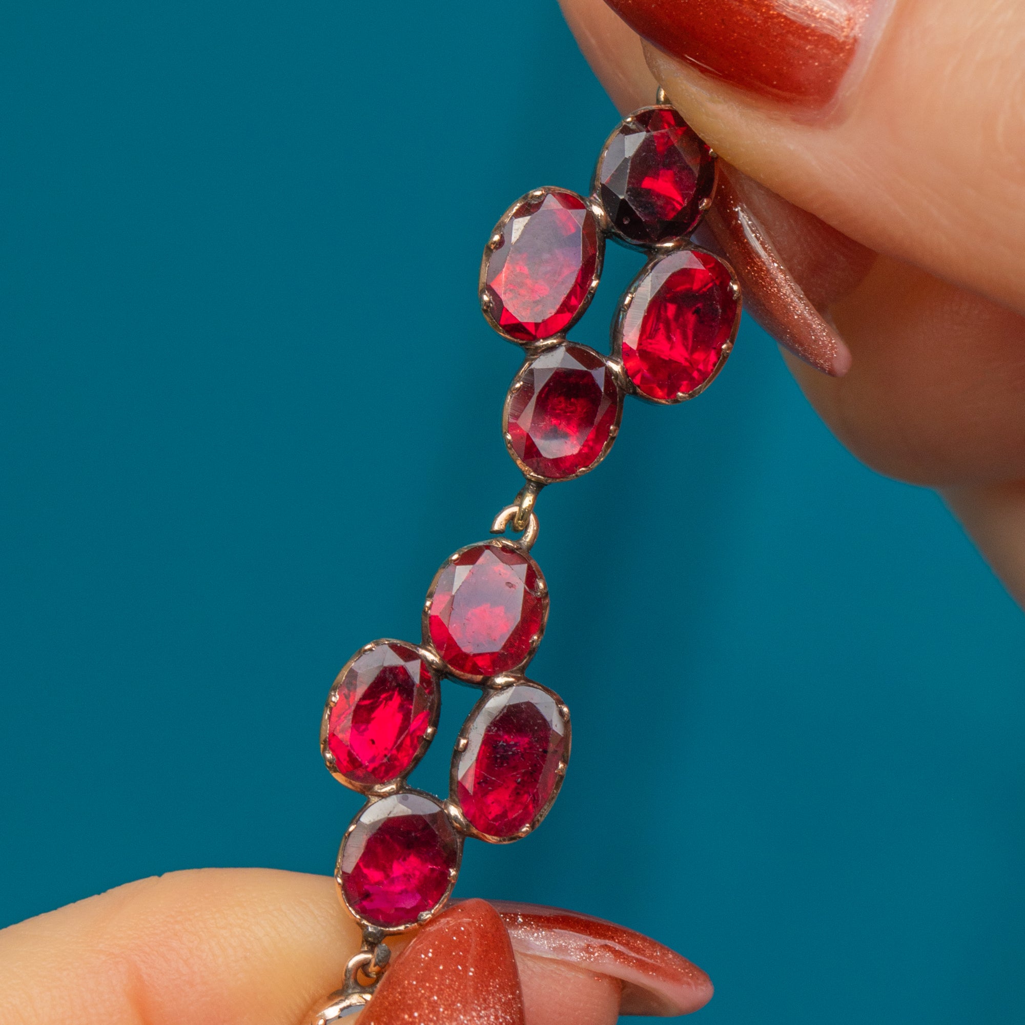 This stunning Georgian 9ct Gold foiled flat-cut Garnet bracelet is a true testament to the craftsmanship of the early 19th century! The bracelet boasts eighteen beautifully foiled flat-cut Garnets with a combined weight of 9.65ct. Each stone is set in classically Goergian piecrust settings that enhance their rich, glowing hue.
