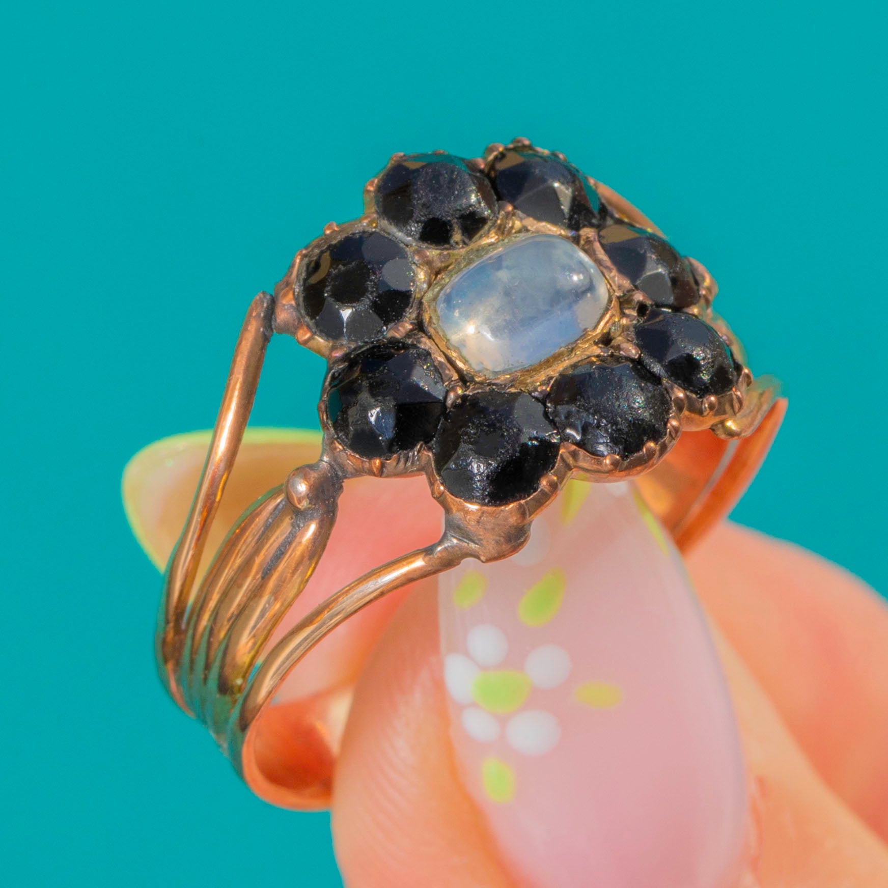 Georgian 9ct Gold Foiled Moonstone French Jet Cluster Ring c.1820
