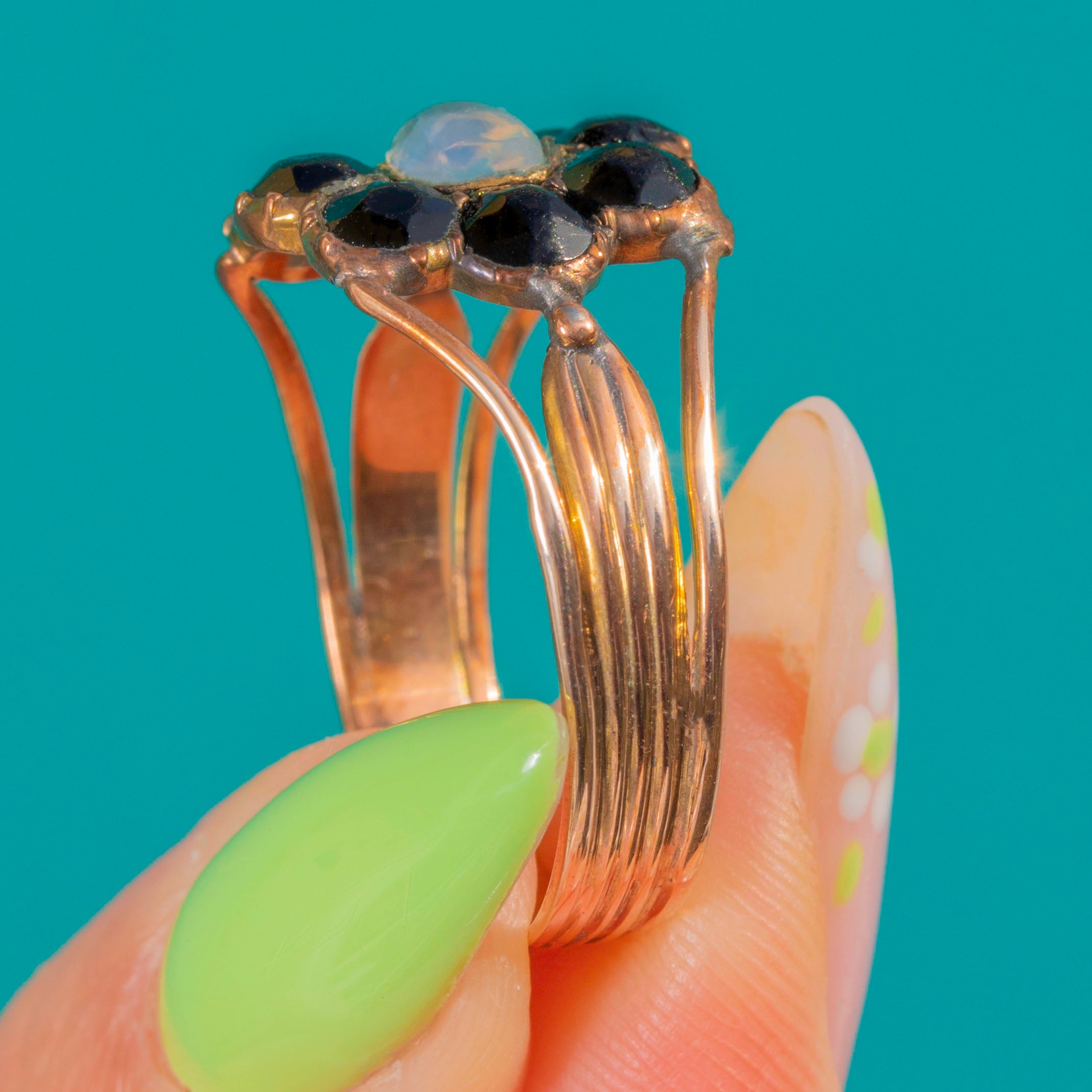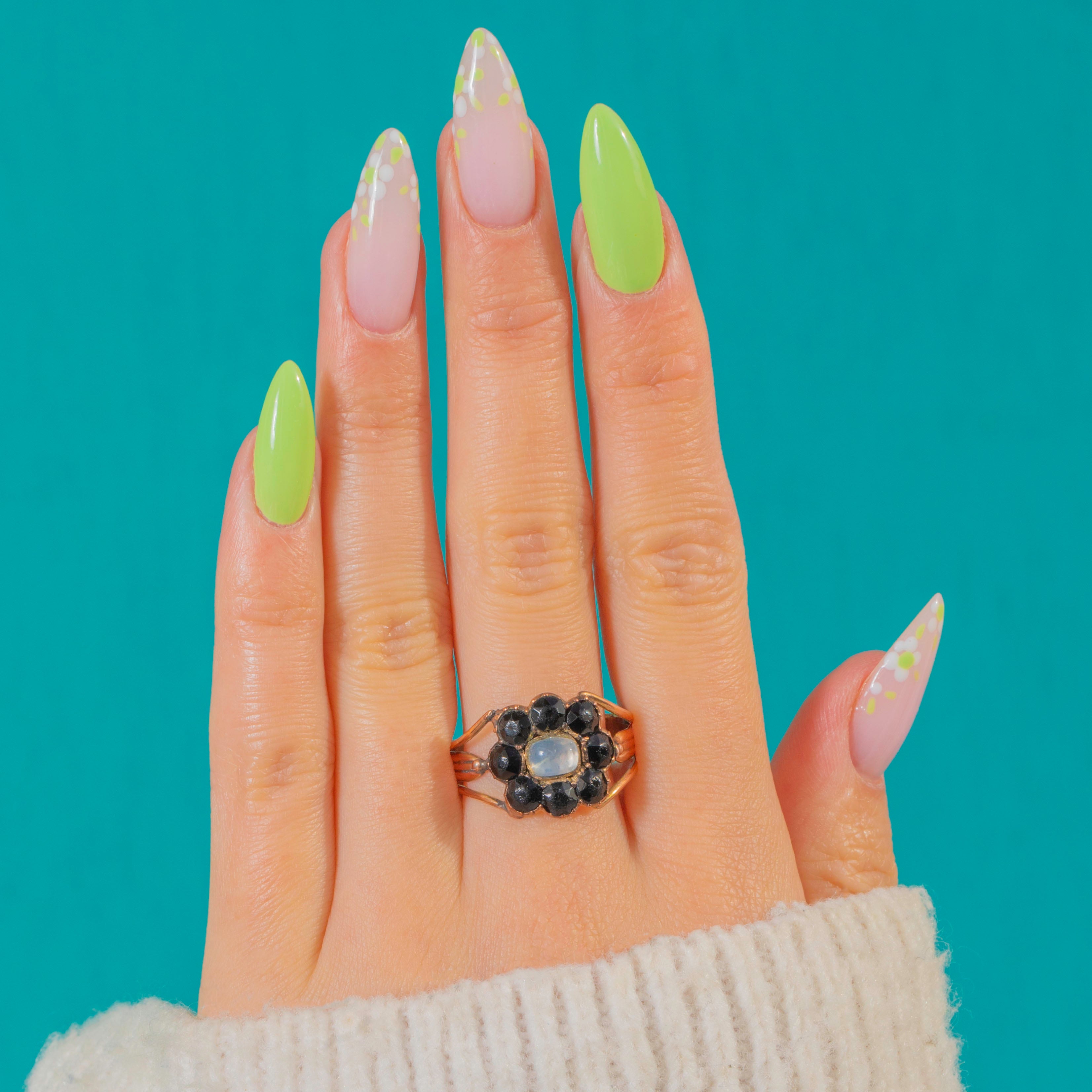 A luminous foiled Moonstone glows at the heart of this Georgian cluster ring, its ethereal sheen framed by a halo of inky French Jet. Crafted in warm 9ct Gold, the daisy-like rosette silhouette is both delicate and striking, offering that magical light-and-dark contrast so beloved of early 19th-century jewels.
