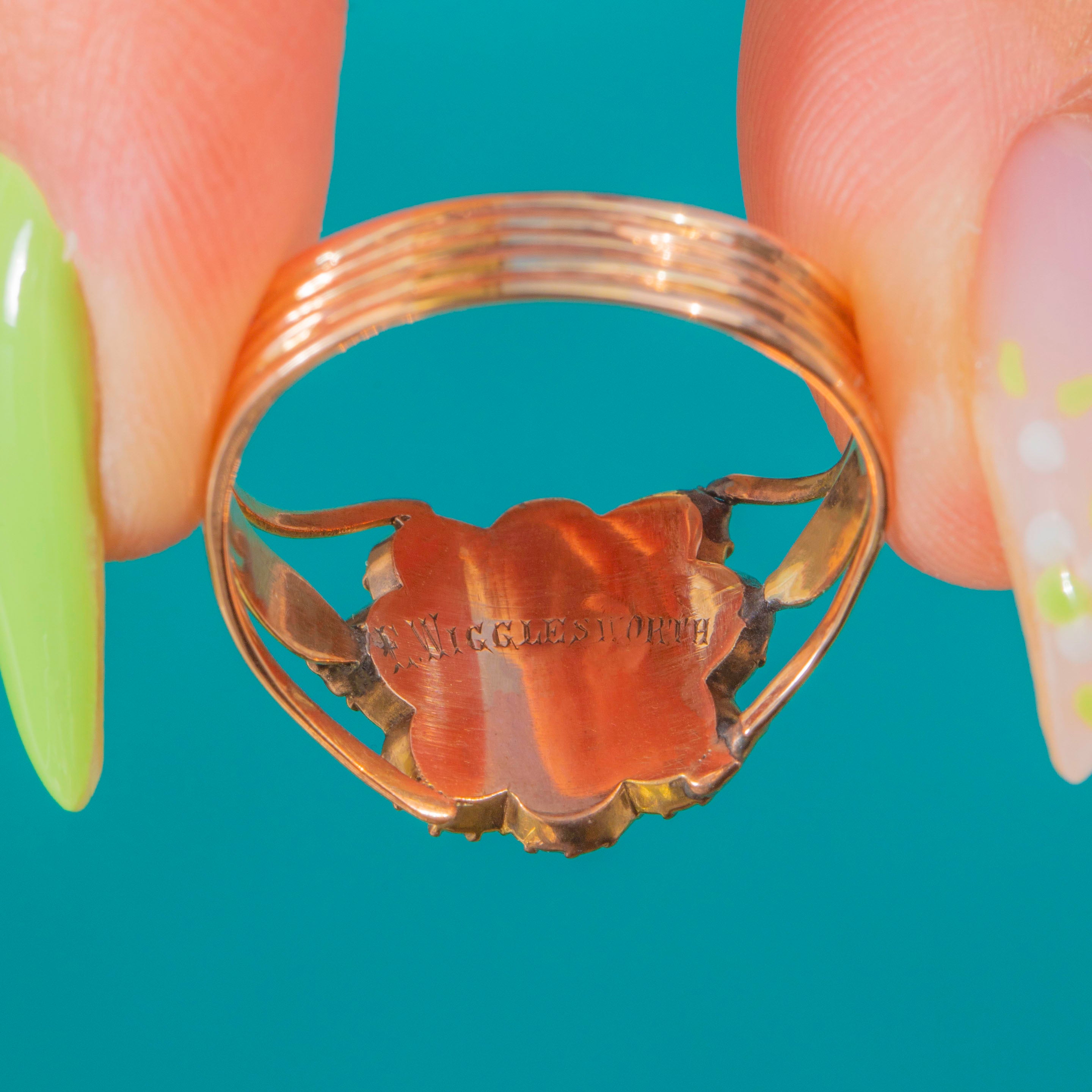 Details abound: scalloped collets, a pretty pierced gallery and a split multi-wire shank that converges gracefully at the shoulders. Inside the band, an engraved “E. Wigglesworth” adds a touch of romance and provenance, making this jewel as personal as it is beautiful.
