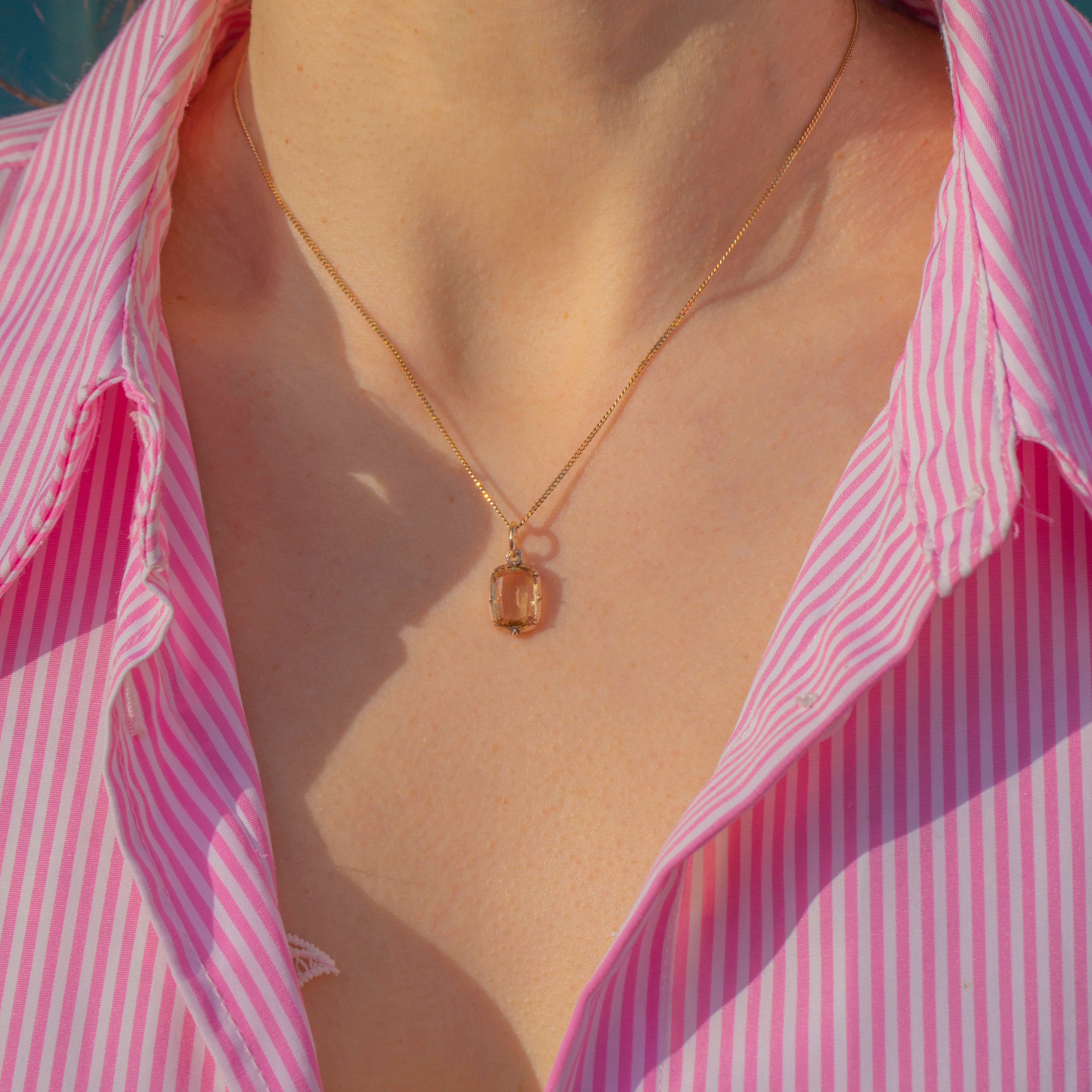 VERY GOOD. This Georgian 9ct gold topaz charm is in very good condition, with only minimal signs of wear that are typical for a piece of this age. The Topaz remains vibrant and securely set, and the gold retains its beautiful hue. There are light surface marks, which do not affect the charm's overall appeal or integrity. The Gold is brightly saturated and the generously sized jump ring will allow you to suspend this treasure from a skinny Gold chain with ease!