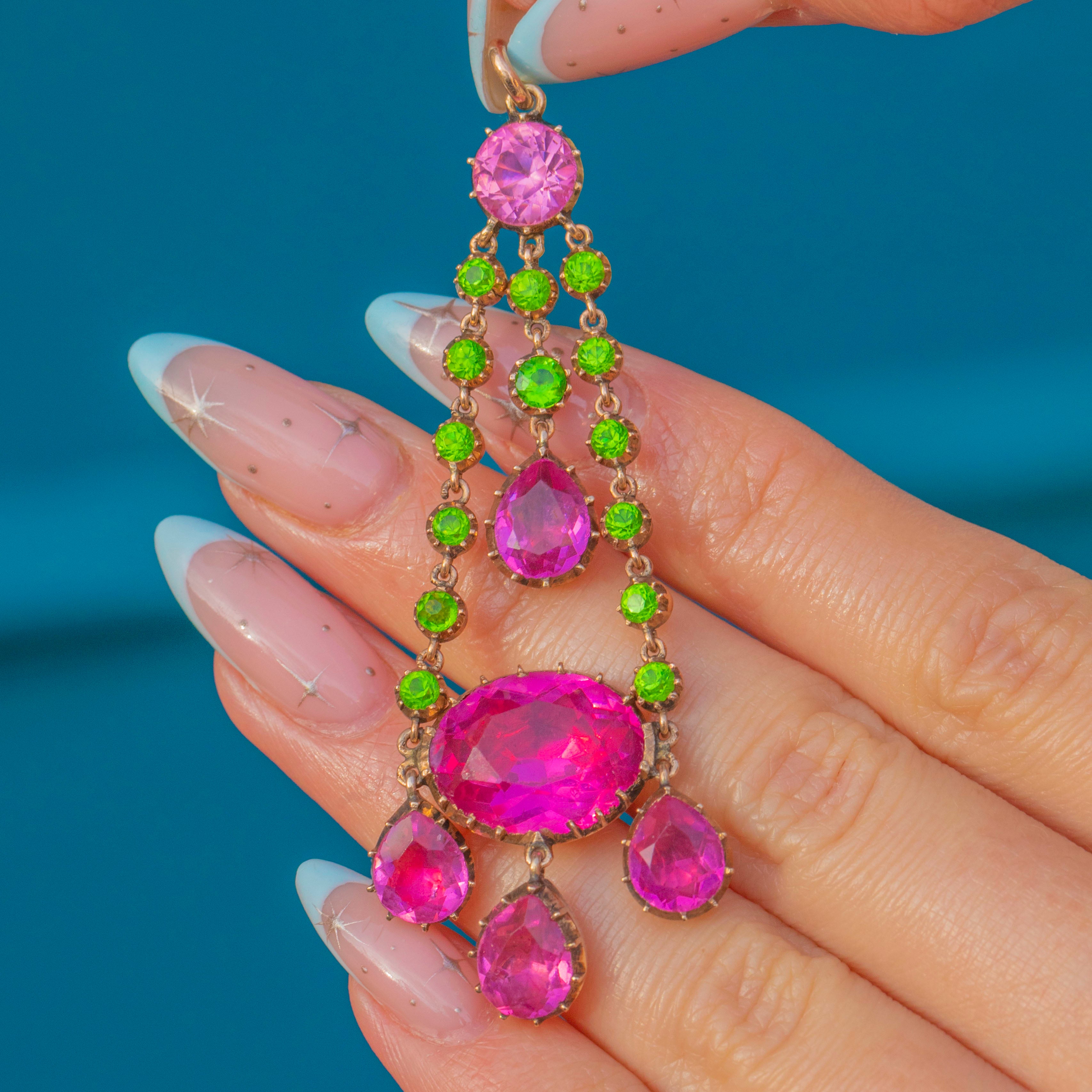 A joyous burst of colour from the Georgian era, this articulated girandole pendant pairs vivid fuchsia‑pink Paste with bright apple‑green Paste in a beautifully balanced, chandelier silhouette. Two tapering rails of petite green rounds frame larger pink stones, culminating in a statement oval and three pear‑shaped drops, all linked for lively movement and enchanting sparkle.