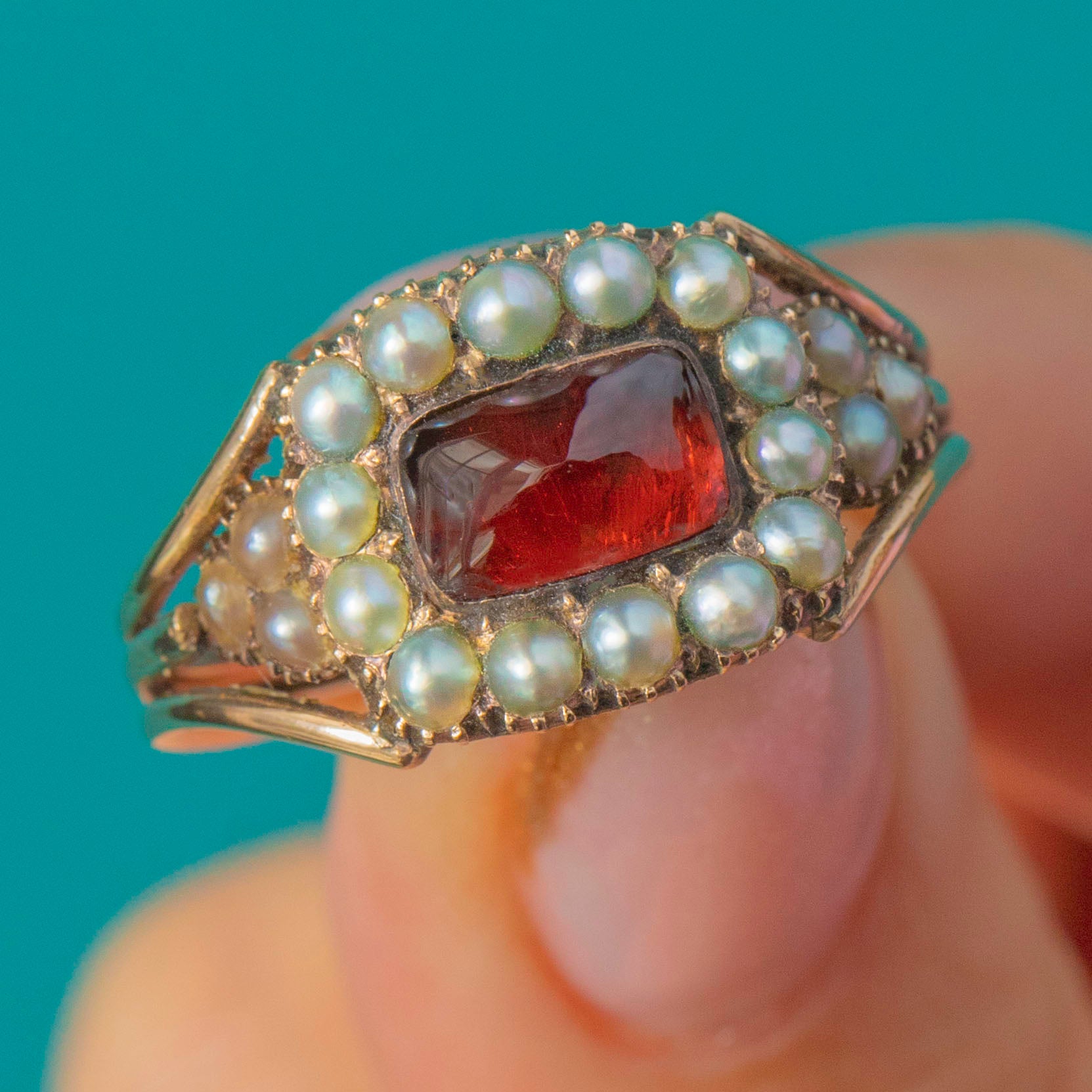 EXCELLENT: Circa 1820, this authentic antique Georgian ring is in outstanding condition for its age. The Garnet is free from chips or scratches and displays a rich, even colour. The Pearls retain their natural lustre with no damage or wear visible. A beautifully preserved antique ring of exceptional quality and charm.