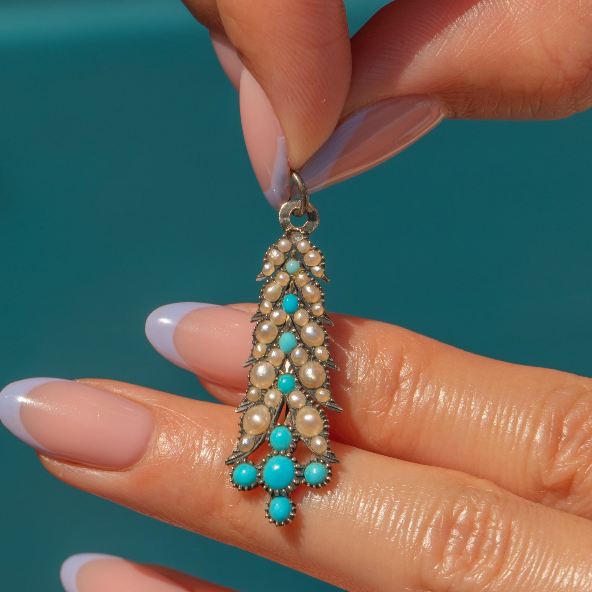 Crafted from a myriad of lustrous Pearls interspersed with vibrant Turquoise stones, this Georgian pendant is packed with antique charm! She is crafted wonderfully from 9ct Gold and has a nice, fluid movement. This antique pendant will look lovely suspended from a fine Gold chain!