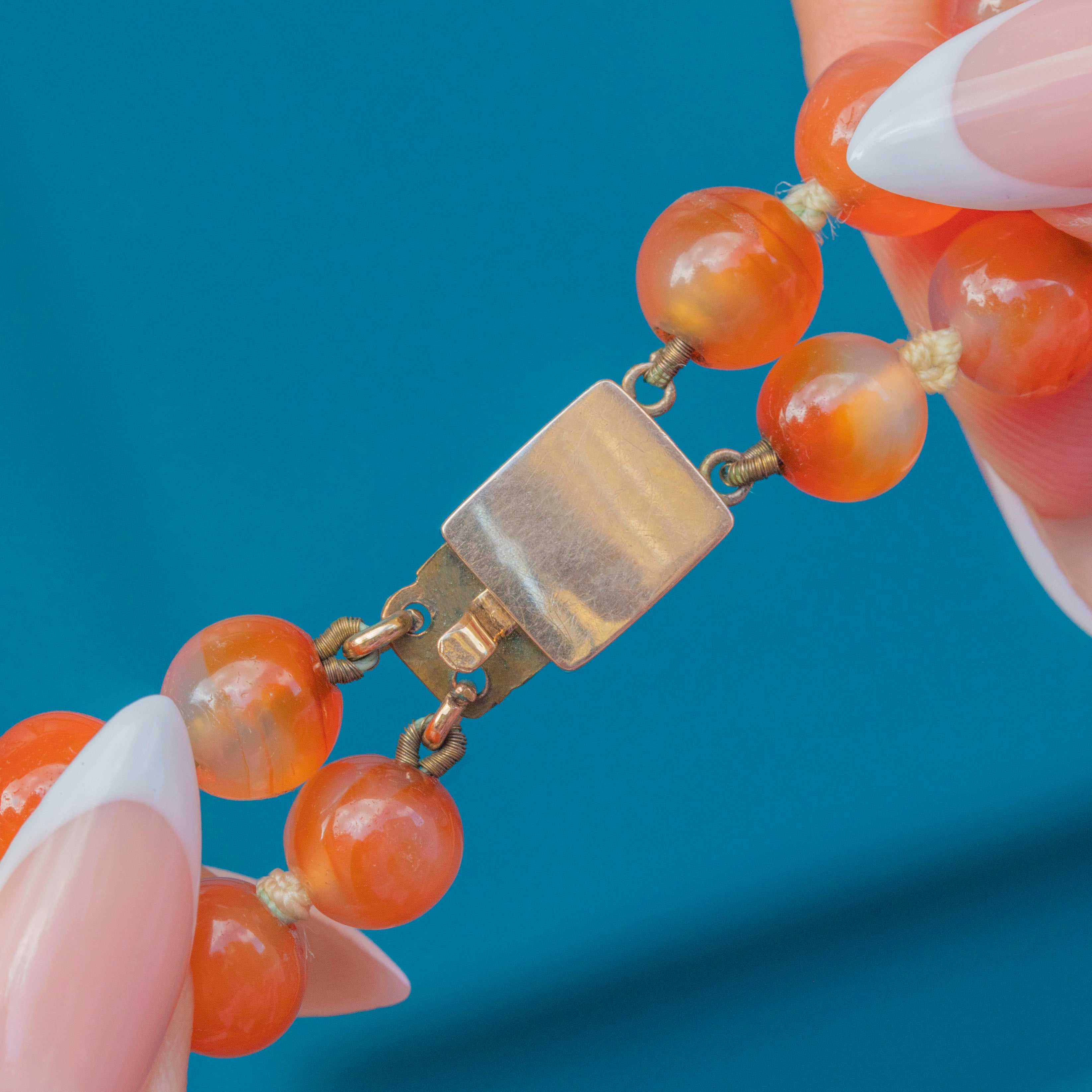 EXCELLENT: This necklace is in remarkable condition for its age. The Carnelian beads are smooth and free from chips, maintaining a vivid and consistent colour. The clasp is secure and in full working order, making the necklace ready to wear and enjoy.
