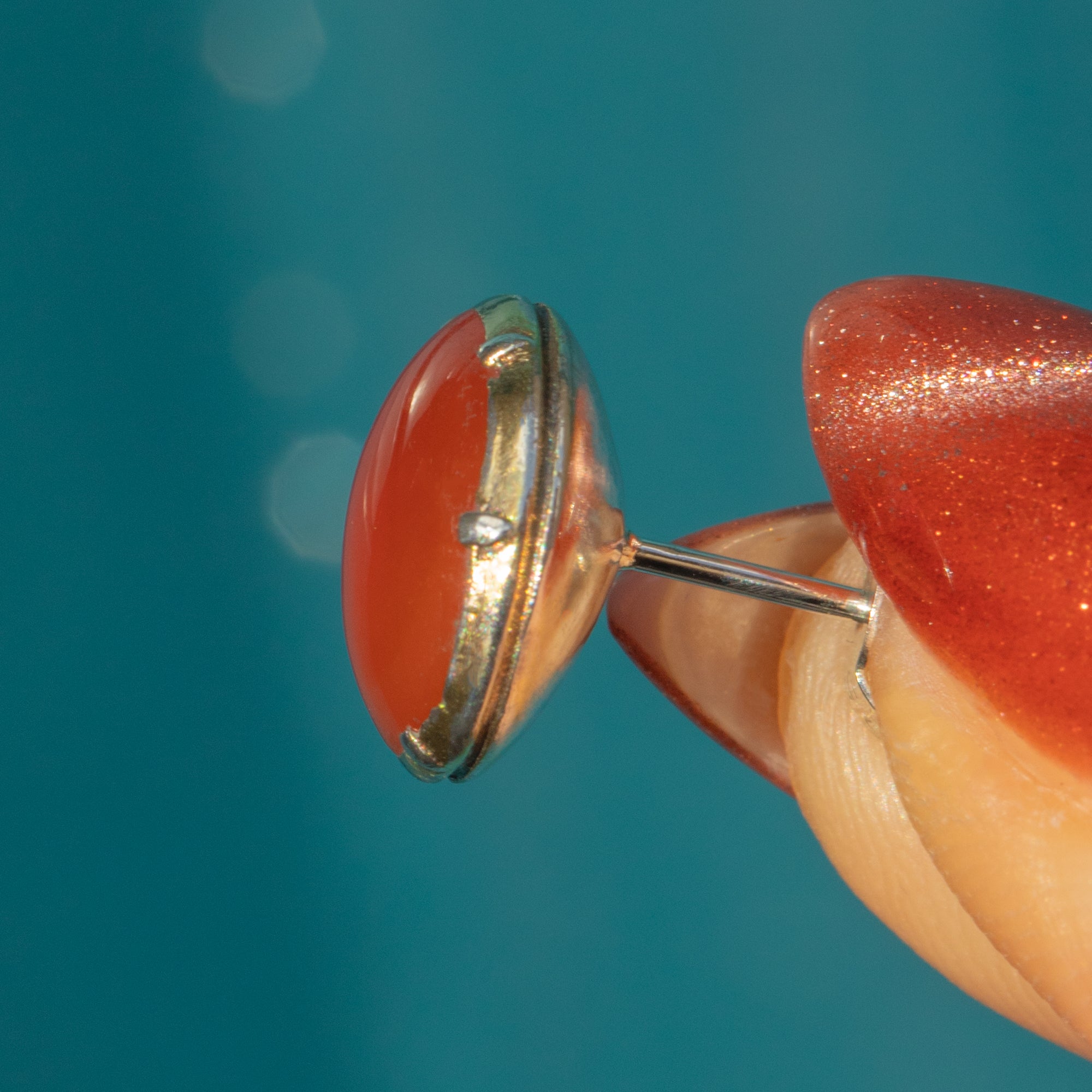 VERY GOOD. These Georgian Carnelian oval stud earrings are in very good condition. The Carnelian cabochons are perfectly smooth with no chips or scuffs. Once gilded bright yellow, the Silver is now a slightly burnished champagne toned commensurate with age, but they hold the pretty burnt sienna Carnelians securely in place. The newly added (not by us!) butterfly backs are snug-fitting allowing you to wear these antique Carnelian studs with absolute confidence!