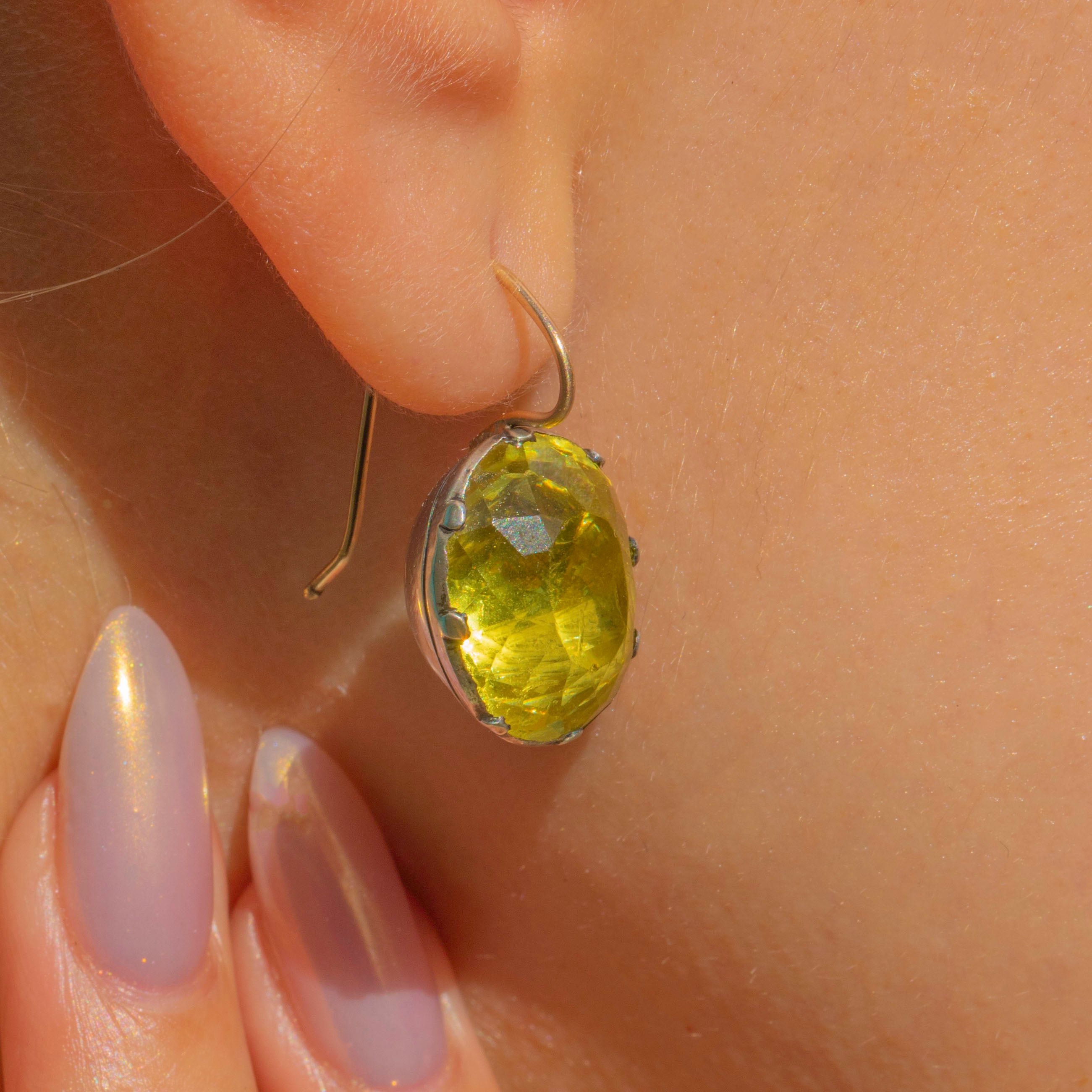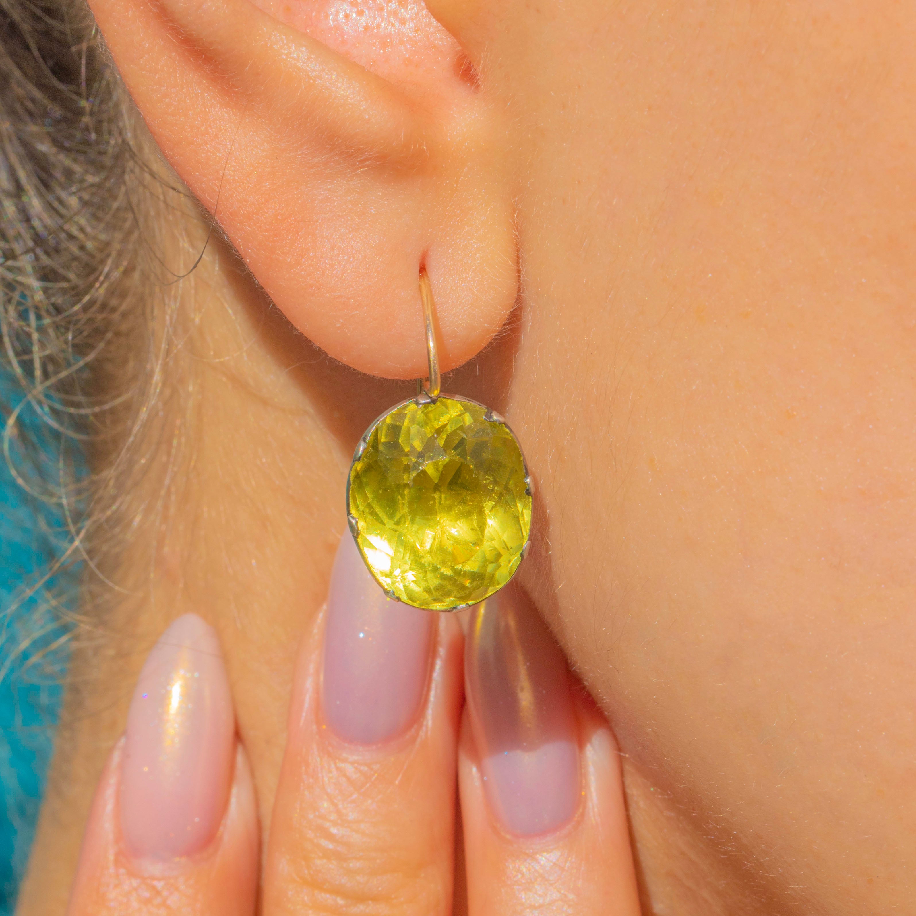 Add a striking touch to your collection with these rare Georgian Chartreuse green Paste button earrings! Each earring boasts a radiant foiled Paste stone, shimmering with vivid green tones and crisp, light-catching facets that beautifully mimic the look of Chrysoberyl.