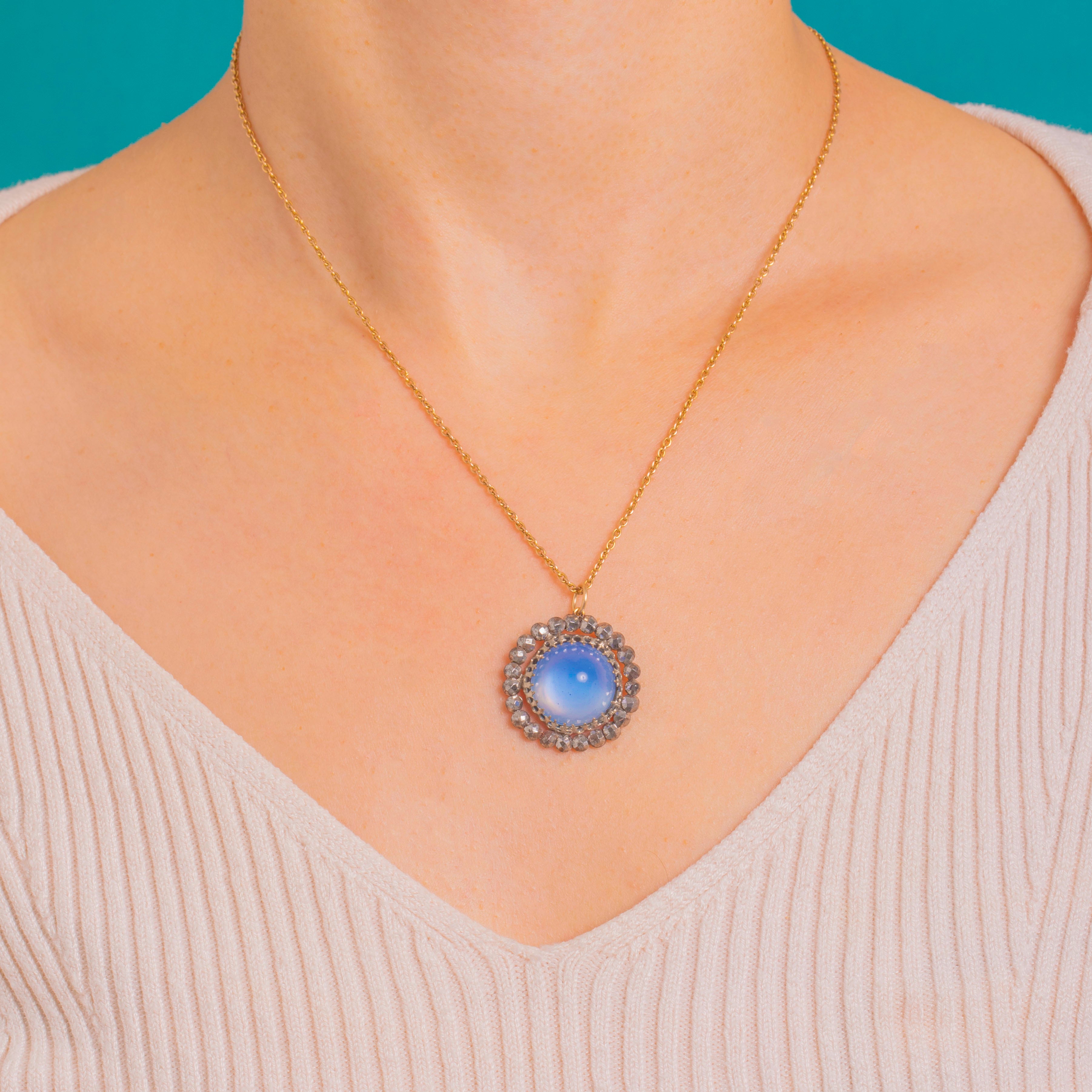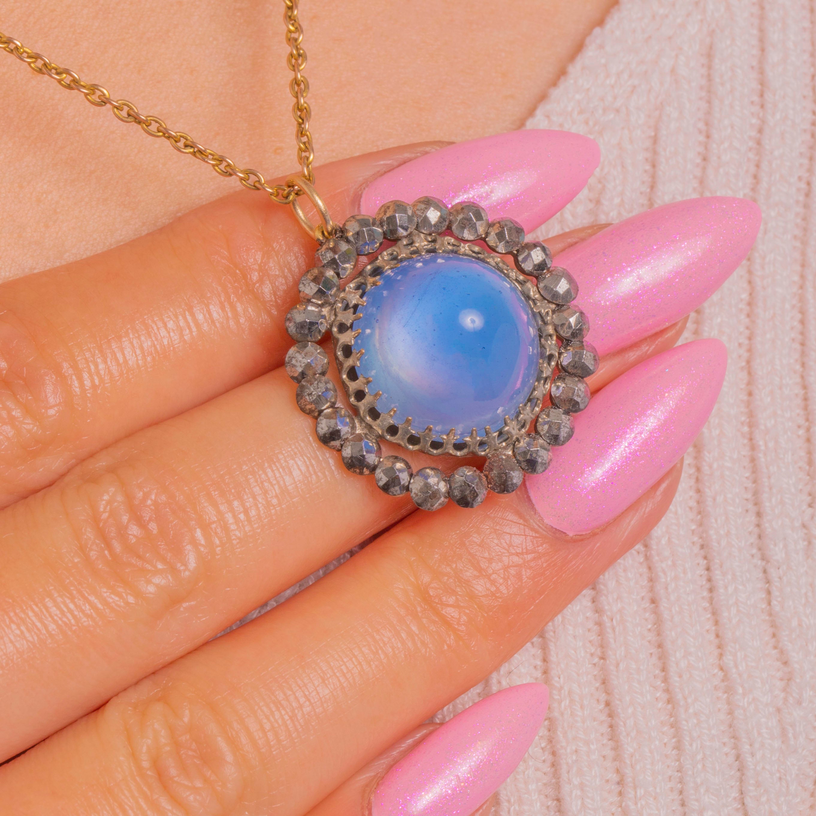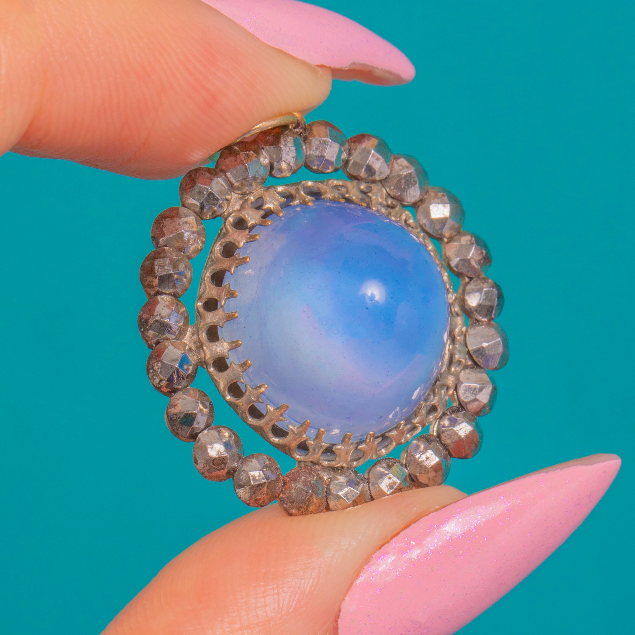 A beautiful marriage of Georgian craftsmanship and later Art Deco charm, this pendant pairs the starry glint of Cut Steel with the serene glow of Blue Chalcedony. Dating to c.1800, the finely faceted Cut Steel forms a delicate rosette that catches the light exquisitely, framing a high-domed sugarloaf cabochon at the heart.