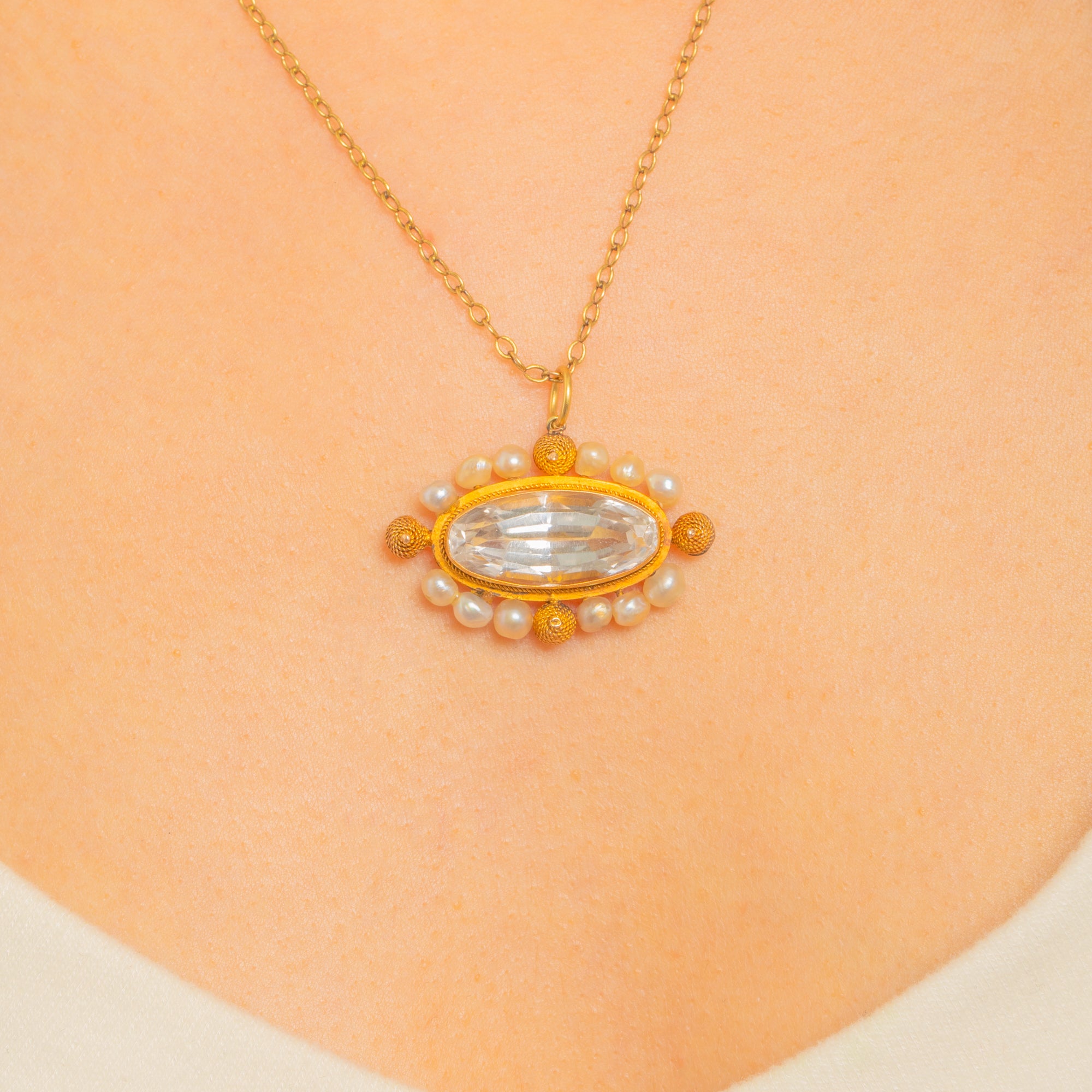 A luminous Georgian cannetille pendant crafted in rich 18ct Gold, centred by a clear oval Rock Crystal in a raised bezel, embraced by a halo of natural Pearls. The delicate rope‑twist edging and applied granulated wirework create an ornate, lace‑like frame that glows against the warm Gold.