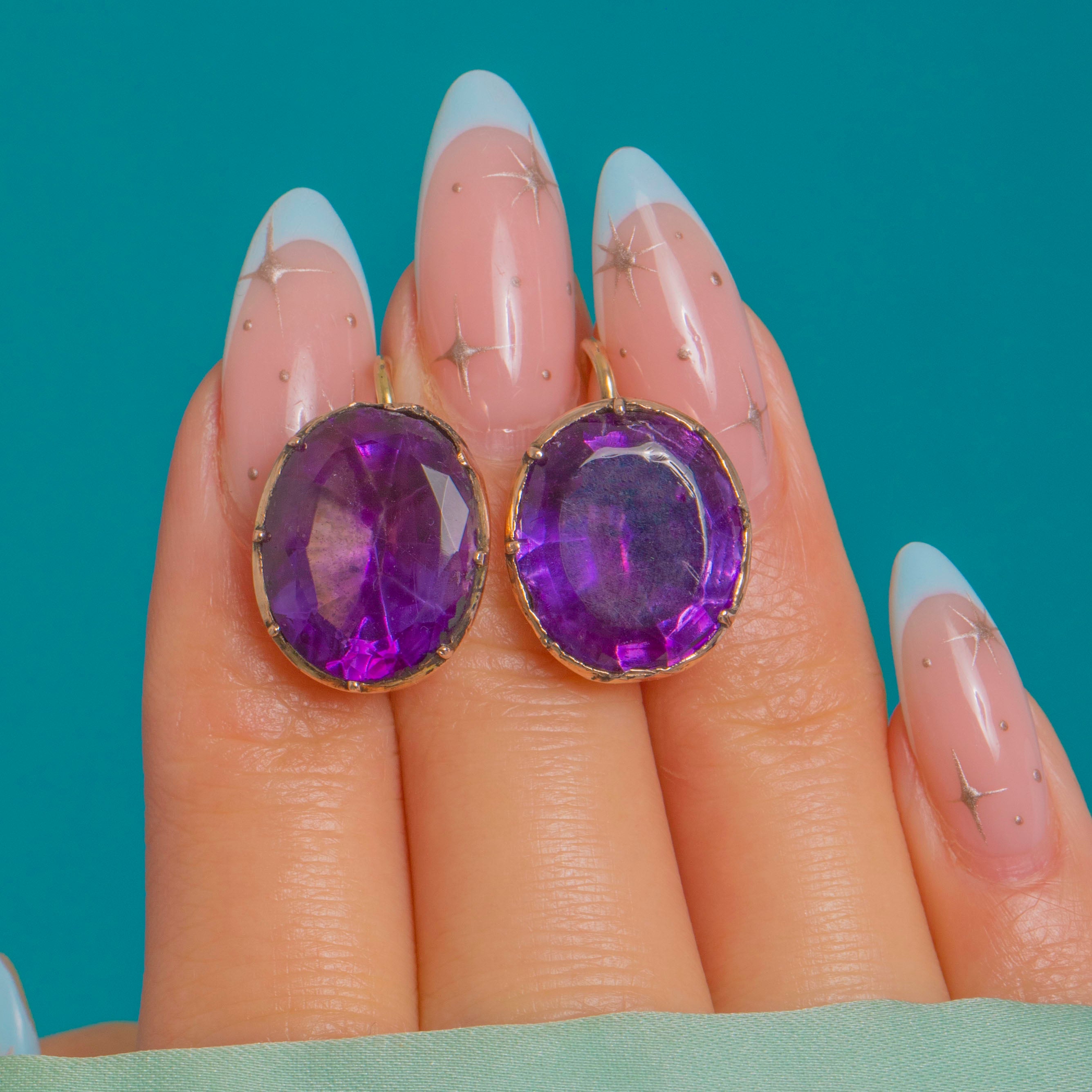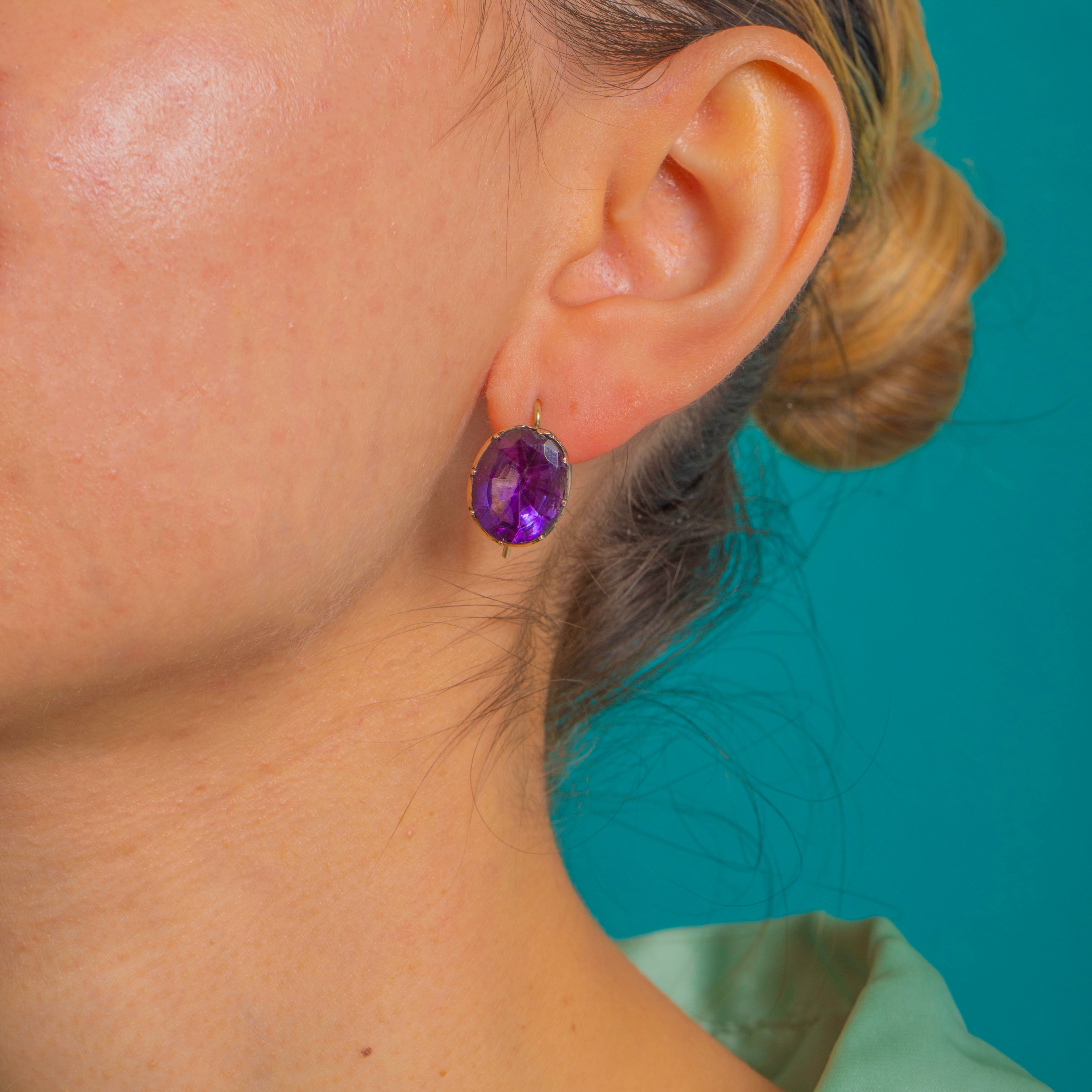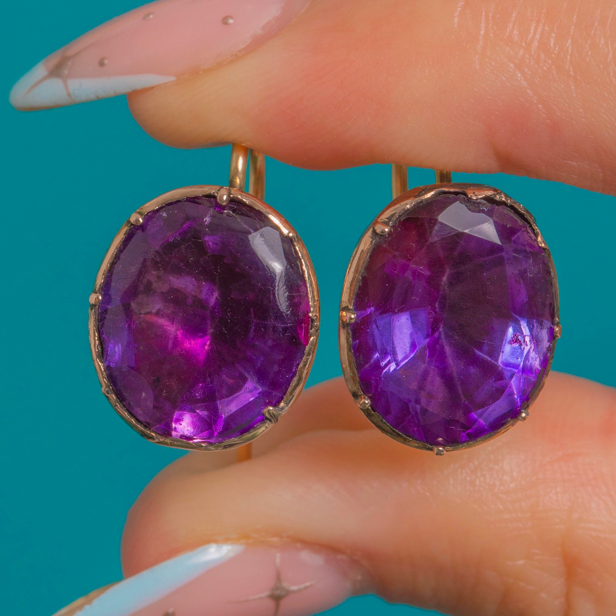Saturated royal-purple glow meets early 19th-century craft in these Georgian foiled Purple Paste drop earrings. Each richly coloured oval is hand-faceted and secured in deep cut-down, piecrust collets for a bold, gem-forward silhouette that feels elegant and timeless.