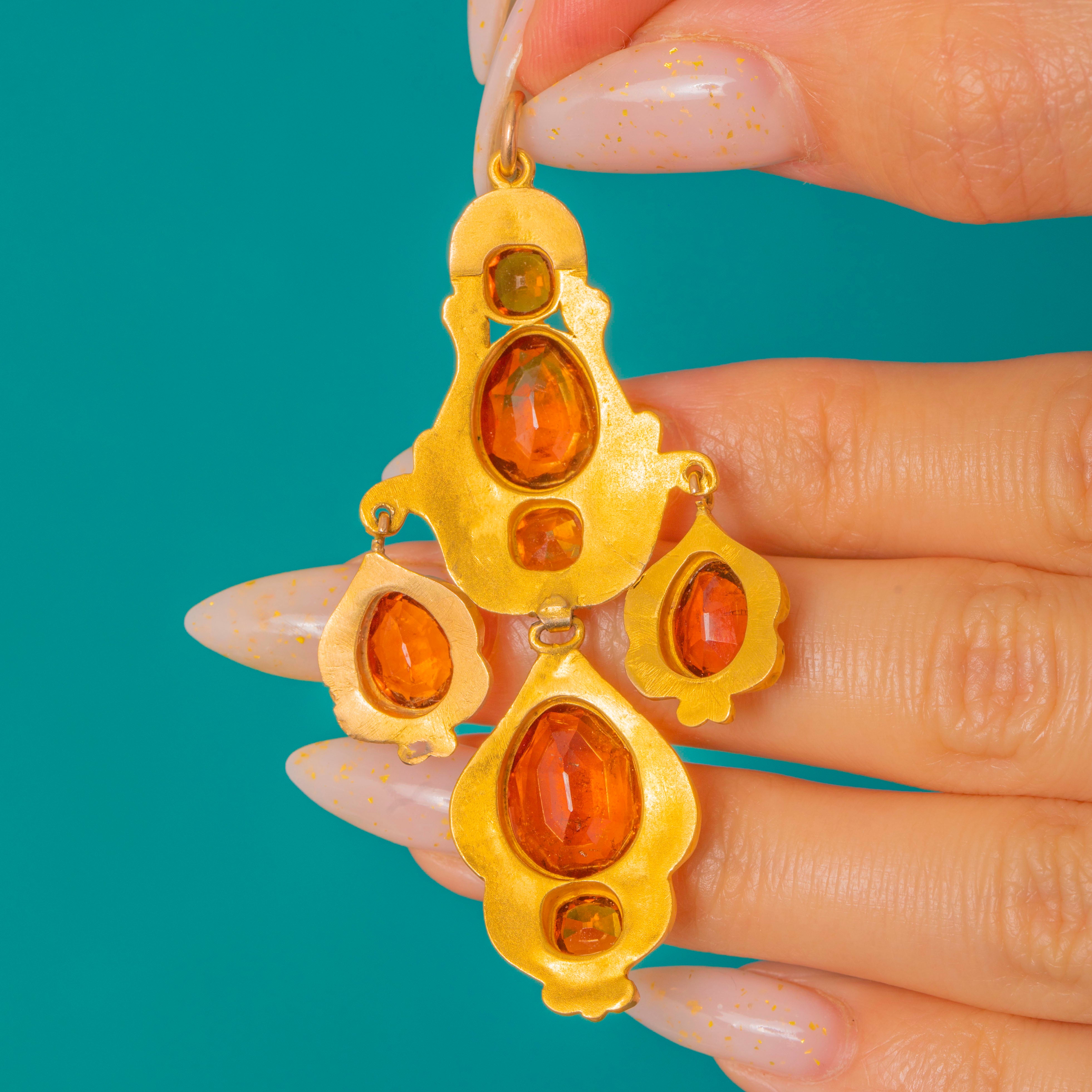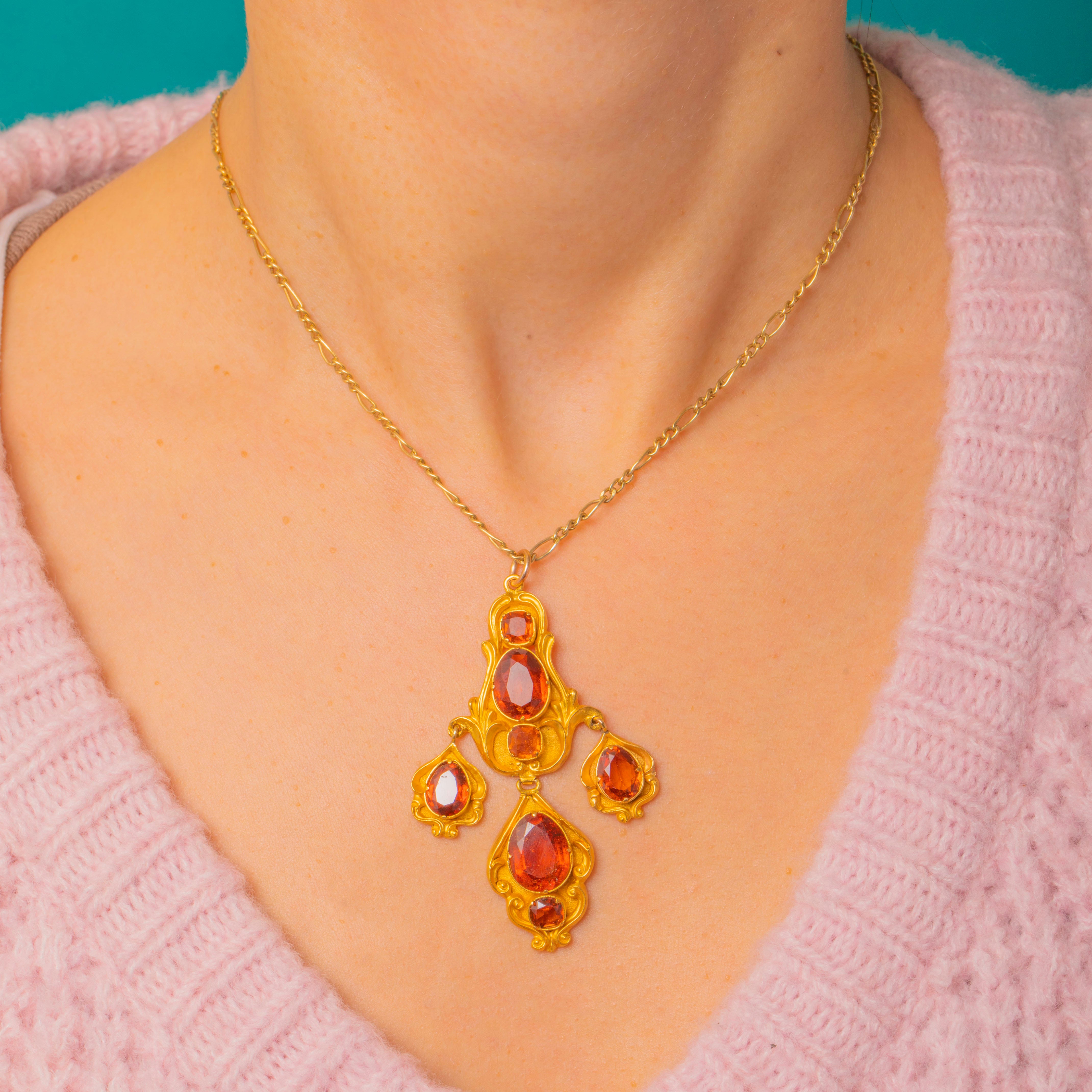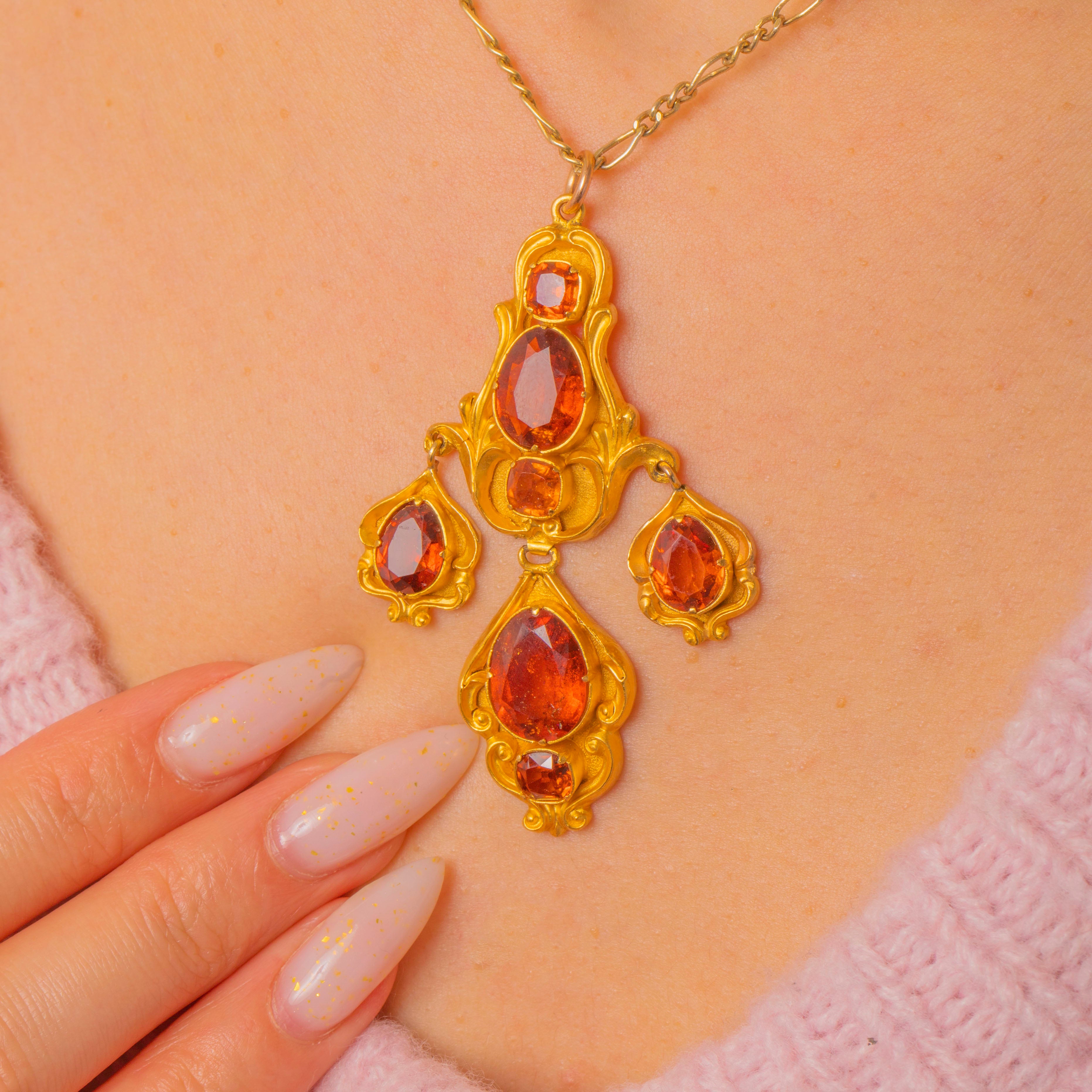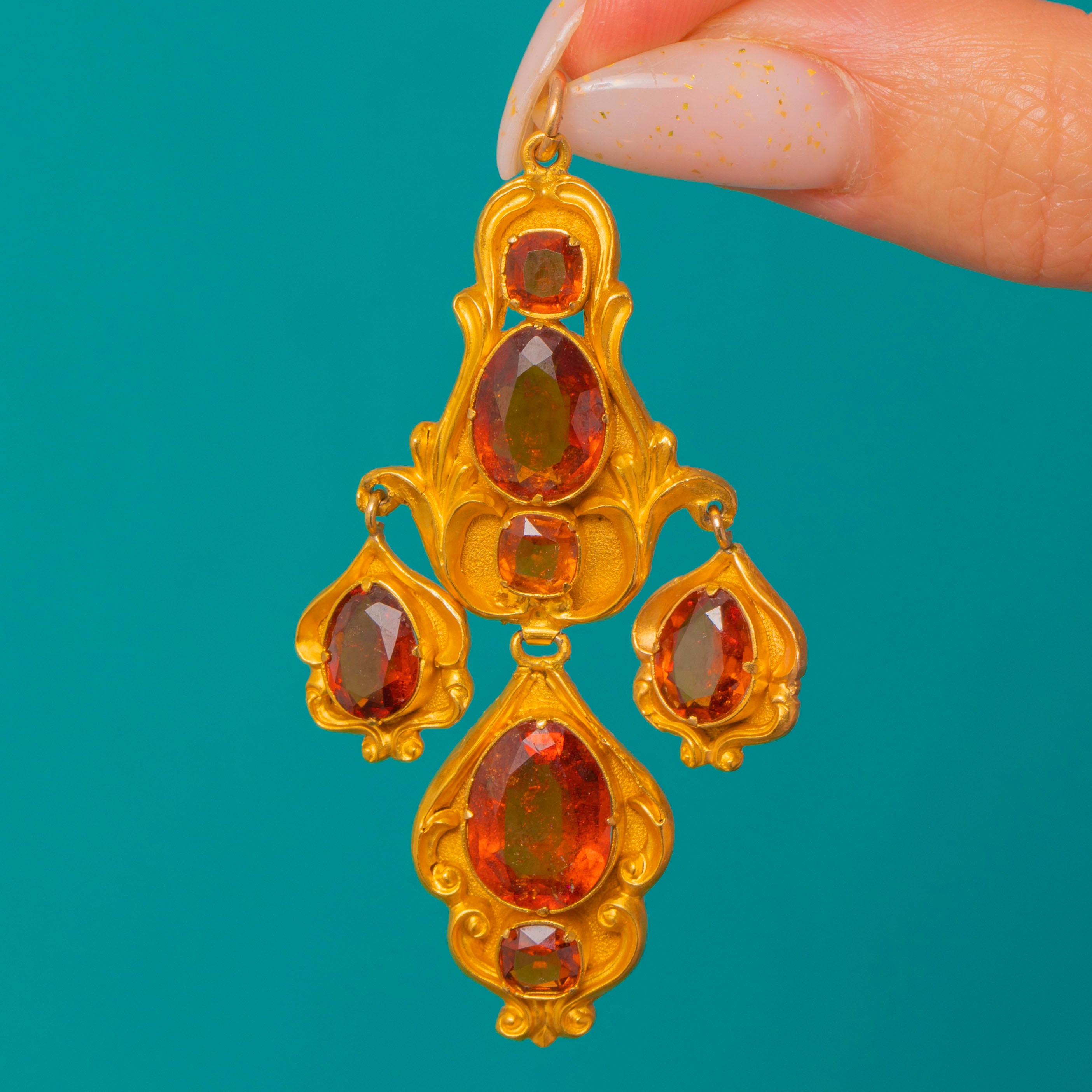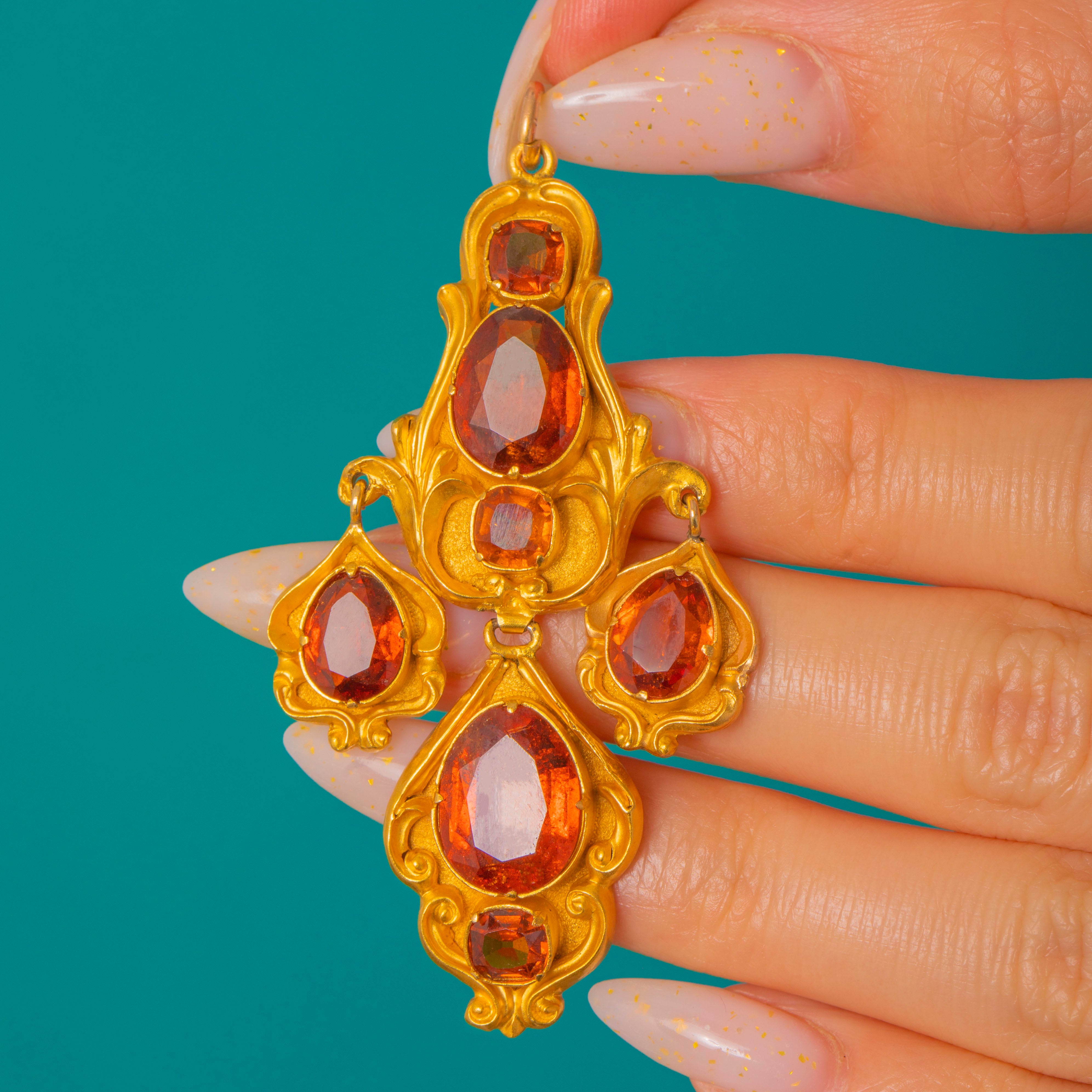 A French 18ct Gold Hessonite Garnet pendant in a graceful, articulated girandole composition. Warm, deep-orange hessonite Garnets are set in cast, chased cartouche surrounds with scrolling foliate detail, graduating to three pendant drops for movement and spectacle.