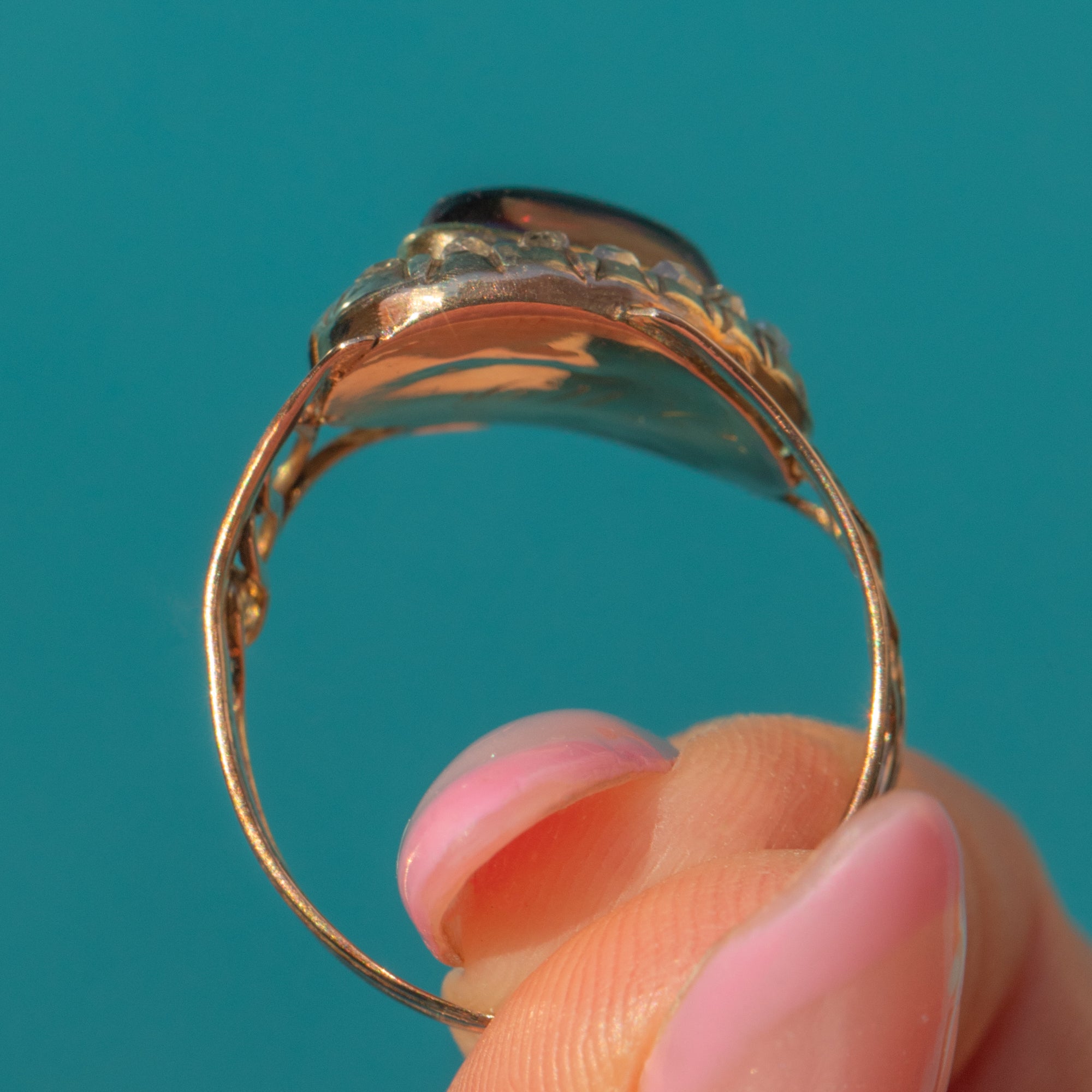 An elegant Georgian ring featuring a deep wine-red cabochon Garnet framed by a halo of twinkling Rose Cut Diamonds, all set in warm 9ct Gold. Timeless and romantic, the low profile makes it comfortable for everyday wear while the antique sparkle adds effortless charm.