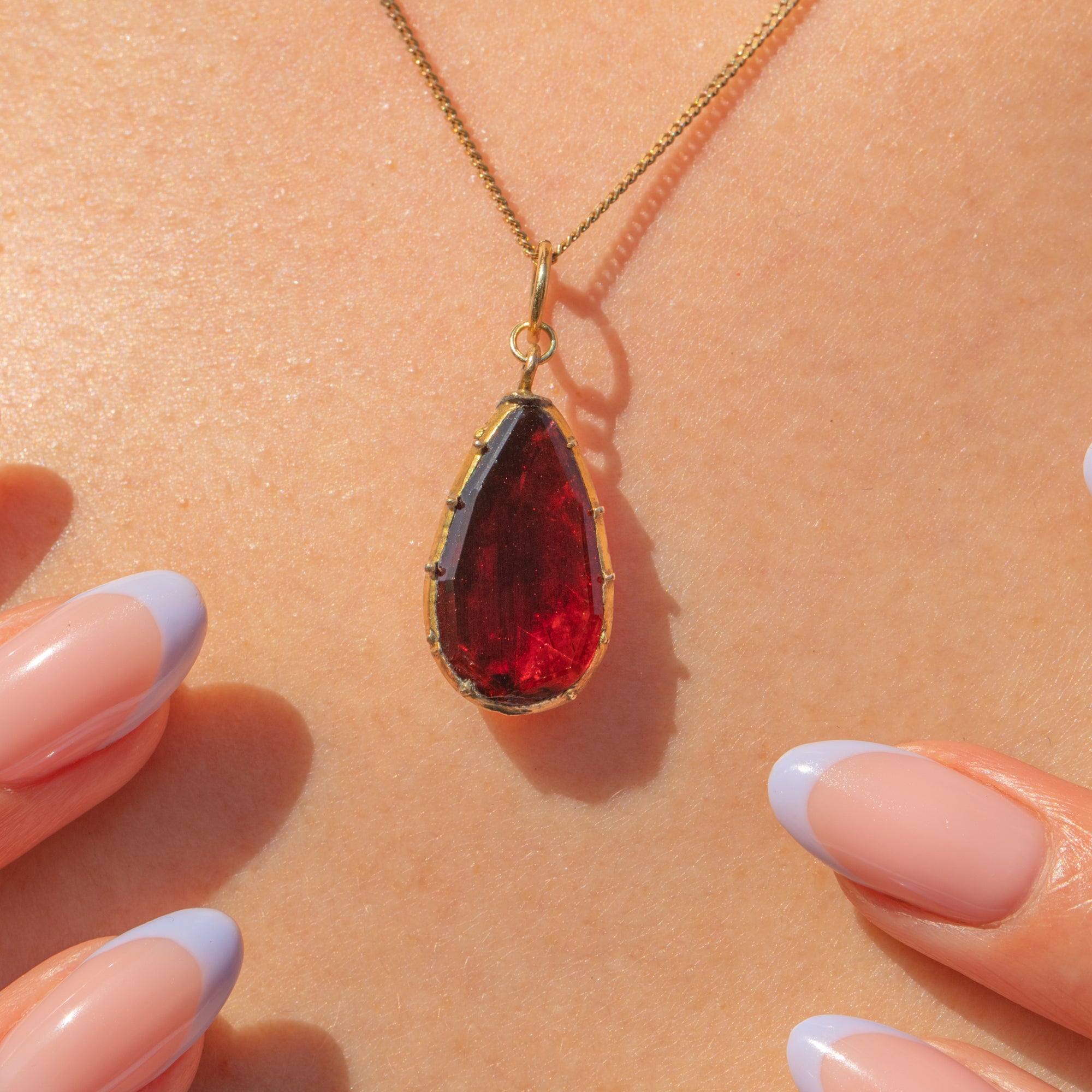 This Georgian Garnet Paste pear pendant is a tasty little treat! The flat-cut Garnet Paste has a gorgeous burgundy hue, revealing seductive flashes of crimson as its foiled backing catches the light.