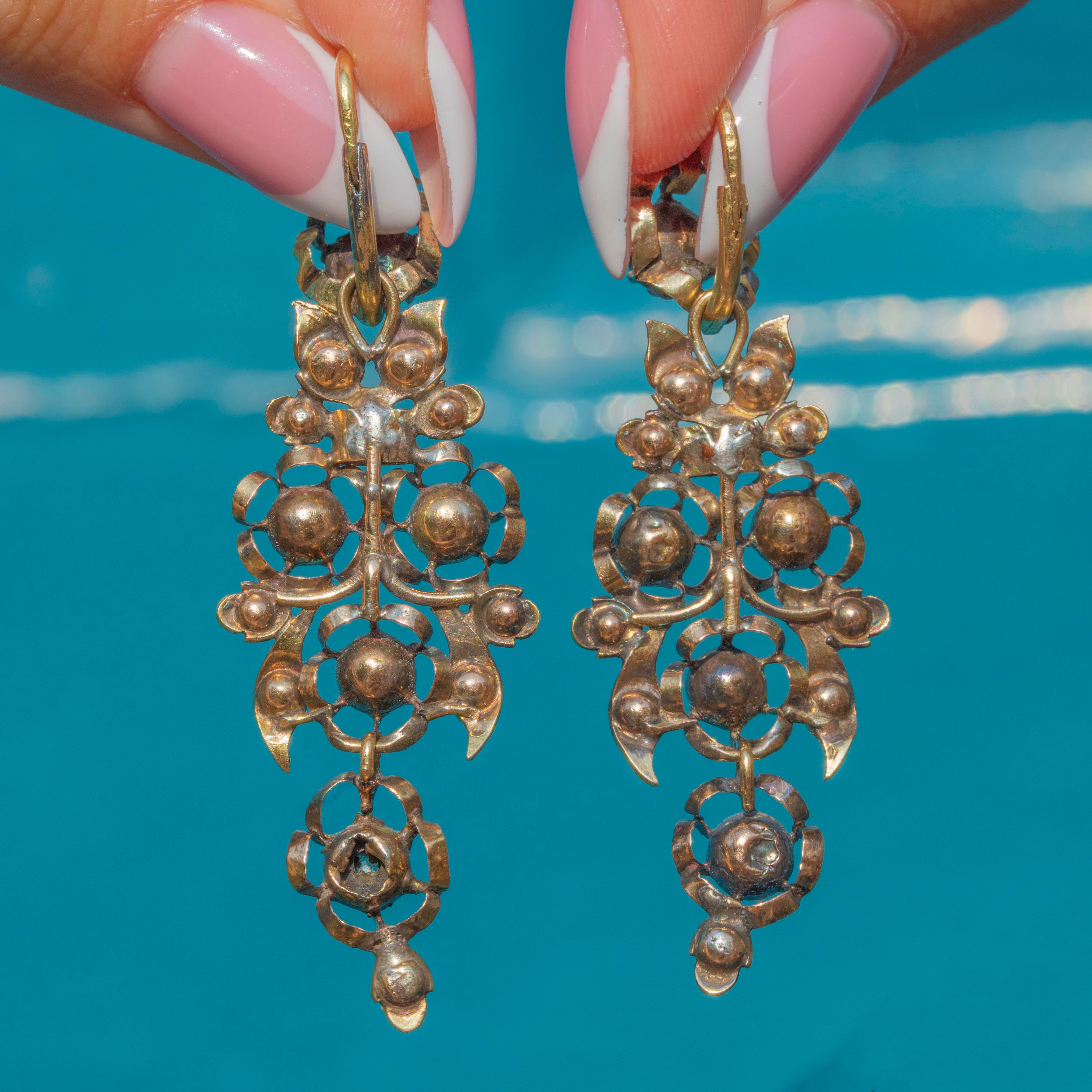 Likely of Catalan or Spanish provenance, these drop earrings are intricately decorated with floral motifs and ornate details, providing a rich texture and depth. The detachable day & night design allows the wearer to transform the earrings from a sophisticated daytime style to a more glamorous evening look, making them a versatile addition to any jewellery collection!