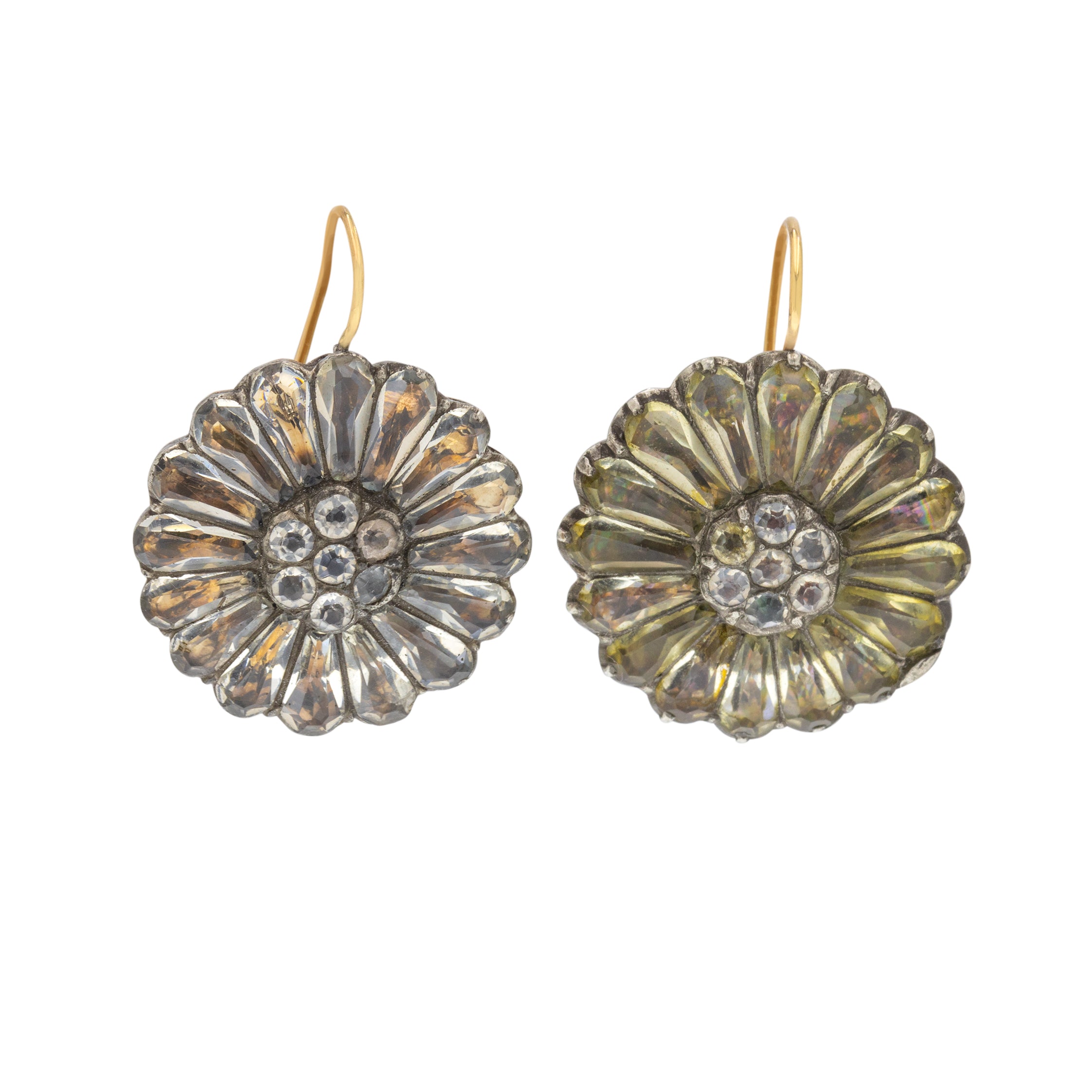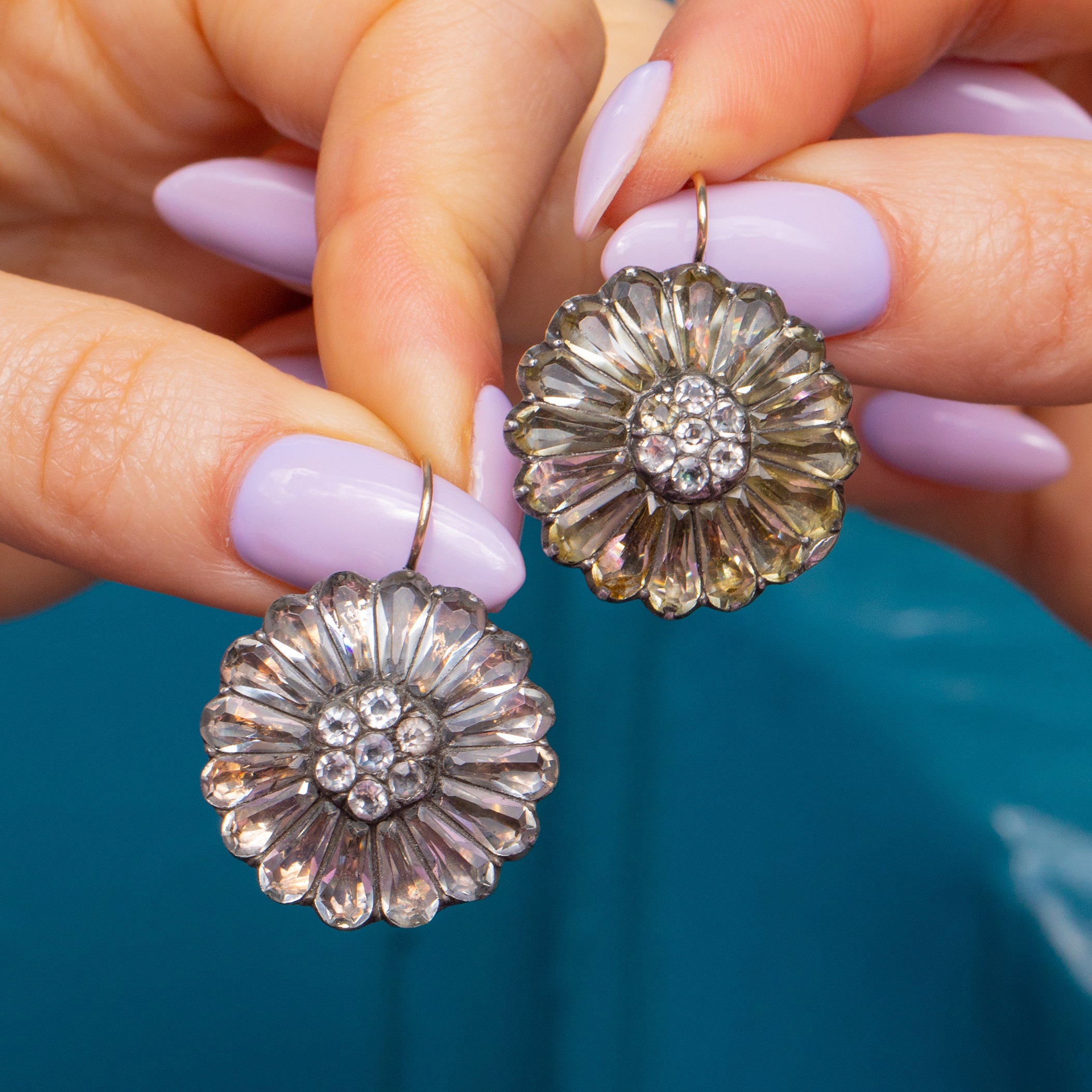 Once these Georgian Paste flower earrings are in your possession you will become the belle of the ball! Their sunflower forms are inlaid with perfectly cut Paste gems creating a disco ball display of sparkle, perfect for accompanying any evening attire.