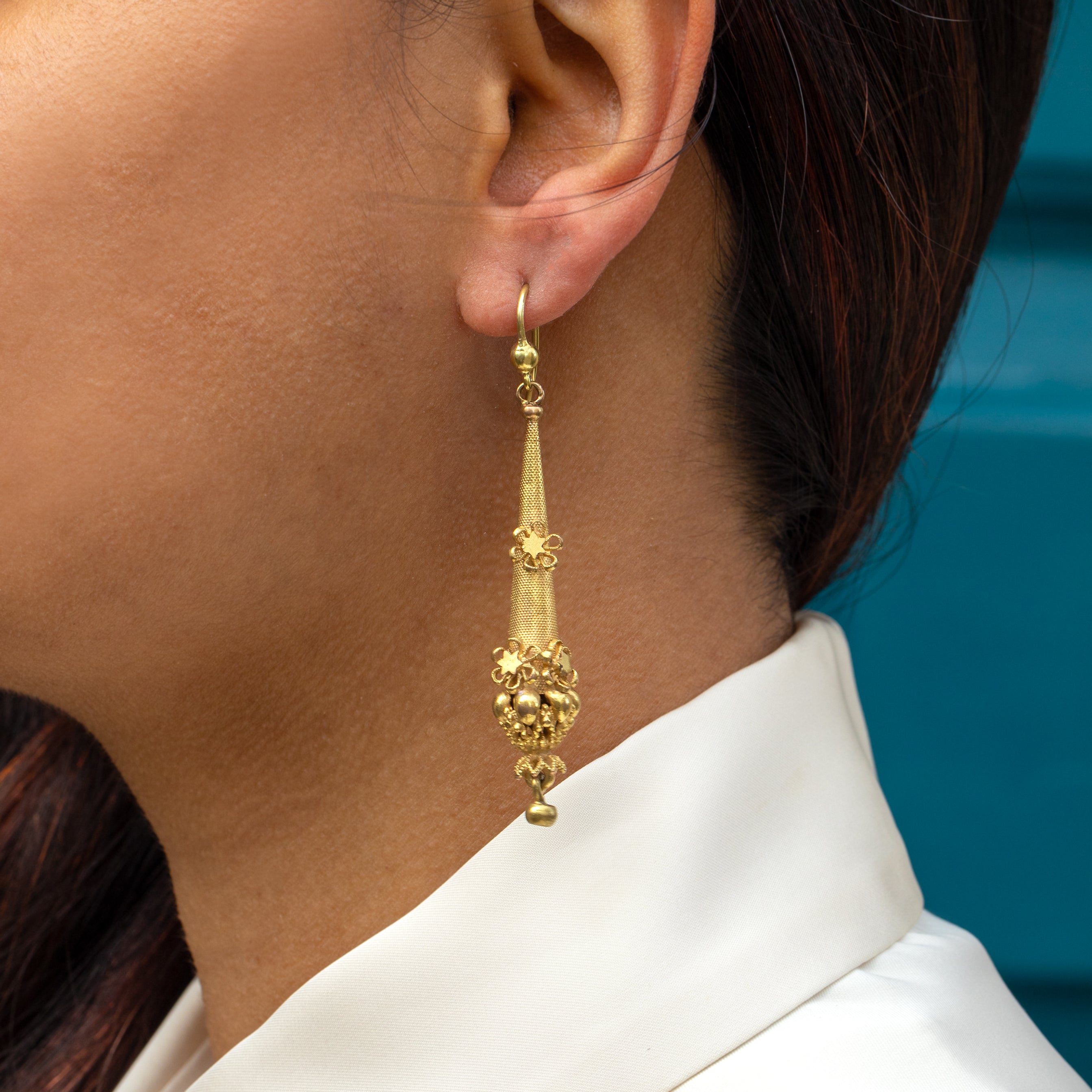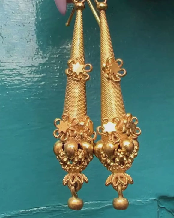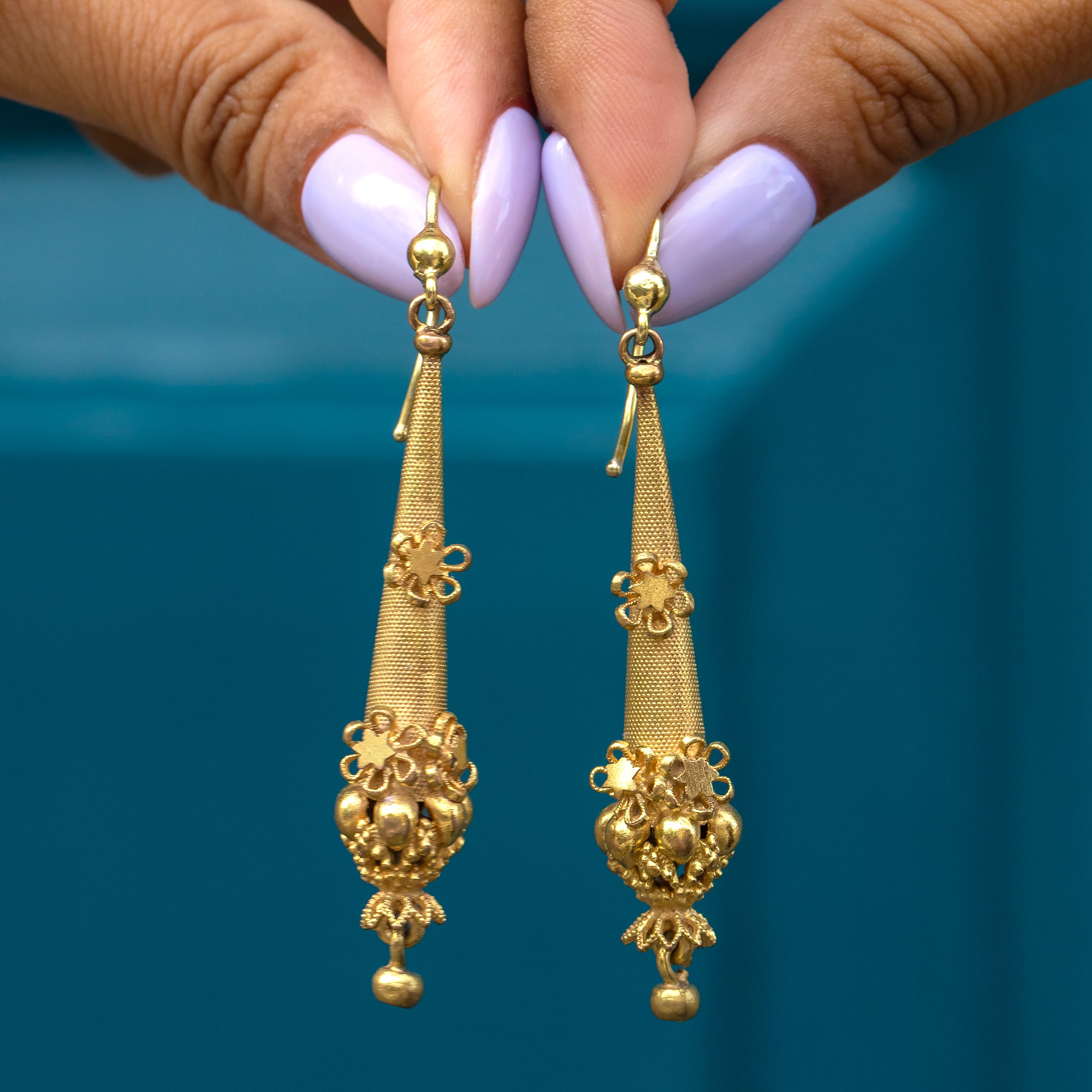 We are swooning over these Georgian Pinchbeck long drop earrings; would you believe that these lovely ladies are over 200 years old?! Featuring a 65.5mm long drop, they elegantly hang just below the jawline, beautifully framing the face. The Georgian Pinchbeck boasts an array of textures and shapes, adorned with charming floral motifs that give this pair a whimsical feel.