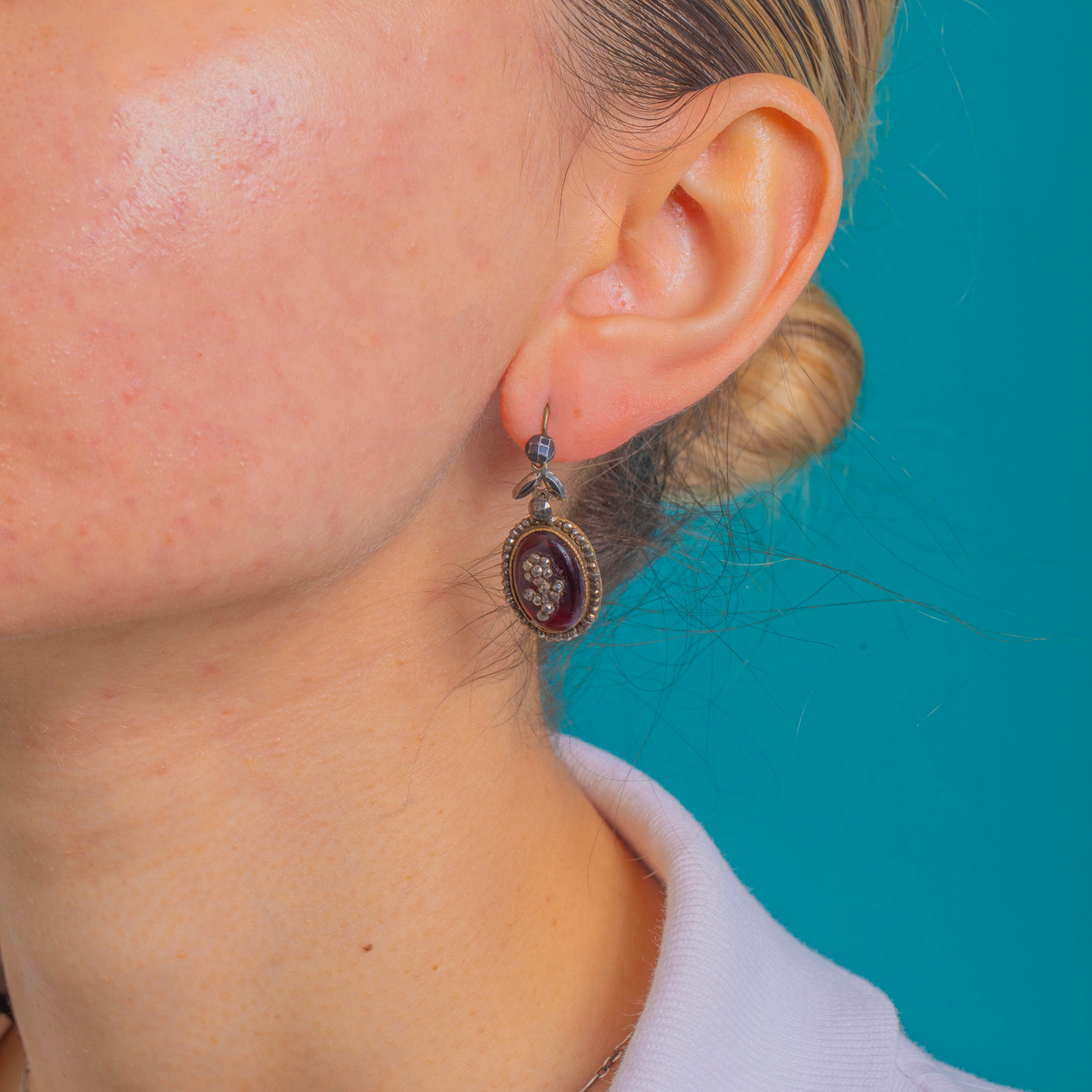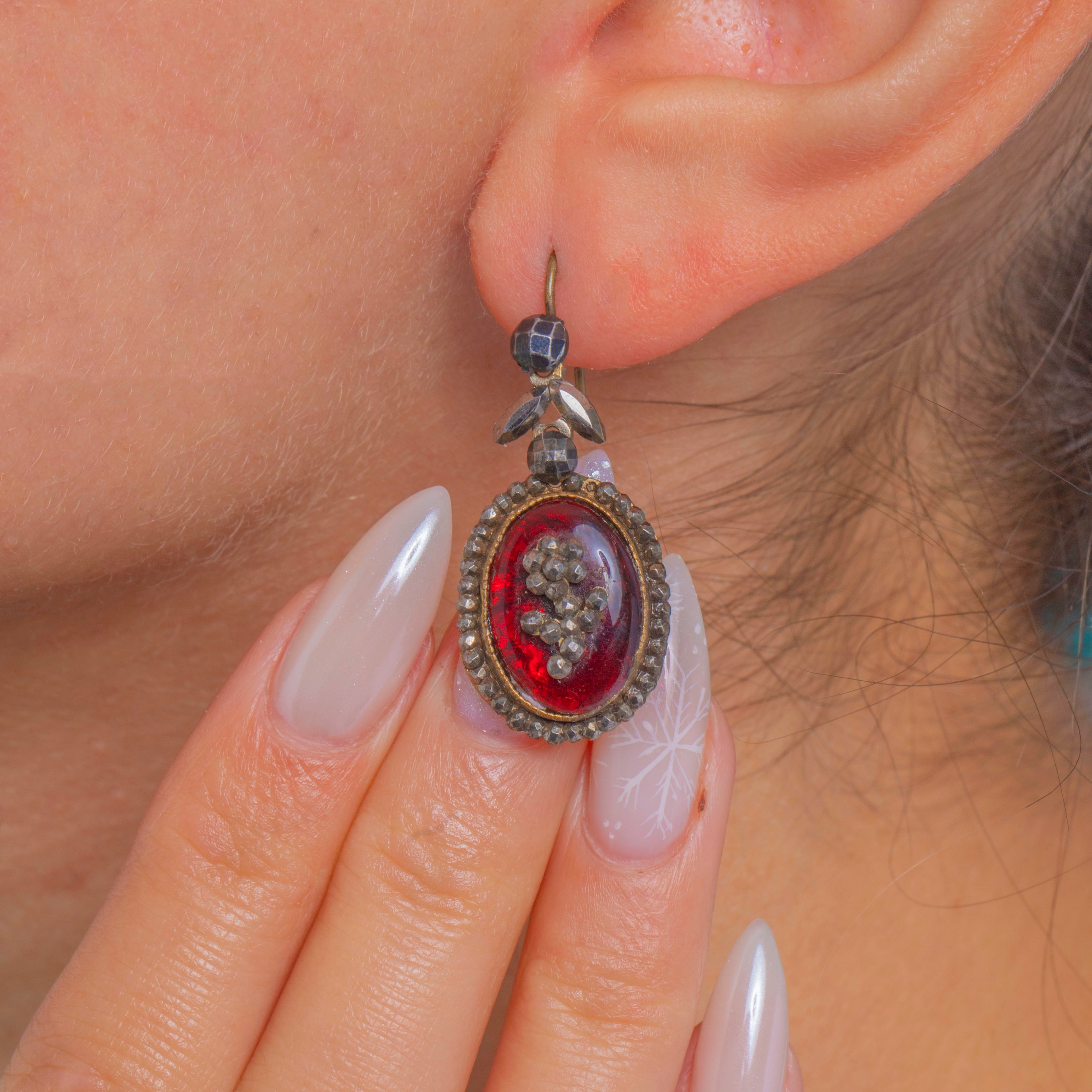 A beautifully aged mixed-metal palette and even patina speak to their period charm. Beneath the domed centers a small grey faceted cluster is visible, adding depth to the rich red. The reverse is finished with Mother of Pearl rears, and simple shepherd-hook fittings complete this romantic, ornate design.