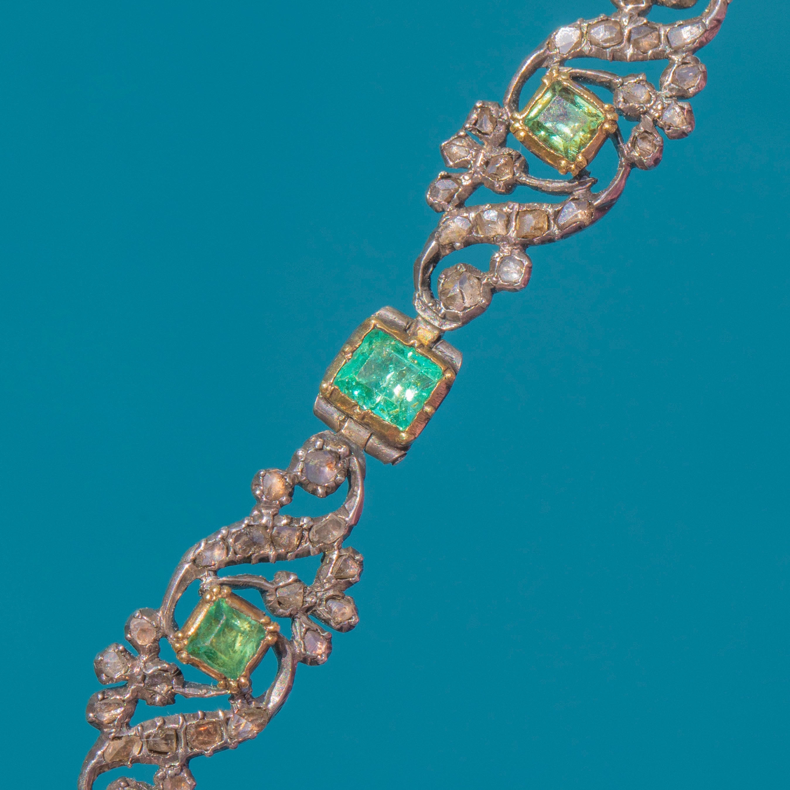 MATERIALS: Tests as Silver, 9ct Gold clasp & settings, Emeralds (1.30ct), Rose-cut Diamonds.