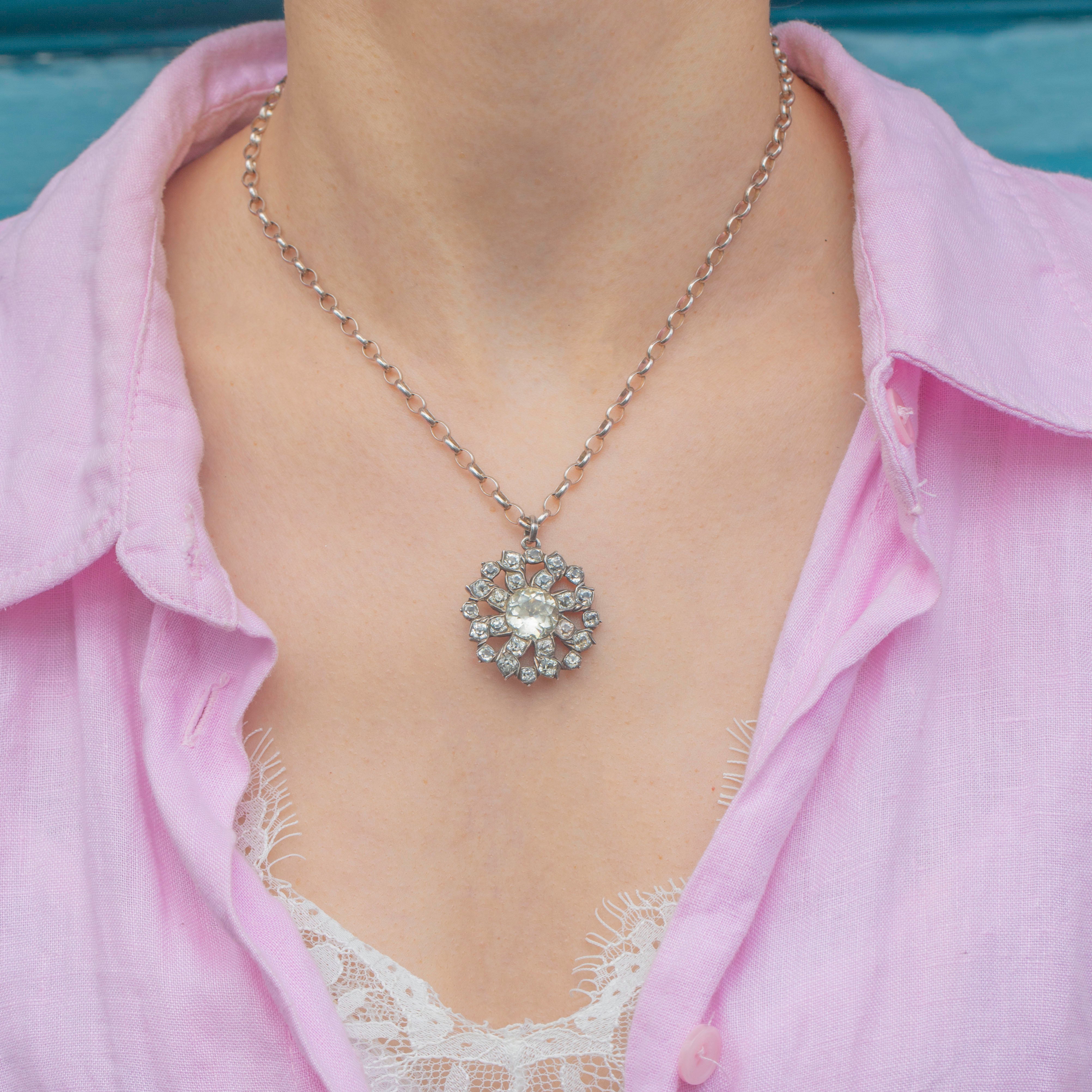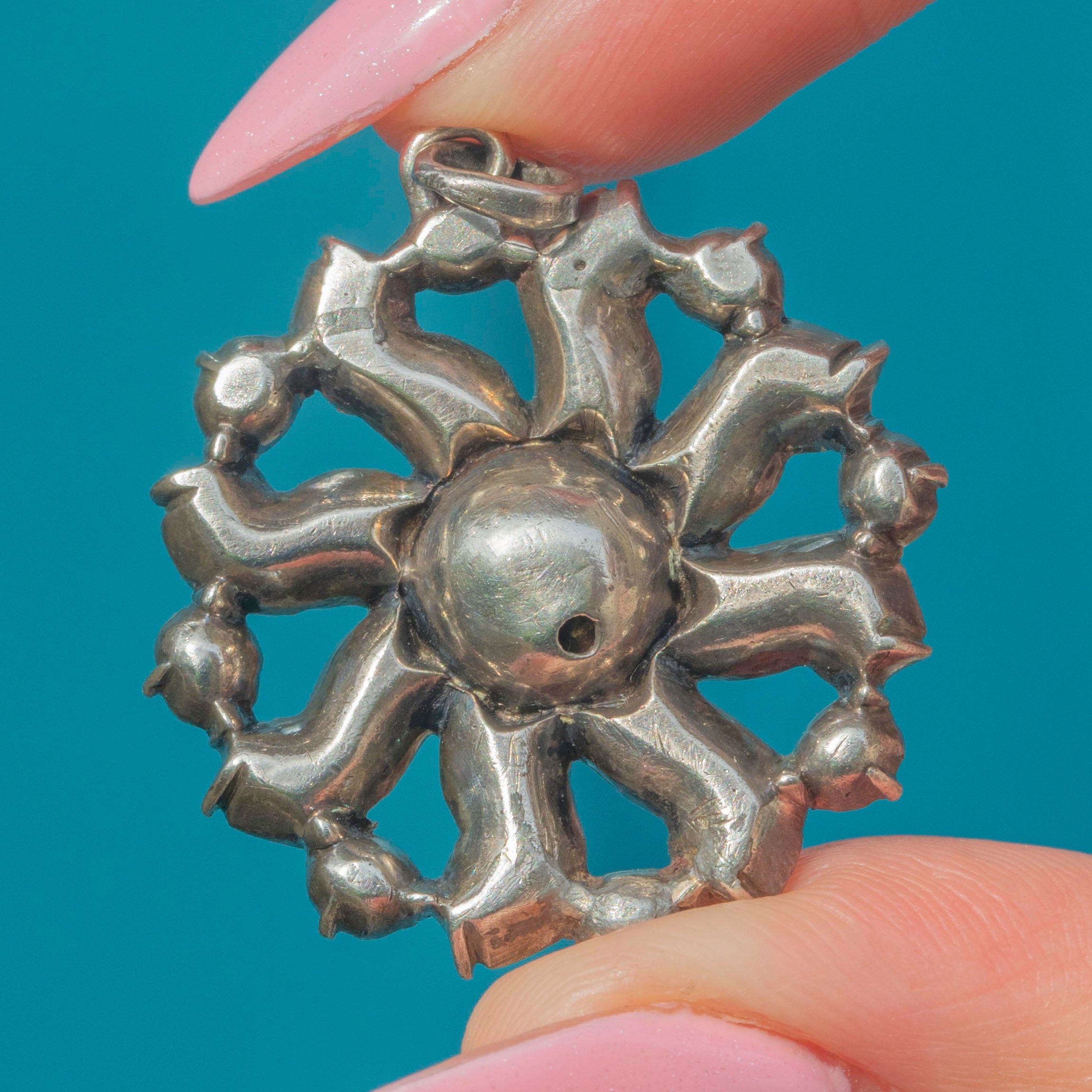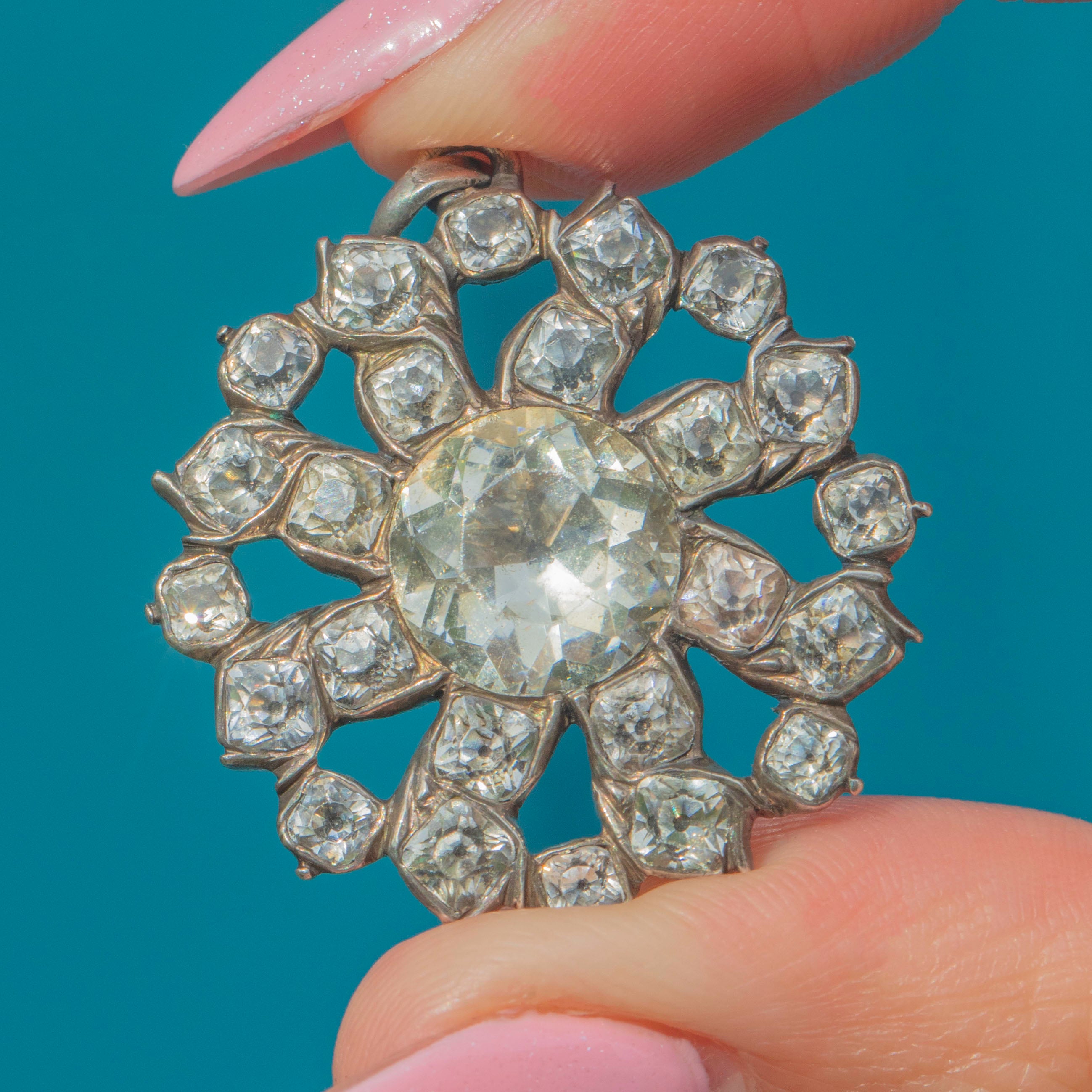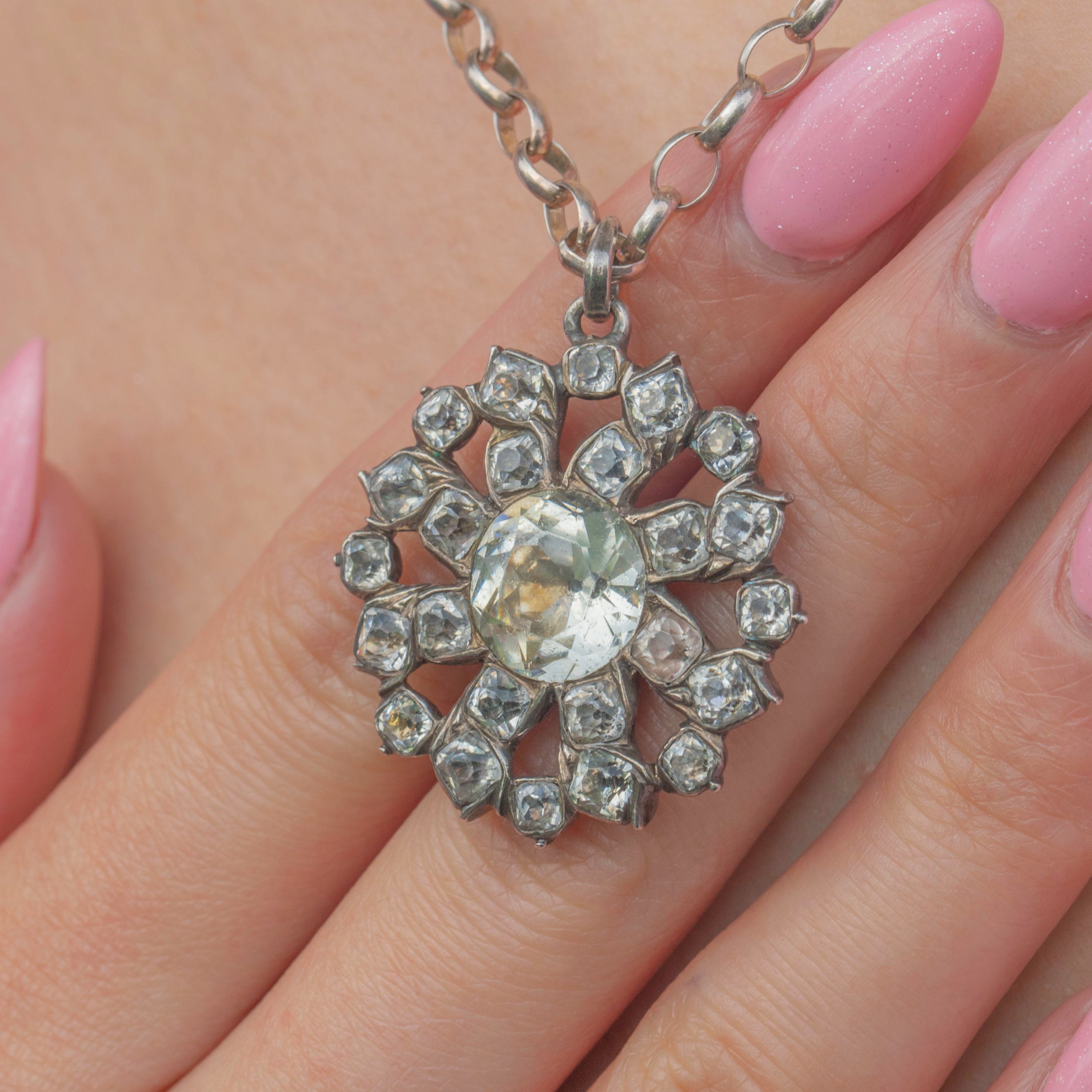 VERY GOOD: This Georgian Silver Black Dot Paste cluster pendant is in very good condition. The Paste have been wonderfully preserved, with their crisp facets and bright foils free from surface wear. The Silver shows some wear, commensurate with age, but this is mostly on the back so won't be visible while the pendant is worn. The Silver has accrued an admirable patina, adding to the pendant's antique charm. This piece is a true Georgian treasure and will make a standout addition to your collection!